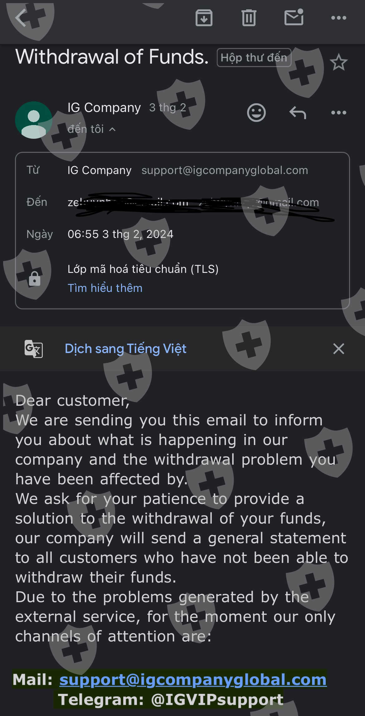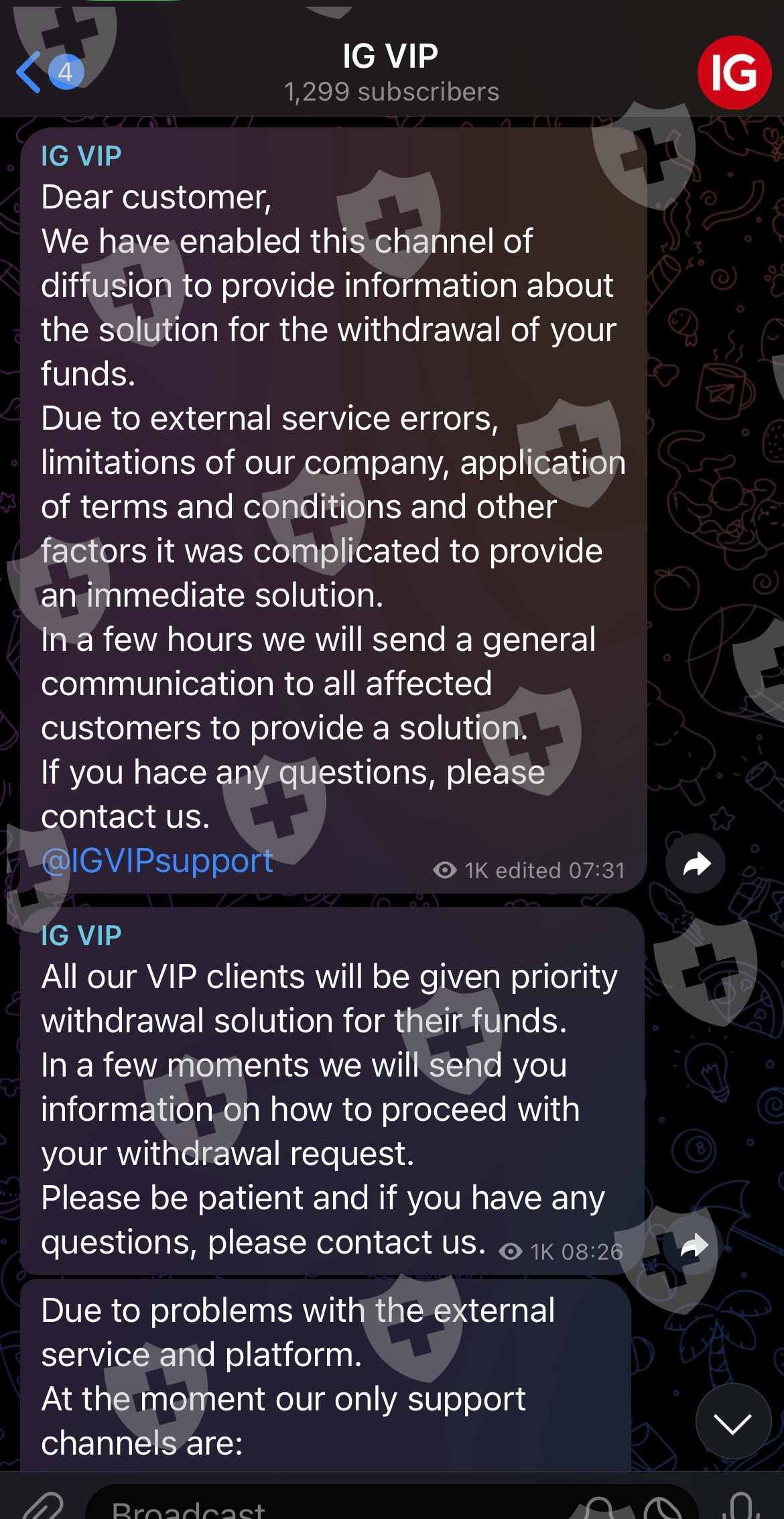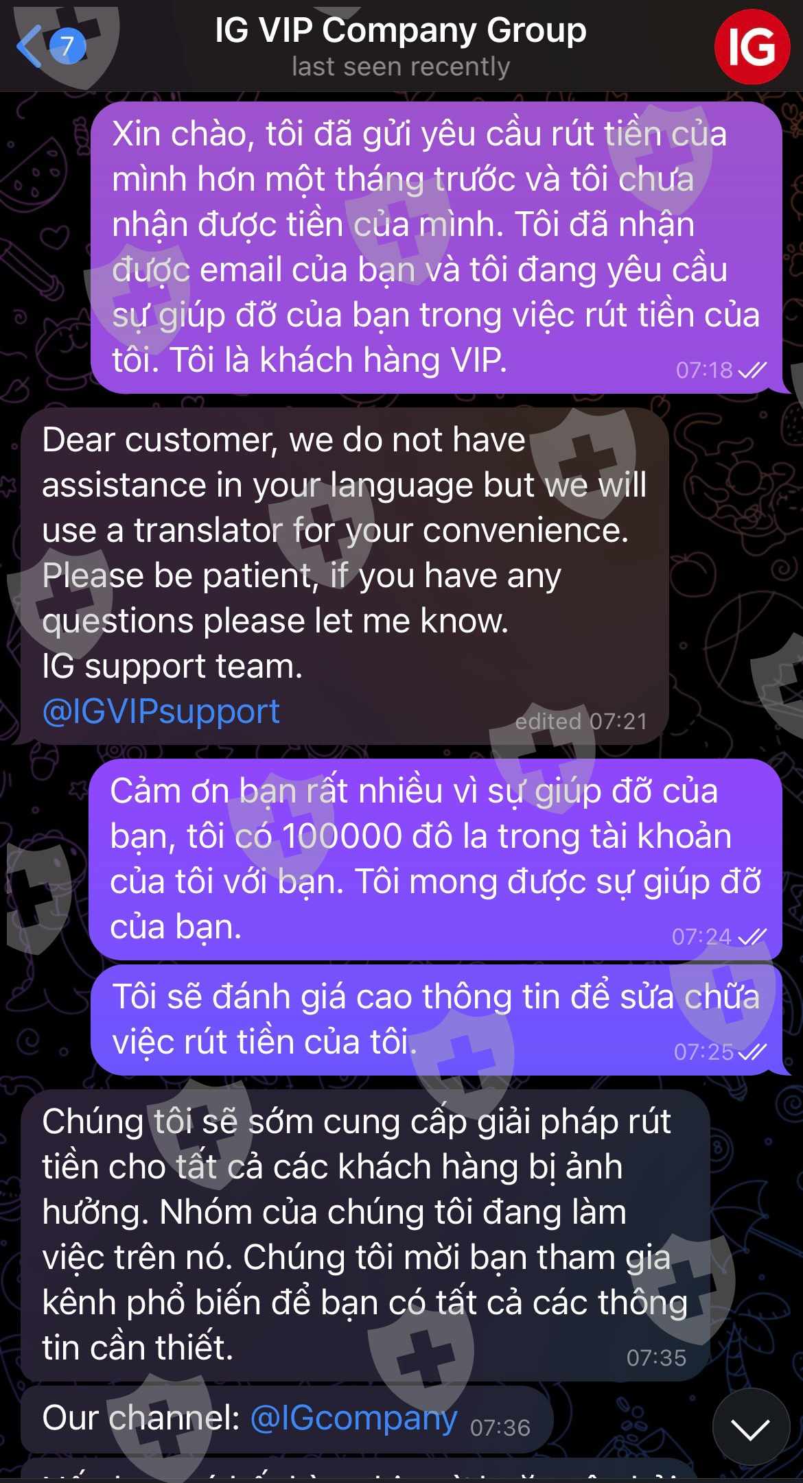 Tôi đã yêu cầu rút tiền từ nền tảng IG VIP và tôi vẫn chưa nhận được tiền mặc dù tôi là vip. Sau khi khiếu nại, họ đã gửi cho tôi một email giải thích rằng họ sẽ giải quyết việc rút tiền và họ đã gặp sự cố trên nền tảng của họ, họ yêu cầu tôi đợi vì họ sẽ gửi thông báo cho tất cả khách hàng không thể rút tiền của họ.