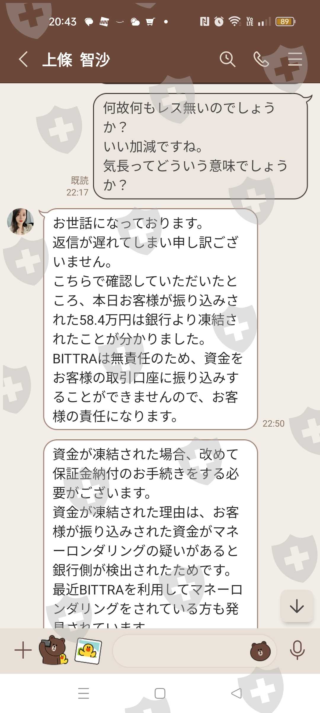 2/2の朝10時半頃、私がFXの増資(58.4万円)をしようとしてBITTRAのサポート担当者上條氏に口座を紹介してもらったところ、振込先が外国人だったので私が拒否しましたが、100万円未満の金額では外国人口座しか紹介不可との連絡。