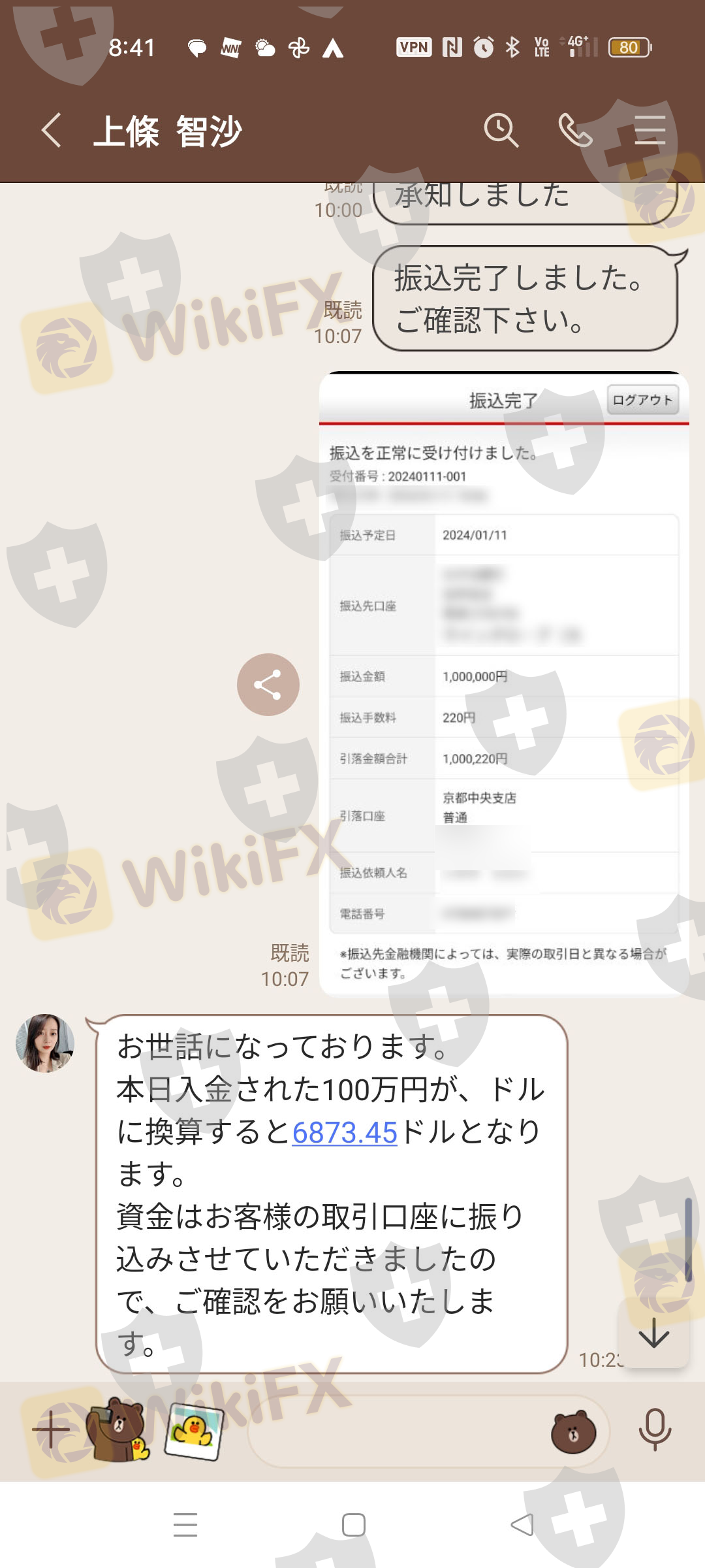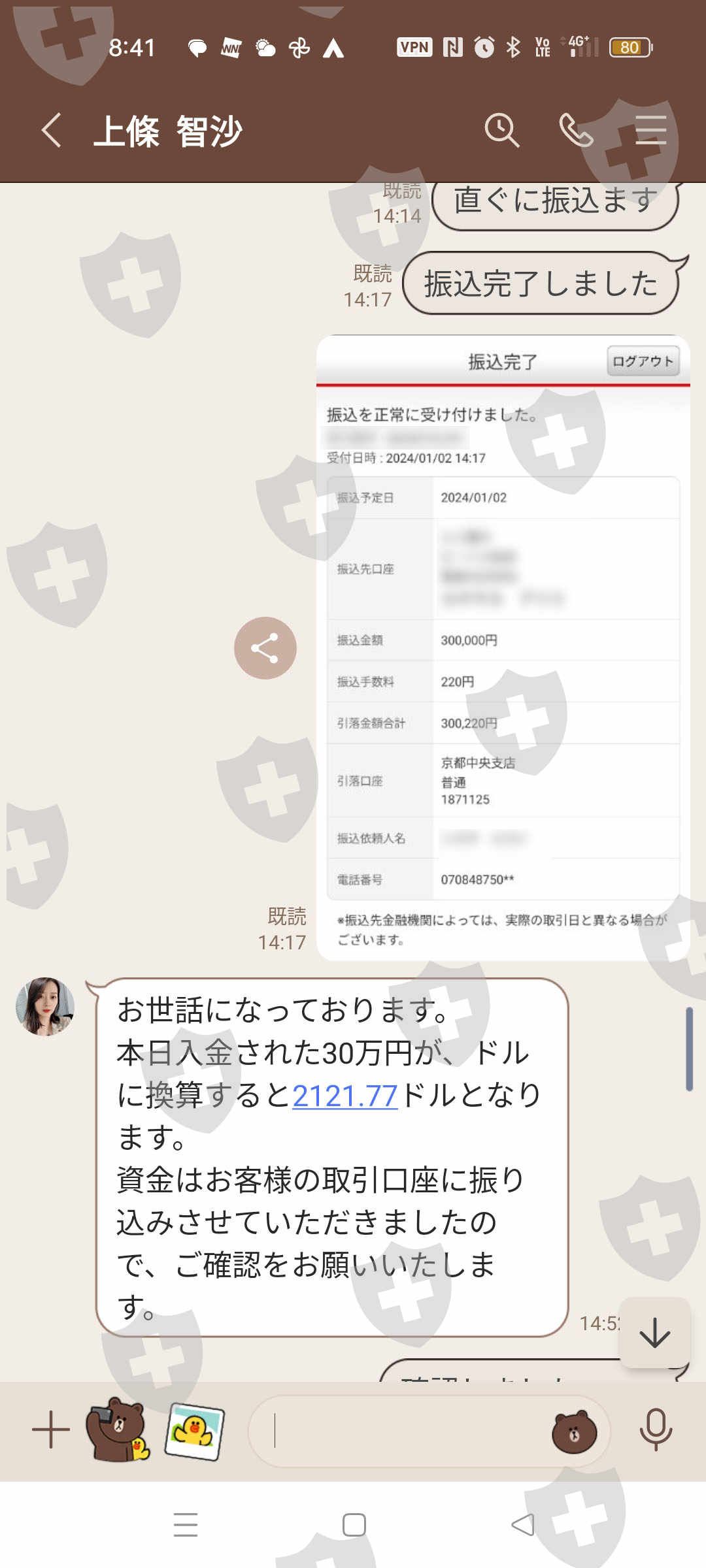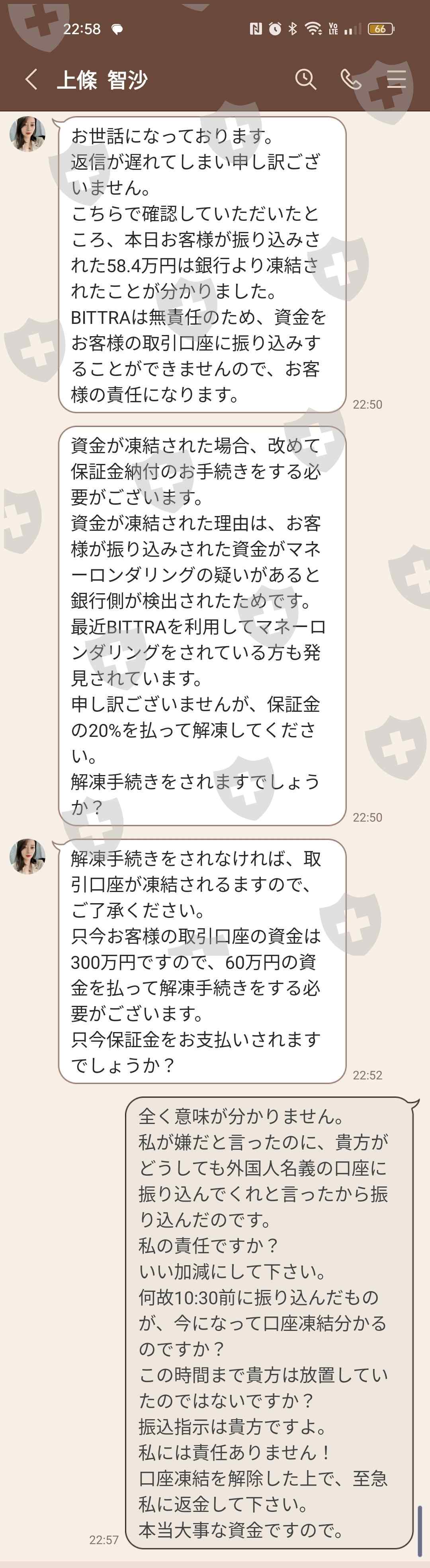 2月2日上午10点30分左右,我试图增加外汇资金(584,000日元)。 Bittra当我要求 的支持人员上条先生为我介绍一个账户时,我拒绝了,因为收款人是外国人,但他告诉我,金额低于 100 万日元的,只能介绍外国账户。估计是没办法,只好把钱转到国外账户了,但直到2月2日晚上11点左右,我才收到转账的回复。是2月2日晚上10点30分以大盘价格进行增资交易。大盘交易结束后5-10分钟,上条先生在附聊中告诉我,我转账的账户被冻结了,要立即通知银行取消转账,并且外汇交易账户涉嫌洗钱,联系我立即转账60万日元,因为会被冻结。这是一种恶意的策略,比如在市场大宗交易完成、我赚了一大笔钱之后,还特意联系我。之后我们多次交流,但听到了很多奇怪的日语,我才意识到那人是在冒充日本人。经过询问,第二天早上,包括我在内的四人被迫离开了投资课程。目前,尽管有我的消息,但上条先生的聊天记录并未标记为已读。我们现在意识到我们是海外诈骗团伙诈骗的受害者。