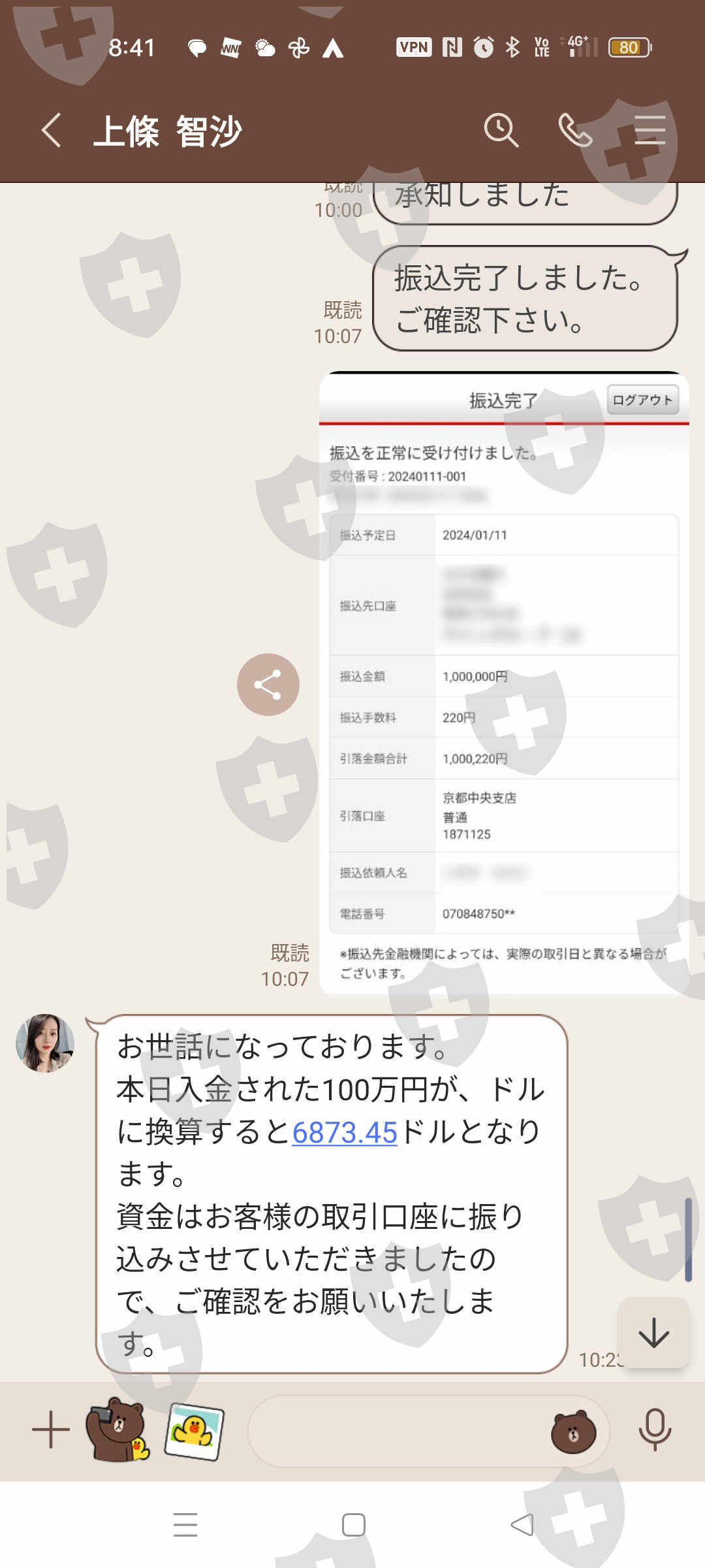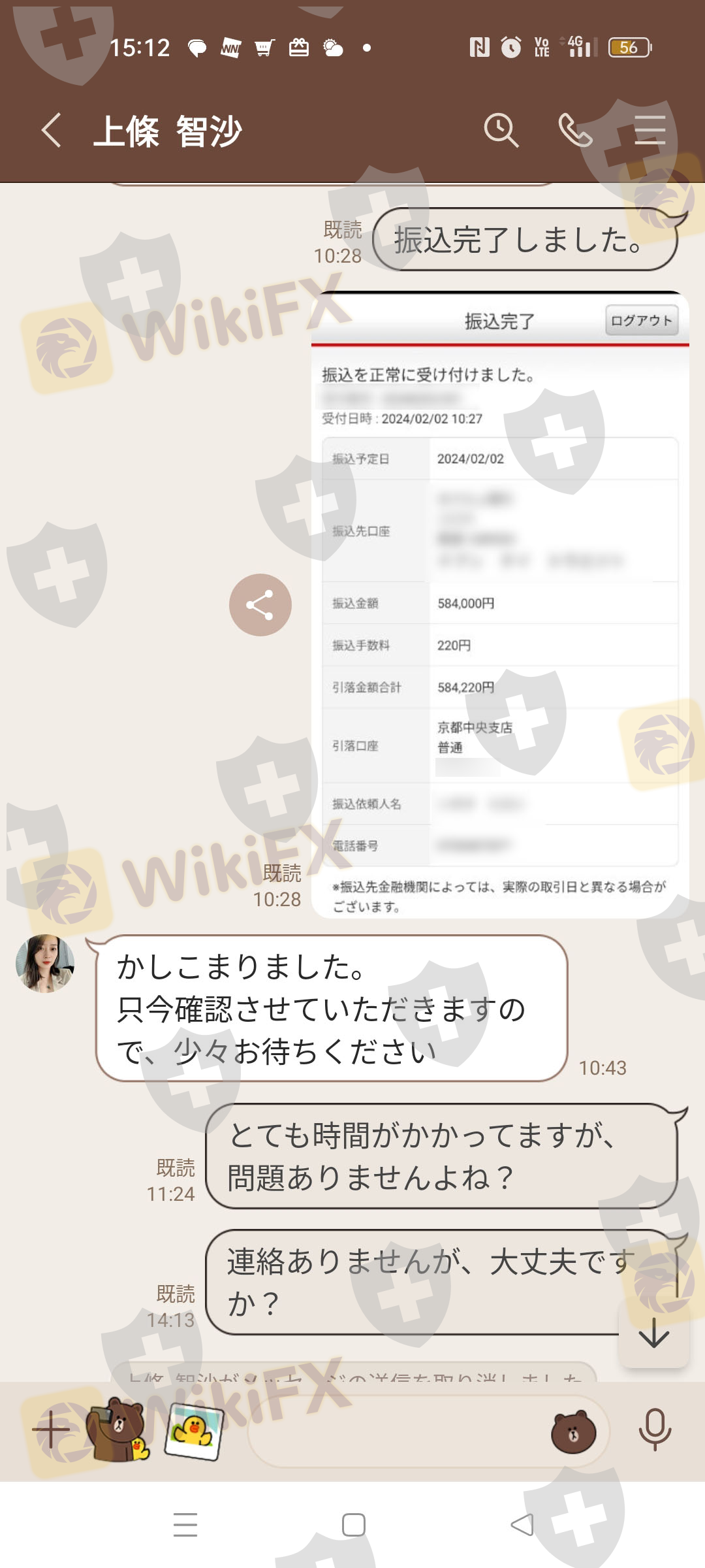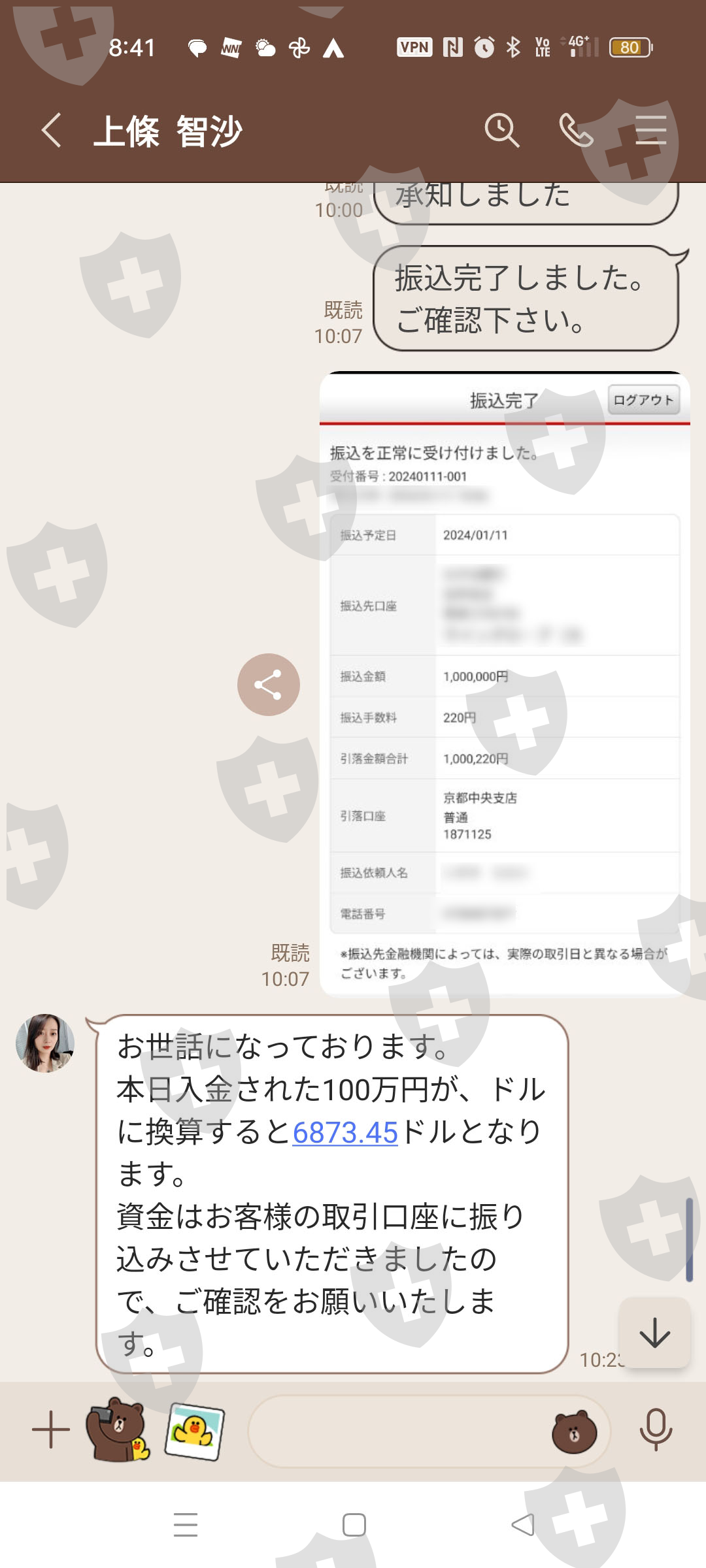 2月2日上午10点30分左右,我试图增加外汇资金(584,000日元)。 Bittra当我要求 的支持人员上条先生为我介绍一个账户时,我拒绝了,因为收款人是外国人,但他告诉我,金额低于 100 万日元的,只能介绍外国账户。估计是没办法,只好把钱转到国外账户了,但直到2月2日晚上11点左右,我才收到转账的回复。是2月2日晚上10点30分以大盘价格进行增资交易。大盘交易结束后5-10分钟,上条先生在附聊中告诉我,我转账的账户被冻结了,要立即通知银行取消转账,并且外汇交易账户涉嫌洗钱,联系我立即转账60万日元,因为会被冻结。这是一种恶意的策略,比如在市场大宗交易完成、我赚了一大笔钱之后,还特意联系我。之后我们多次交流,但听到了很多奇怪的日语,我才意识到那人是在冒充日本人。经过询问,第二天早上,包括我在内的四人被迫离开了投资课程。目前,尽管有我的消息,但上条先生的聊天记录并未标记为已读。我们现在意识到我们是海外诈骗团伙诈骗的受害者。