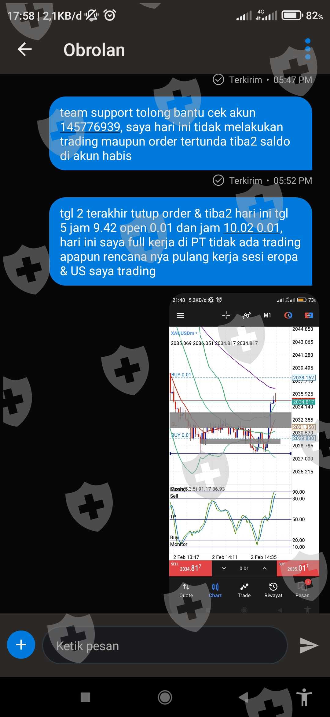 周五订单被平仓,但 5 日有一个不受我控制的未平仓订单,周一我全职工作,没有挂单,我计划在美国时段进行交易。 但实际上,由于交易不受我控制,全消失了,余额为零。然后我发送了一封投诉电子邮件,但没有得到回复。 希望Exness支持团队可以通过账号145776939跟进这个问题