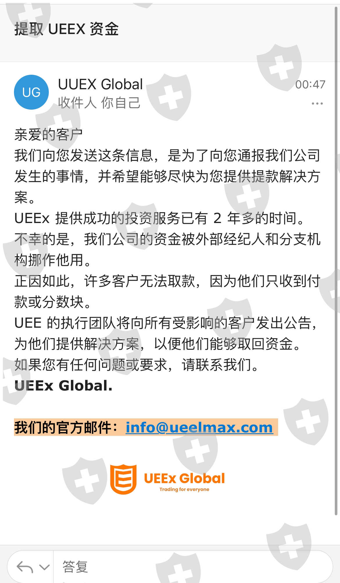 我无法取款,UEEx 向我解释并说他们会帮我取款。