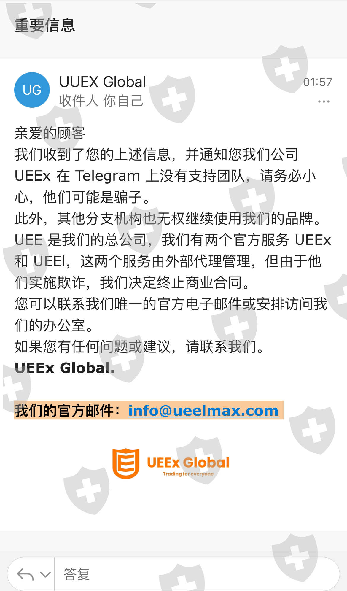 他们不让我取款,并停止给我写信,因为我拒绝支付信用评分。 一个月过去了,UEEx 总部给我发了一条信息,解释了发生的事情,并说关于信用评分的事情是谎言。分行代理才是实施欺诈的人,现在 UEEx 说他们将帮助客户提取资金。UEEx 如果不给我钱,我就曝光你们!!