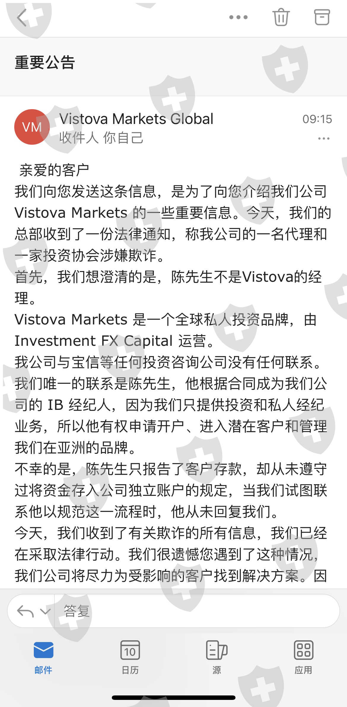 Vistova 发送了一份公报。陈先生和宝信集团是骗子。