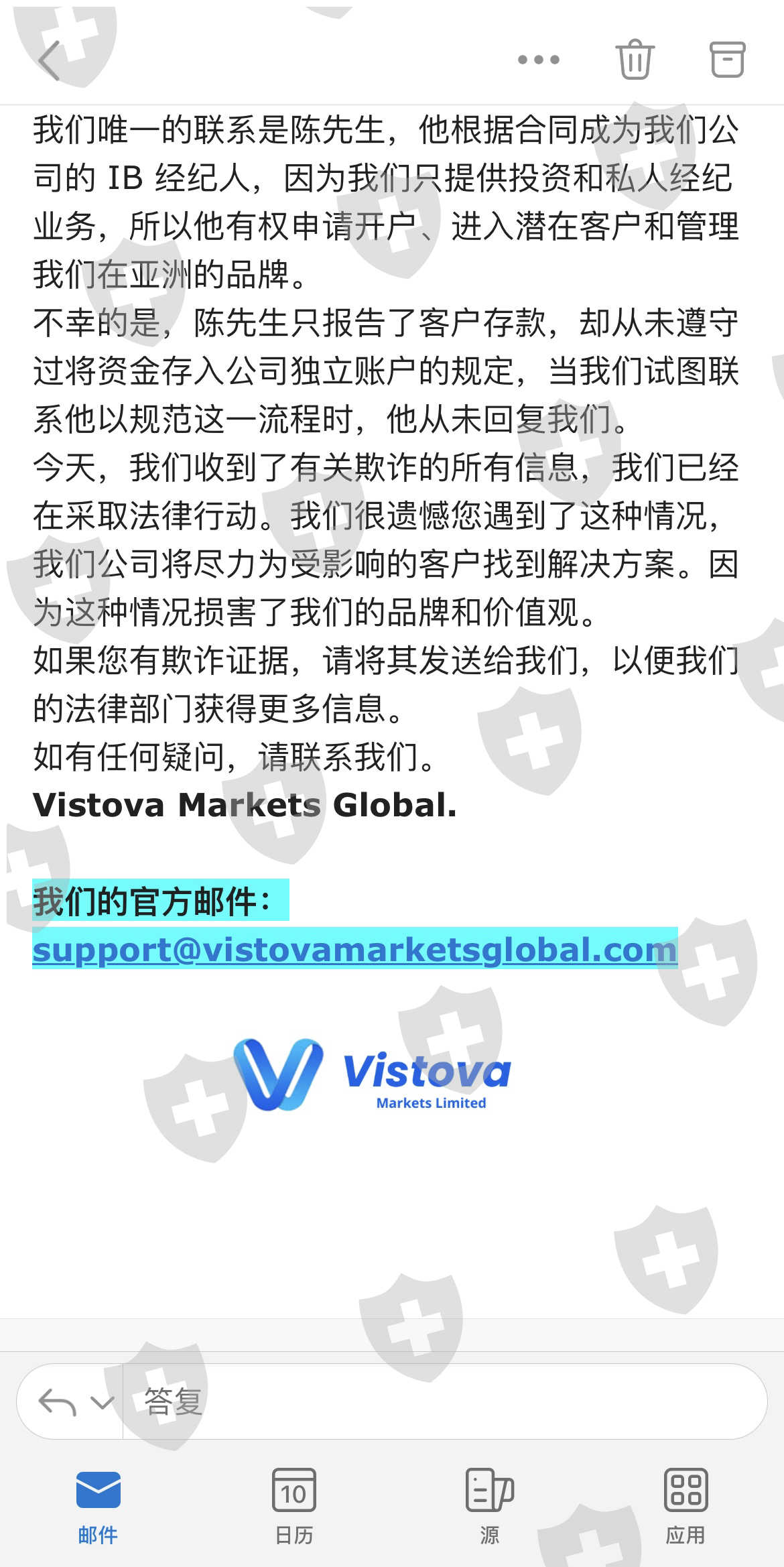 今天我收到了一封来自 Vistova 的电子邮件,他们向我解释说陈先生并不是公司的总经理,他只是一个介绍客户的代理。陈先生和宝信集团实施了诈骗,偷走了我的钱。