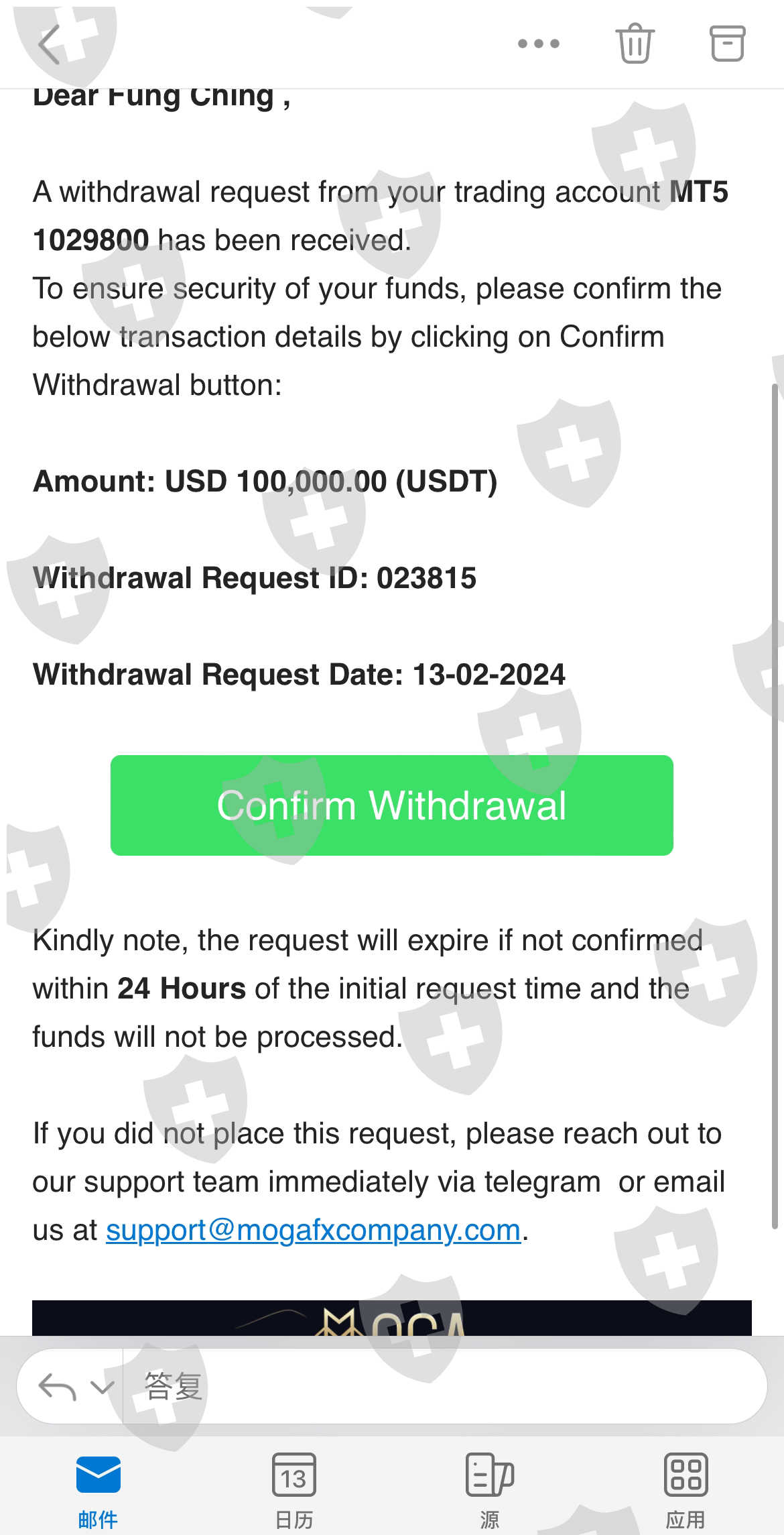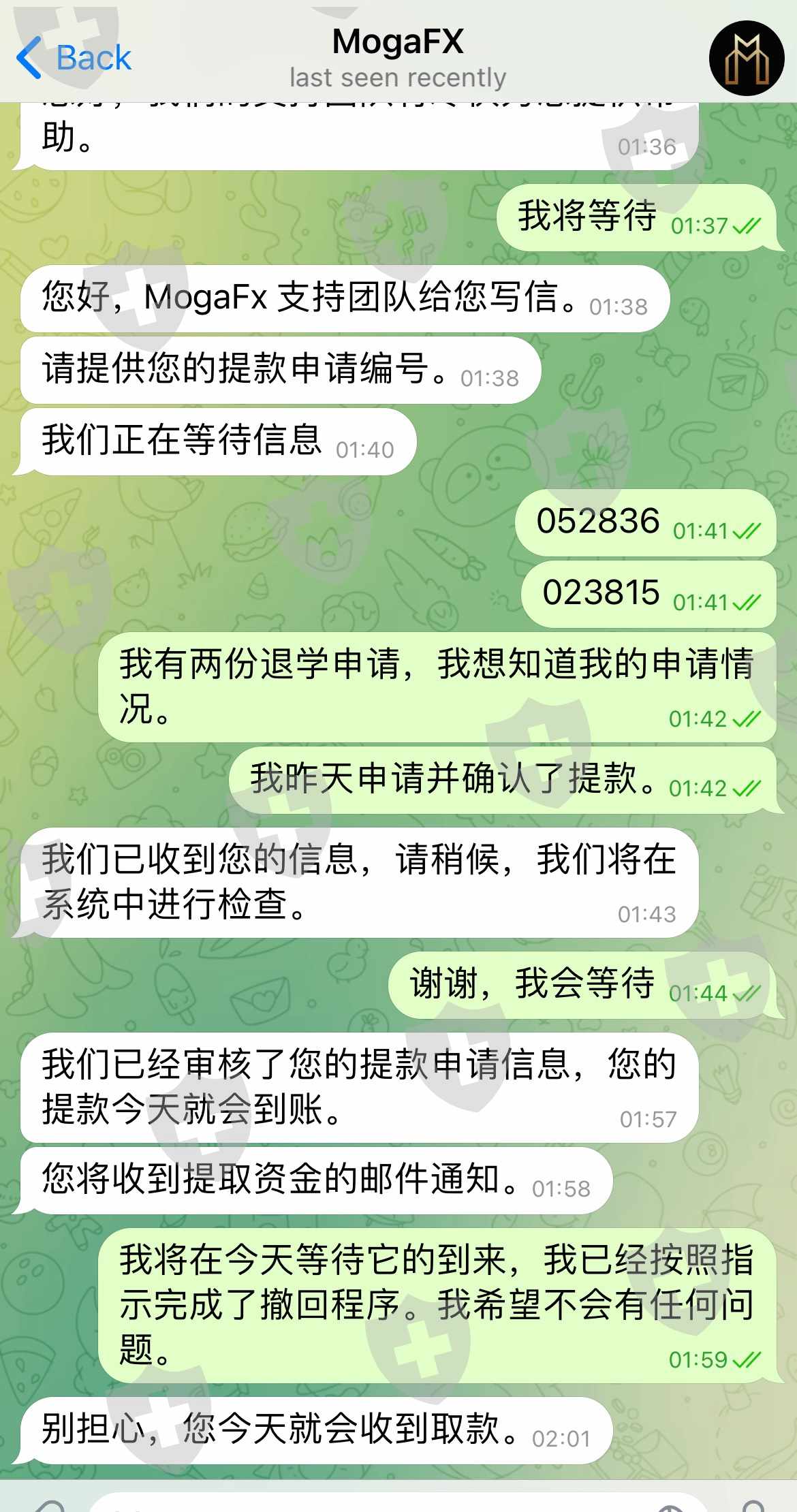 我要求取款,MogaFx 向我保证取款会在今天到账。
