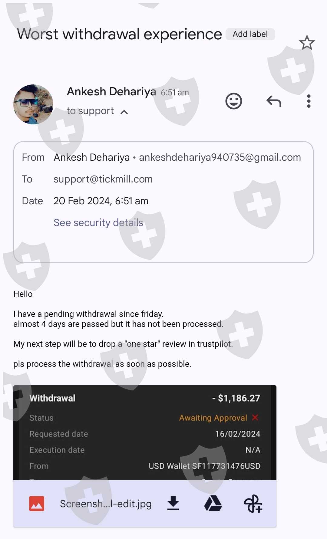 Tickmill不给出金我们账户里的$1186.27,支持团队也没有任何回应。这些钱都是通过他们的跟单平台合法盈利得来的。他们一点都不专业,总是不给出大额出金。希望他们的印度客户能尽快远离该诈骗交易商。