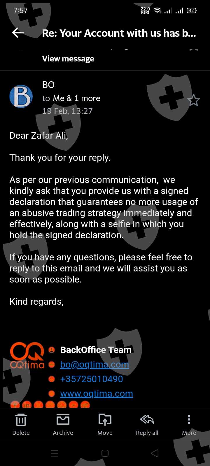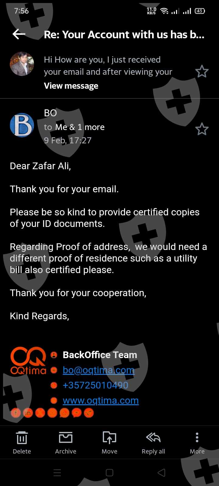 Hi my name is zafar ali. My registered account at oqtima broker is azafar46@yahoo.com. Oqtima broker is a scammer broker. Here is my review about this Oqtima Global broker. when i deposit lost 600$ in US shares Trading before, they returned my remaining balance of 100$. And after few days When i deposit again 500$ and trade again in us share and I do profit 2920$ in Us share Snap trading so they made excuses for illegal trades and trying to eat my profit 2920$ Since from 15 days they tortured me by demanding different documents and i provided even my account was already fully verified. This proves that it is an scammer broker. My deposit is 500$ and profit is 2920$. All forex trader listen openly This broker will never give you your profit. Everyone reading this review please withdraw your funds from this scam broker. I am going to post everywhere with all evidence of videos and screenshot. I am also opening case against them in their regulations. Admin kindly declare this broker as scam and help me to recover my 3419$.on Trust pilot reviews website few other victum of this scammer company Oqtima Global. He also told me again and again about my trading strategy in their email. What consern of this company about my trading strategy. Is regulated broker doing this. they also blocked my mt4 account and access to my portal.