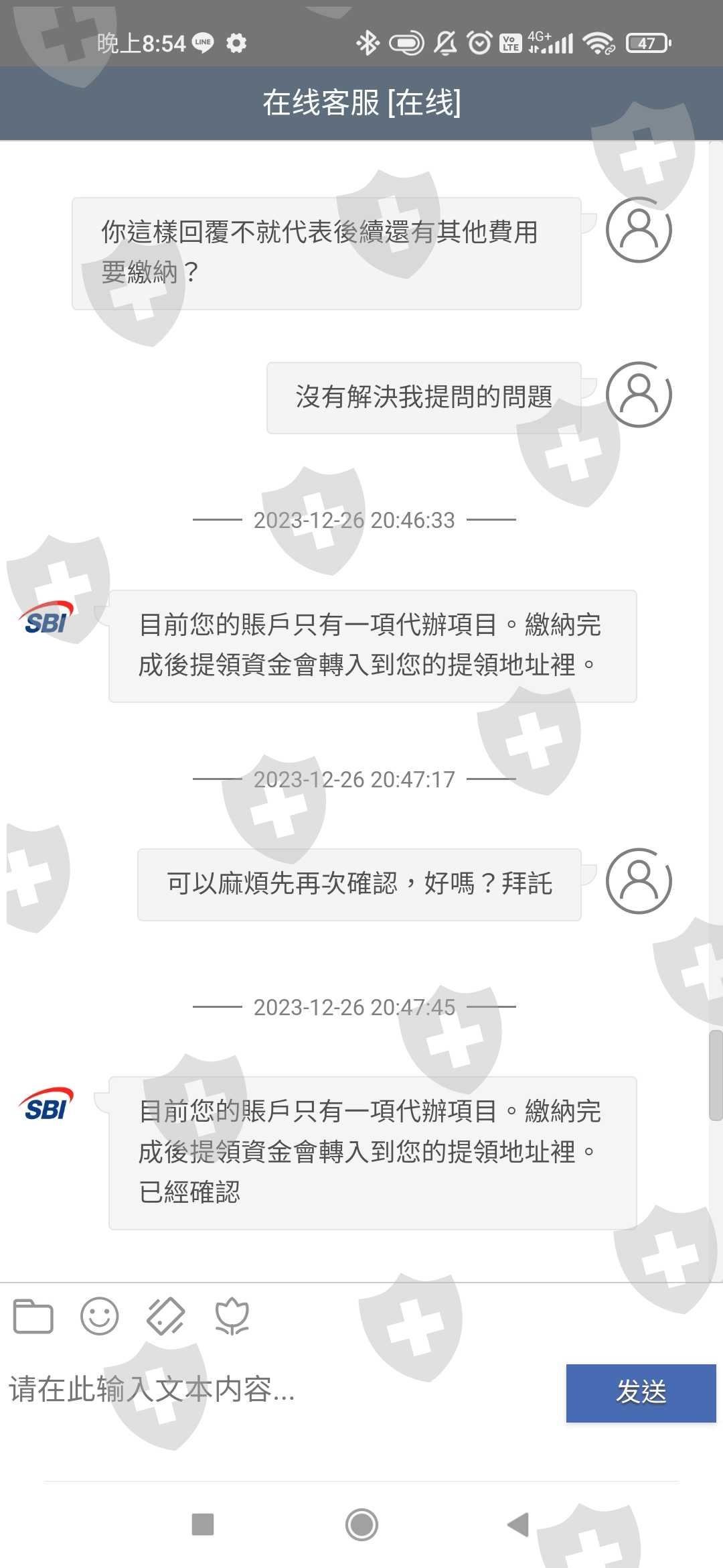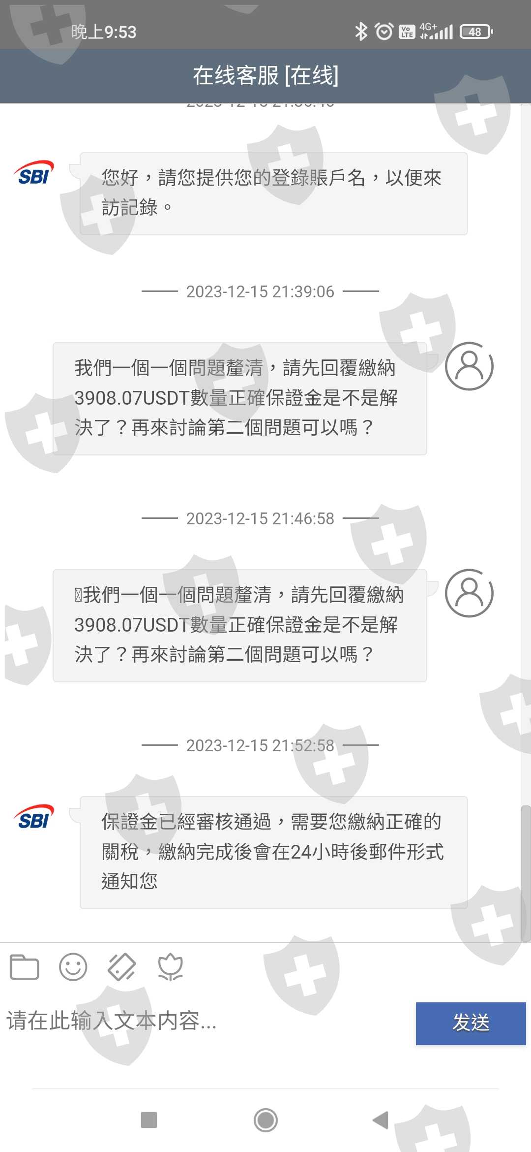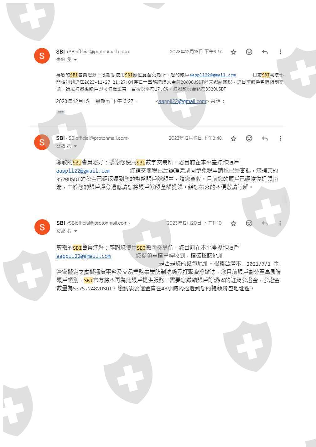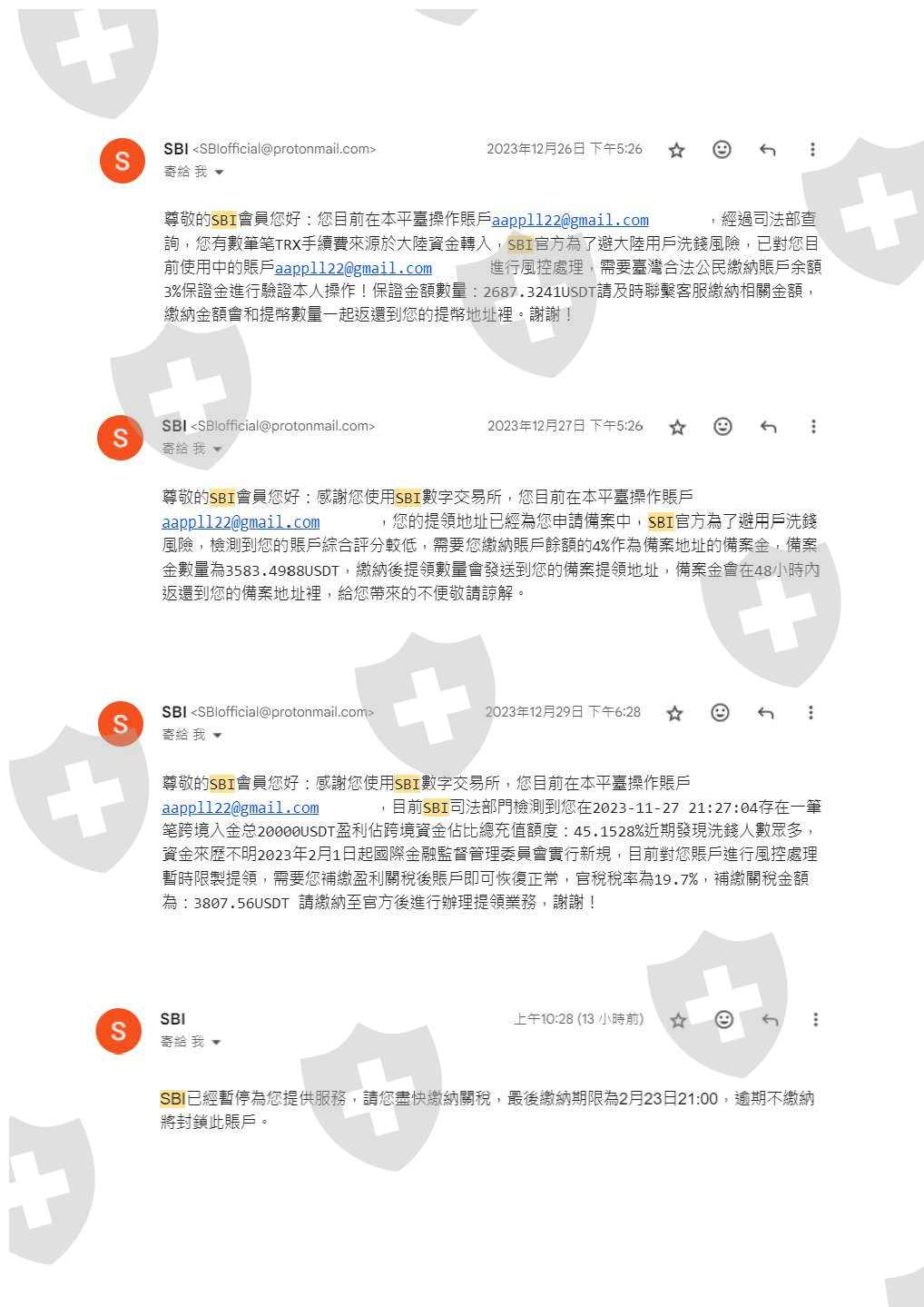 1. 交易所名稱為SBI在中國及日本都有註冊, 我在2023年11月交易時,是在下列網址 www.sbicllwllslqw.com 無法出今後發現該平台同時有另外三個網址是相通,用同一組帳號密碼都可以登入 www.sbigtr.com www.sbilamkiedjroc.com www.sbiuuolehjne.com 上述的通知信件都是SBIofficial@protonmail.com(可以比對SBI寄給我的信箱是相同的) 但2024年2月無預期關閉所有網址及APP,目前已經無法登入,2/22已信件通知停止服務2. 2023/11/3及2023/11/4分別入金1000及1,100 USDT,不會操作導致虧錢 因此在2023/11/27分別入金11696 USDT及20000 USDT(跟朋友借請其入金) 就賺錢到78161.40 USDT,然後要提領16,000 USDT, 惡夢就開始,要求繳納各種理由的稅金 (1)需要SBI賬戶實名認證人且臺灣合法公民繳納賬戶余額5%保證金進行驗證本人操作!保證金額數量:3908.07USDT 結果我入金3999 USDT,數字跟它不一樣,又補繳3908.07USDT (2)跨境入金总20000USDT尚未繳納關稅,您目前賬戶暫時限制提領,請您補繳後賬戶即可恢復正常,官稅稅率為17.6%,補繳關稅金額為:3520USDT此時我的帳戶來到89588.47 USDT(交易所將前三筆繳納的錢入到帳戶) (3)根據台灣本土2021/7/1 金管會擬定之虛擬通貨平台及交易業務事業防制洗錢及打擊資恐辦法,您目前賬戶劃分至高風險賬戶類別,SBI官方將不再為此賬戶提供服務,需要您繳納賬戶餘額6%的註銷公證金,公證金數量為5375.2482USDT (4)數筆笔TRX手續費來源於大陸資金轉入,SBI官方為了避大陸用戶洗錢風險,進行風控處理,需要臺灣合法公民繳納賬戶余額3%保證金進行驗證本人操作!保證金額數量:2687.3241USDT (5)提領地址已經為您申請備案中,SBI官方為了避用戶洗錢風險,檢測到您的賬戶綜合評分較低,需要您繳納賬戶餘額的4%作為備案地址的備案金,備案金數量為3583.4988USDT (3)-(5)筆沒有入到我帳戶,交易所就扣著 (6)一筆笔跨境入金总20000USDT盈利佔跨境資金佔比總充值額度:45.1528%近期發現洗錢人數眾多,資金來歷不明2023年2月1日起國際金融監督管理委員會實行新規,目前對您賬戶進行風控處理暫時限製提領,需要您補繳盈利關稅後賬戶即可恢復正常,官稅稅率為19.7%,補繳關稅金額為:3807.56USDT;此筆沒有繳納3. 每繳一筆稅金都有問客服是不是繳完就可以提領金額並歸還所繳納的保證金、關稅、註銷公證金等等,每次都是官方回答,當前我的帳戶僅有此筆資金需要辦理繳納,無後續資金需要繳納辦理。結果繳納後就有新的問題要繳納4. 留下這些詳細資訊,希望日後不要有人跟我一樣受騙 因為我發現它註冊網址可以使用到2024/9/22,深怕它又復活繼續詐騙 受理註冊網址的平台公司是Gname.com Pte. Ltd.5.