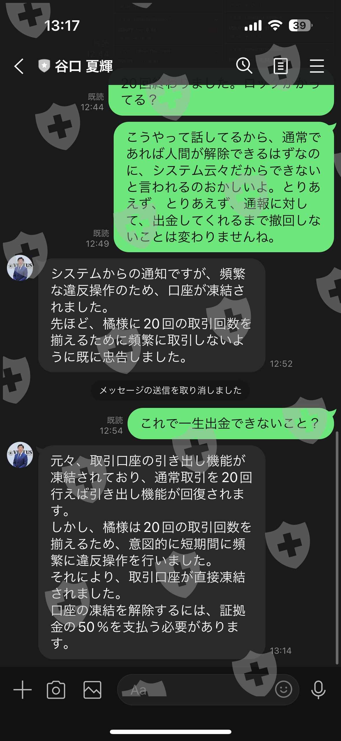 - 凍結されたアカウントを解除するには、50%の資金を別途支払う必要があるとされており、これについても事前説明がなかった。