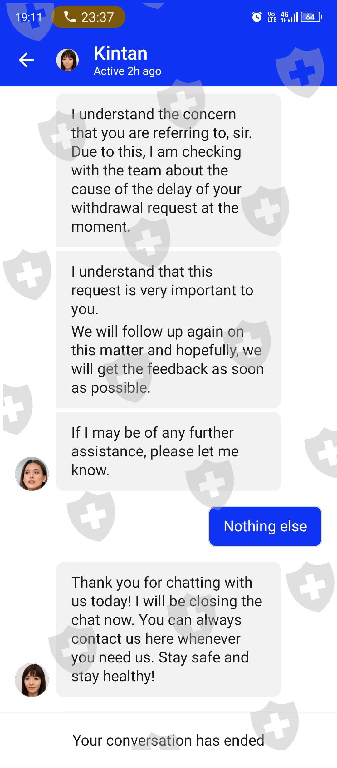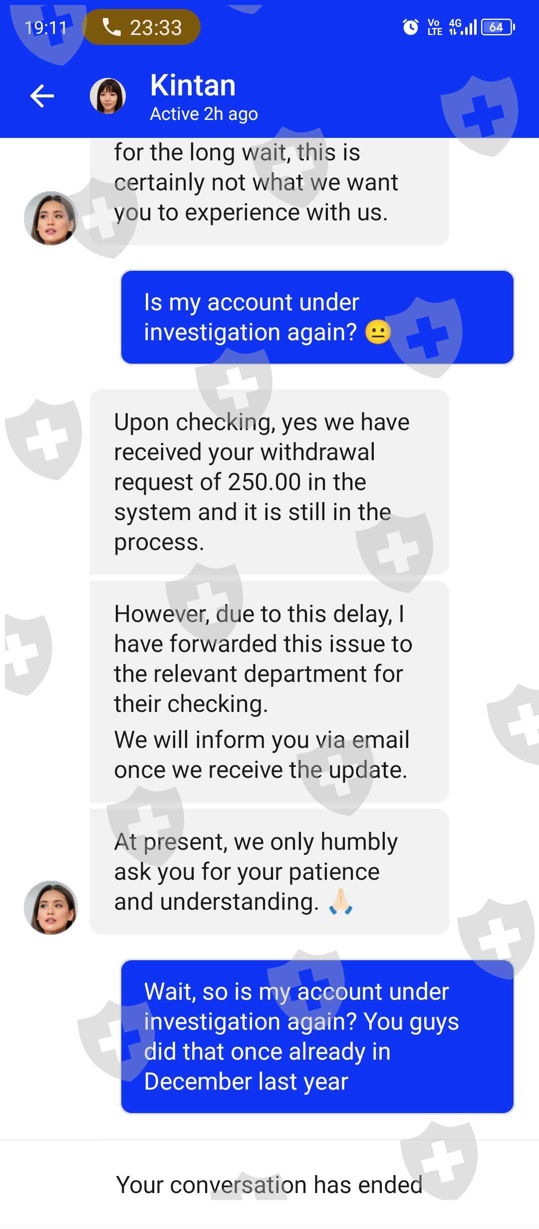 They have more than 20 chat agent (fake name and fake profile pictures) and they all say the same thing when I ask why is my withdrawals not approved. 'We forwarded this case to the relevant team' 'We will get back to you soon, rest assured'. They are not giving any relevant answers to my inquiry. (Screenshot attached)
