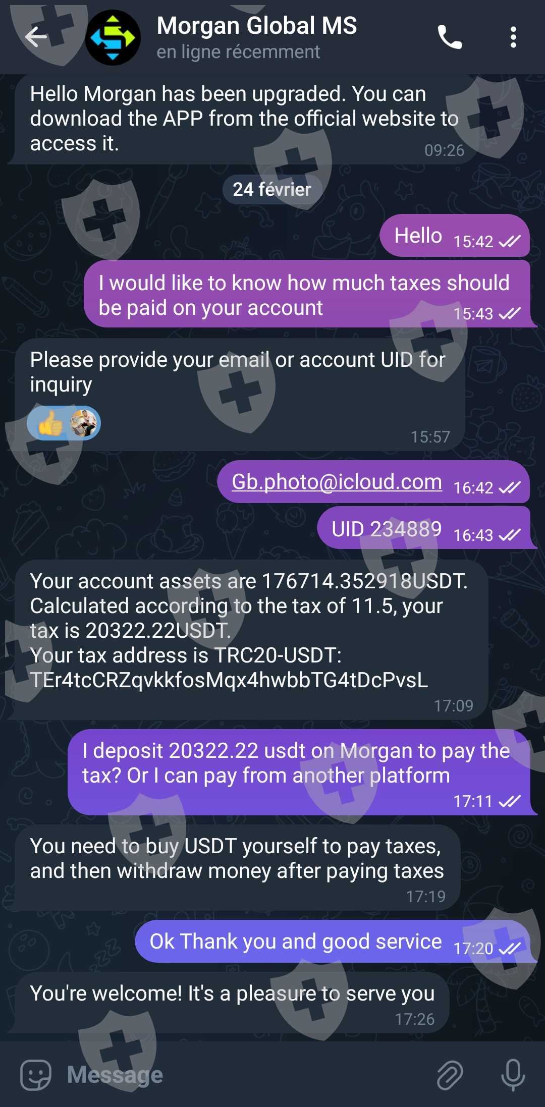 我在电报上遇到了一个叫米娅的女孩,她声称住在德国,经过几个月的交谈,她让我相信她投资了一个名为 Global Morgan网站链接:https://morganglobal-web.com/ 注册后,我开始在该网站上进行交易,当时我正在存款和取款,直到我收到一封启动 ieo 项目的电子邮件,所以两周后我投资了 11876 美元发行时,加密货币的价值为 25 美元,我卖掉了所有硬币,总价为 237693 美元。当我想提款时,客户服务要求我向一个 USDT 地址缴纳 11.5% 的税费,约合 20,322 美元,几天后,我将其交给一位经验丰富的交易者,他让我知道这是我所做的一个骗局。自己的研究最终证明这纯粹是一个骗局。我的朋友不是真实的,她在 Instagram 上使用了名人的身份,而我在电报上的朋友强迫我缴税才能提取资金,我不知道该怎么办了,我意识到我失去了我的投资 我在 telegram 上认识了一个叫 mia 的女孩,她声称住在德国,经过几个月的交谈,她让我相信她投资了一个叫 mia 的平台 Global Morgan网站链接:https://morganglobal-web.com/ 注册后,我开始在该网站上进行交易,我进行存款和提款,直到我收到一封启动 IEO 项目的电子邮件,所以我在两周后投资了 11,876 美元推出加密货币的价值为 25 美元,我卖掉了所有硬币,总共获得了 237693 美元。当我想提款时,客服要求我缴纳11.5%的税,大约是20,322美元到一个USDT地址,几天后我把它介绍给一位经验丰富的交易者,他告诉我这是一个骗局。我自己做了研究,最后发现这纯粹是一个骗局。我的朋友不是真的,她用的是名人的