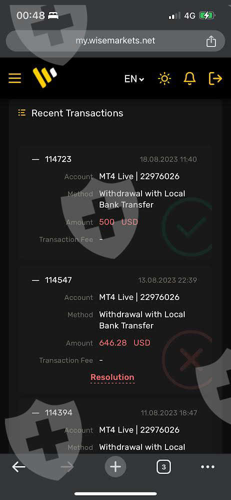 我于 2023 年 8 月 18 日出金,金额为 500 美元,Wisemarket 帐户的屏幕截图所示。 在wisemarket.com上,它显示出金成功,但我的银行账户并未收到钱款。 接下来一直要求截图,但没有解决问题。我已发送电子邮件至support@wisemarket.com,但我只收到自动回复,说这是银行的问题,因为他们作为交易商已经履行了他们的职责。 当只收到相同内容的邮件时,你能从截图中看到我有多沮丧。 我当时联系了IB,但没有结果。 她坚称这是交易商的错,而不是他们的错。 我刚刚发现 wikifx 上现在有调解功能。所以我现在正试图将我的资金转移到它所属的地方:我的账户。