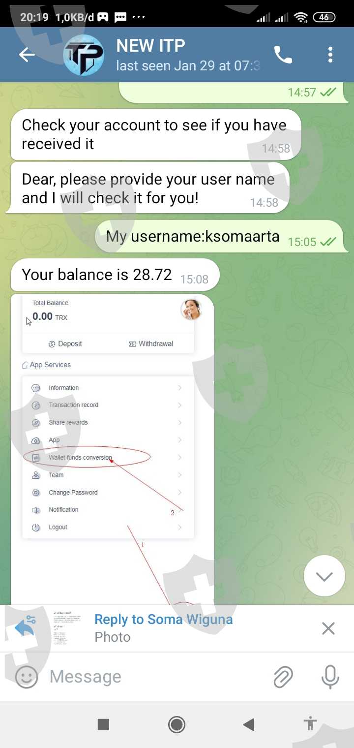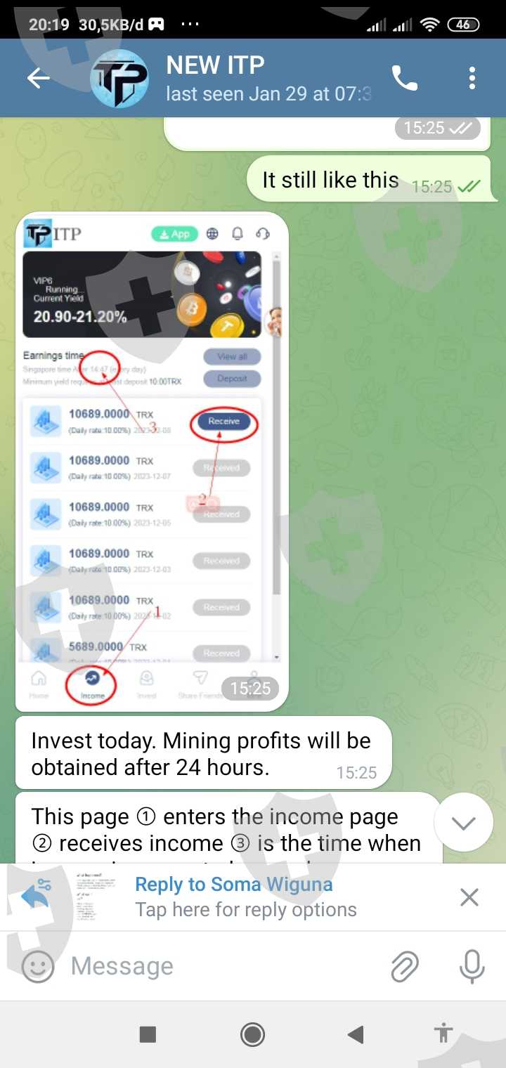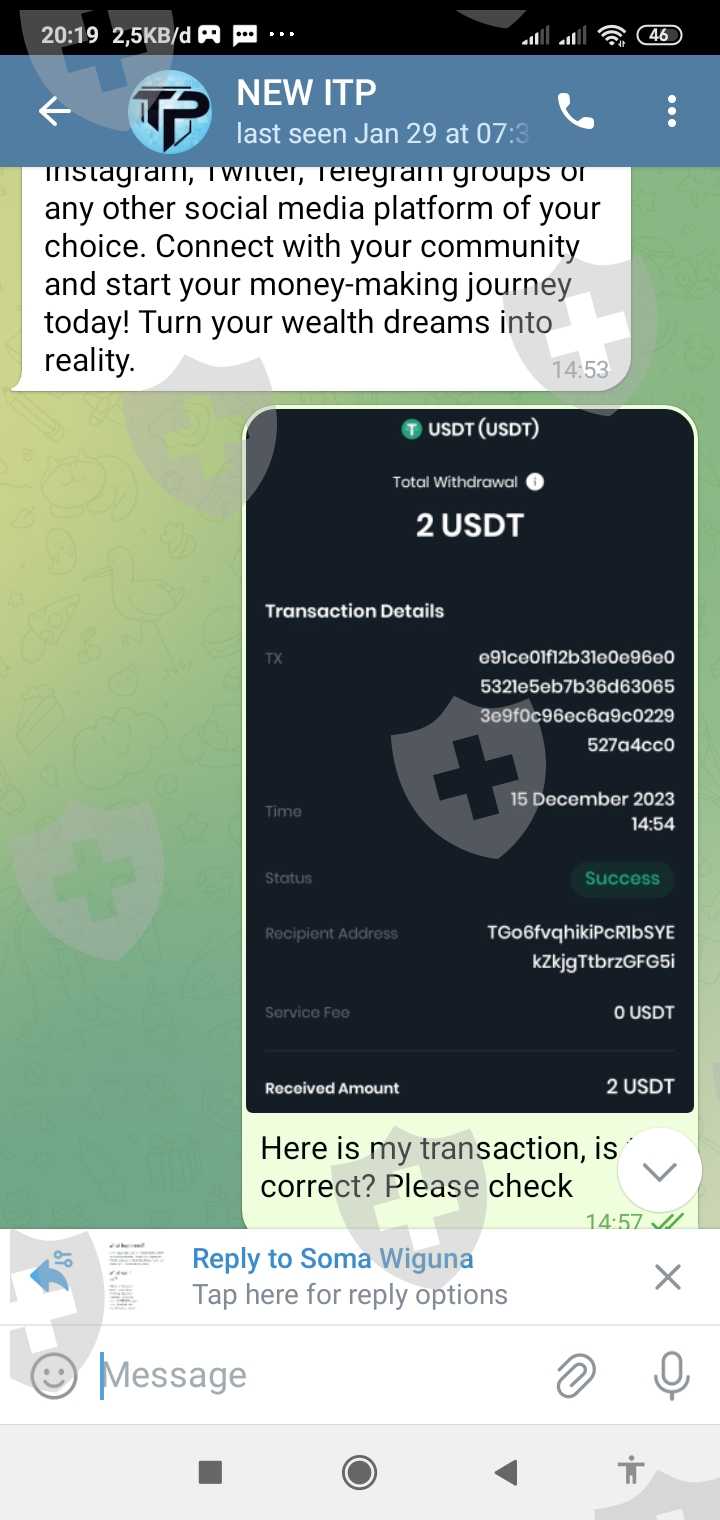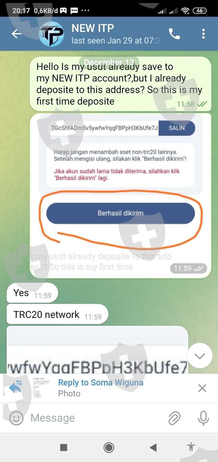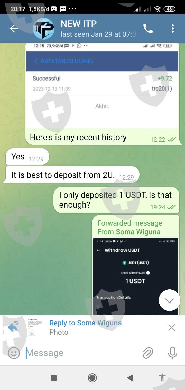 Saya : Hello Is my usdt already save to my NEW ITP account?,but I already deposite to this address? So this is my first time deposite