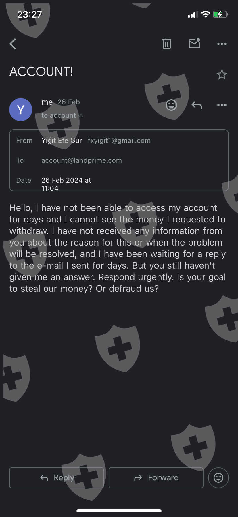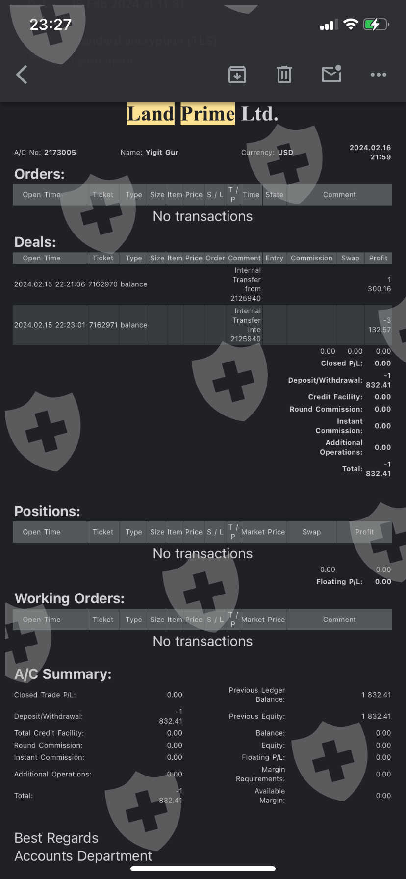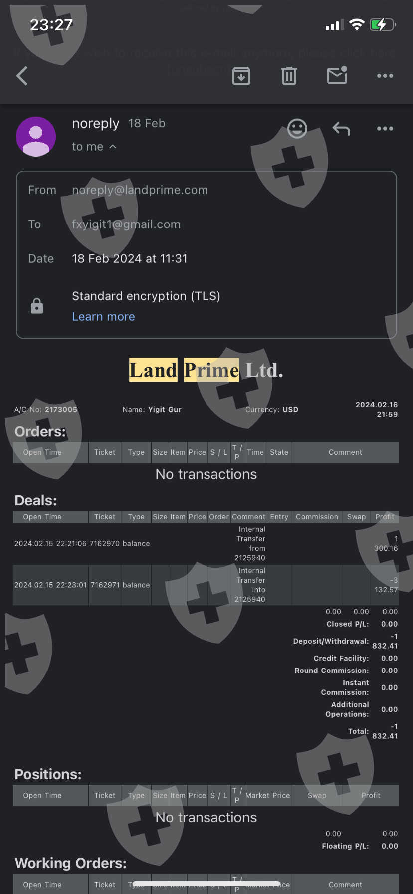 Hello, I made transactions through Land Prime company for more than 1 month. And I made a profit of like $1000. Immediately after I requested a withdrawal, my meta accounts were closed by land prime and my access to my account was blocked. We received an e-mail stating that this problem will be resolved within 2 weeks and we will be able to receive our money, but even though 3 weeks have passed, we cannot receive a response to either our e-mails or the messages we sent via WhatsApp. And we still haven't received our money! My Land Prime meta account number is 2173005, my registered e-mail address is fxyigit1@gmail.com. I requested a withdrawal of around 2000 dollars, but I still have not received any money, even my principal money. And I still can't access my meta accounts, I can't get responses to my messages.
