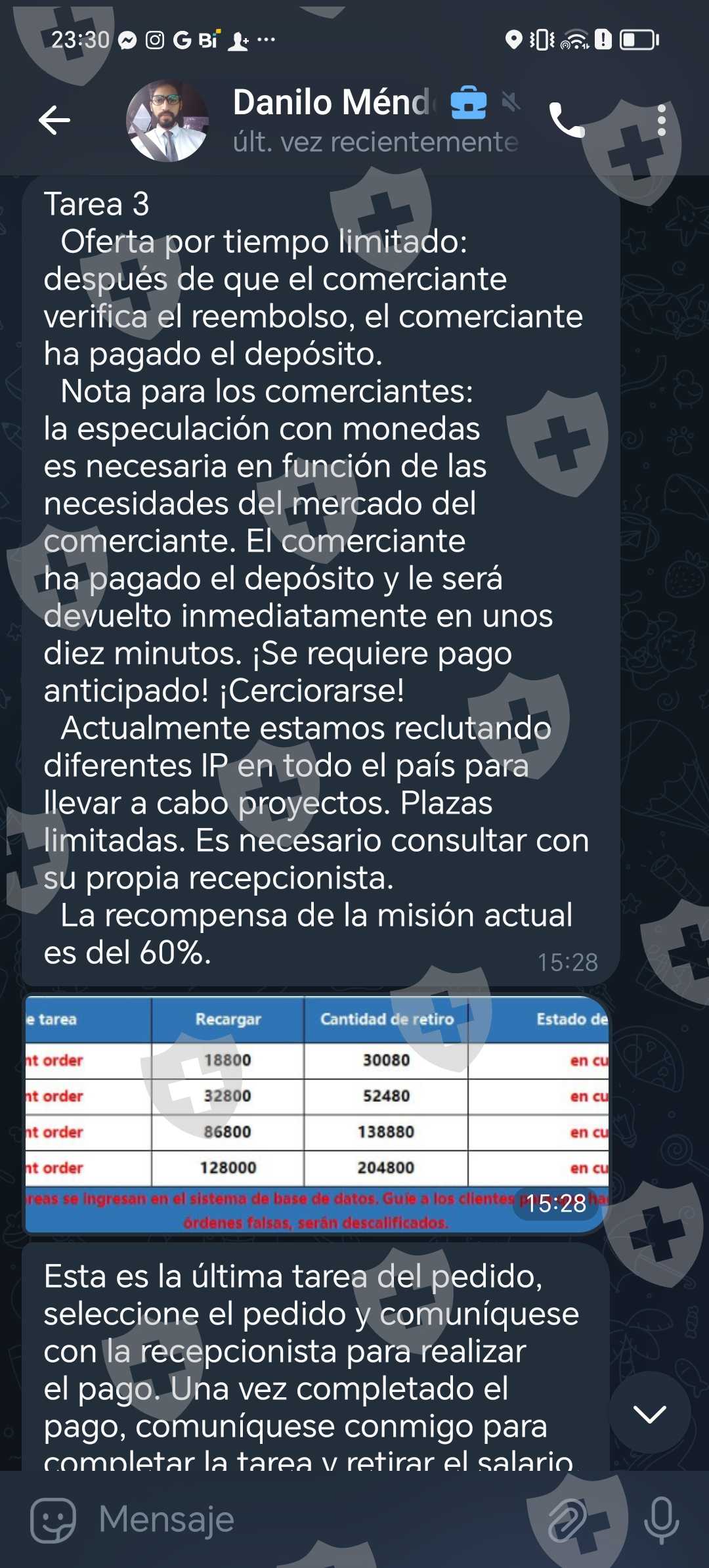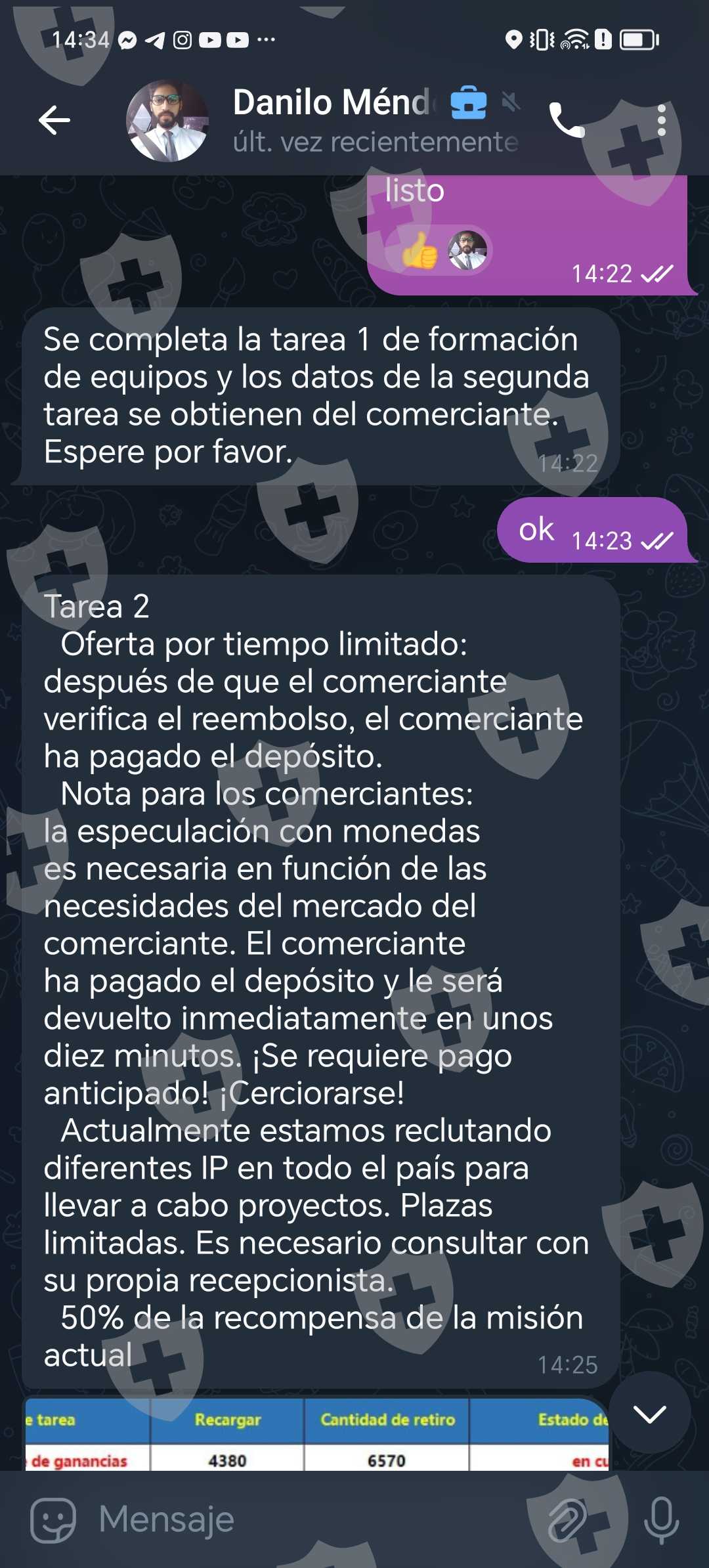 ellos le llaman tareas, al principio me dijeron q tenia q depositar 300 y que ellos me devuelven 420 luego me dijeron q la tarea 2 era depositar 150 y me devuelven 210 lo estuve haciendo y pues si me estaban regresando el dinero a lo cual pues me emocione luego en la siguiente tarea eran depositar 800 y ellos devuelven 1,040 luego la siguiente tarea eran depositar 4,380 a lo cual le preste a un amigo para poder llegar a ese monto ya que le habia invertido 5,690 dinero que nunca recibi de vuelta, luego me dijeron que ellos me iban a regresar 7,252 por todo lo que habia invertido pero antes de que me regresaran eso yo debia de depositarles 18,880 y ellos me regresaban toda la cantidad completa y lo extra que supuestamente habia ganado, pero obvio yo no tengo la cantidad de 18,000 a lo cual les dije que me regresaran el dinero porque no tenia esa cantidad pero me dijeron q si no depositaba los 18,000 ellos no me pueden regresar absolutamente nada, y supuestamente yo ya habia ganado 7,250 pero nunca me lo dieron