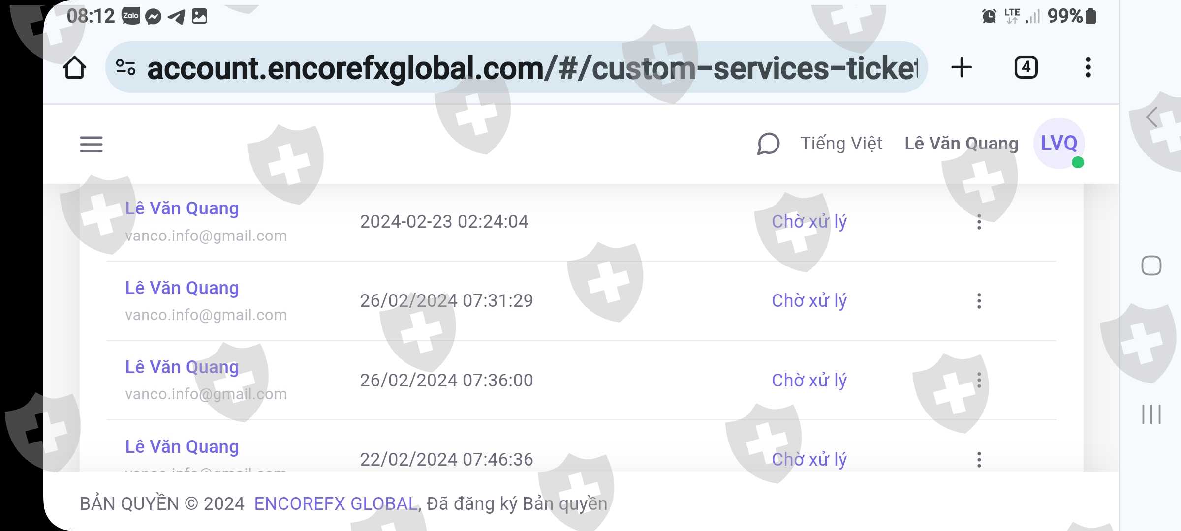 tôi có đầu tư bên sàn encorefx global tổng số tiền đầu tư 7500usd có rút về 3158.98 usd bị thua lỗ 2110.08usd số tiền còn lại trong tk là 2230.94usd ngày 19/2 tôi không thấy có cổ tức của mã cp siemens tôi thắc hỏi bạn tư vấn không thấy trả lời.gọi điện thì không nghe máy song rồi tắt máy luôn.tôi liền gửi mail cho support bên sàn hỏi không thấy trả lời.tôi lại gửi lại mail khác cũng không thấy hồi âm .và tôi vào trang chủ rút tiền thử thì thấy không nhập được lệnh rút tiền.tôi lại gửi mail hỏi support vẫn khồn trả lời và kết quả là tôi bị khóa luôn cả tk trang chủ và tk mt5.giờ tôi không biết tìm ai để hỏi lí do tại sao tôi bị khóa tài khoản.vậy tôi viết lên đây nhờ cộng đồng giúp đỡ có thông tin gì về sàn encorefx global giúp tôi để tôi lấy lai số tiền tôi đã bị sàn này lừa đảo và chiếm đoạt.