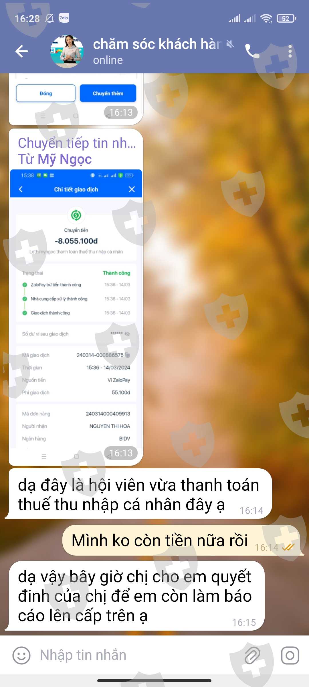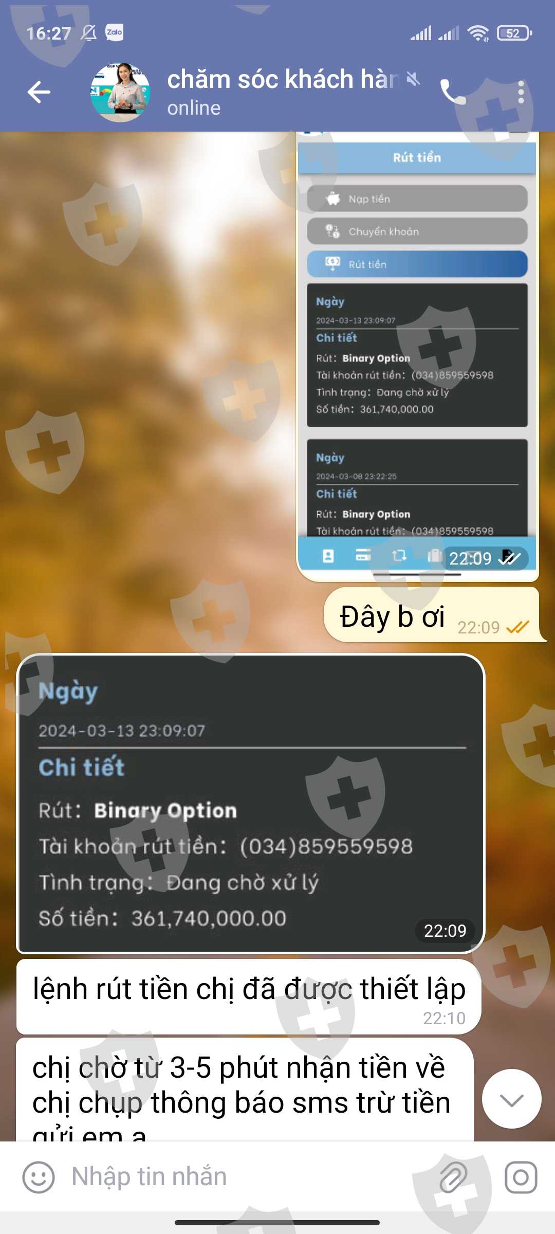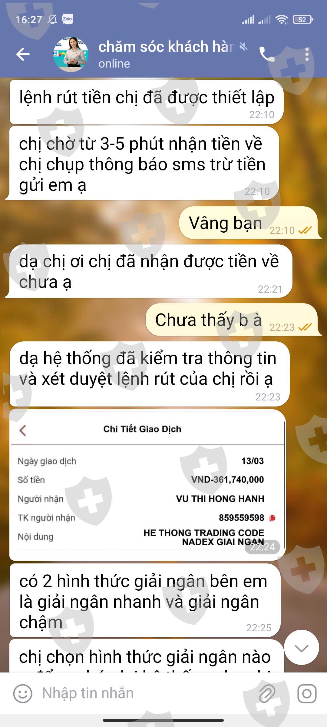 Mình đc mời vào sàn Nadex này hôm 8/3. Ban đầu họ dụ mình nạp vốn 300k, rút đc lần đầu đc 380k, sau đó họ cho vào nhóm , trong nhóm có 114người. Rồi đưa ra các lệnh giao dịch 1 ngày 2 lần vào 13h và 19h30. mỗi lần giao dịch đc 270k. Yêu cầu rút lần 2 thì số tiền phải là 3,8 triệu mới đc rút lần 2. sau đó liên tục các hội viên tham gia đầu tư gói cao hơn, và đều thành công rút về số tiền khủng theo đúng số tiền đầu tư và lợi nhuận đã đề ra. Họ lừa quá đỉnh bằng cách đưa các video hội viên tham gia nhận đc tiền khủng, rất xúc động khóc lóc các kiểu làm ng khác tin trong đó có mình. Sau đó ng tự xưng là thầy nhắn hỏi mình tgia gói đầu tư và CTY hỗ trợ . Mình đã nạp vốn 5tr , và đc giao dịch với số vốn 30tr . Giao dịch 20p theo lệnh thành công với mức lợi nhuận 360tr, với yêu cầu thanh toán 15tr số tiền CTY hỗ trợ xong mới đc rút tiền. và bảo mình liên hệ CSKH để rút tiền. Và cuối cùng điều gì đến cũng đến, mình bị lừa số tiền 23 triệu. Với nhiều lí do, lí do cuốI là yêu cầu mìnb đóng thuế với số tiền 15tr 124 nghìn. Mình kêu ko còn tiền nữa, họ bảo báo lên CTY hủy giao dịch rút tiền của mình. Xin giúp mình lấy lại số tiền 23 triệu với ạ. Tiền mình đi vay mượn rất khổ sở