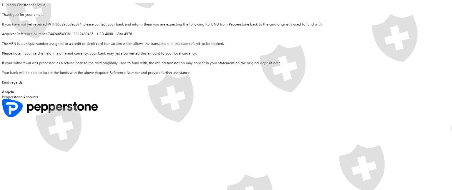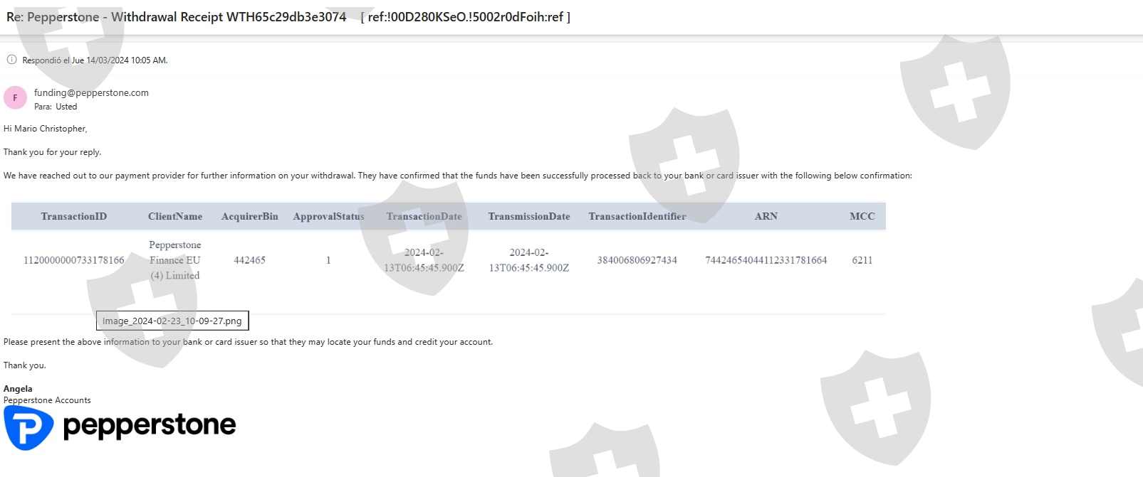 El día 7 de febrero del 2024 solicite un retiro con Pepperstone, el cual fue por 4k usd y hasta la fecha no me ha llegado el retiro, lo hicieron como un reembolso ARN, les he escrito muchísimas veces y lo único que comentan es que lo revise con el banco BBVA, ya esta más que validado con el banco y el capital a un no llega a mi cuenta, nunca había tenido problemas con retiros con este broker hasta ahora y fue por un monto grande, el tema es que he solicitado retiros más pequeños los cuales si han llegado sin problema, solo ese retiro que es más grande, casualmente no me ha llegado