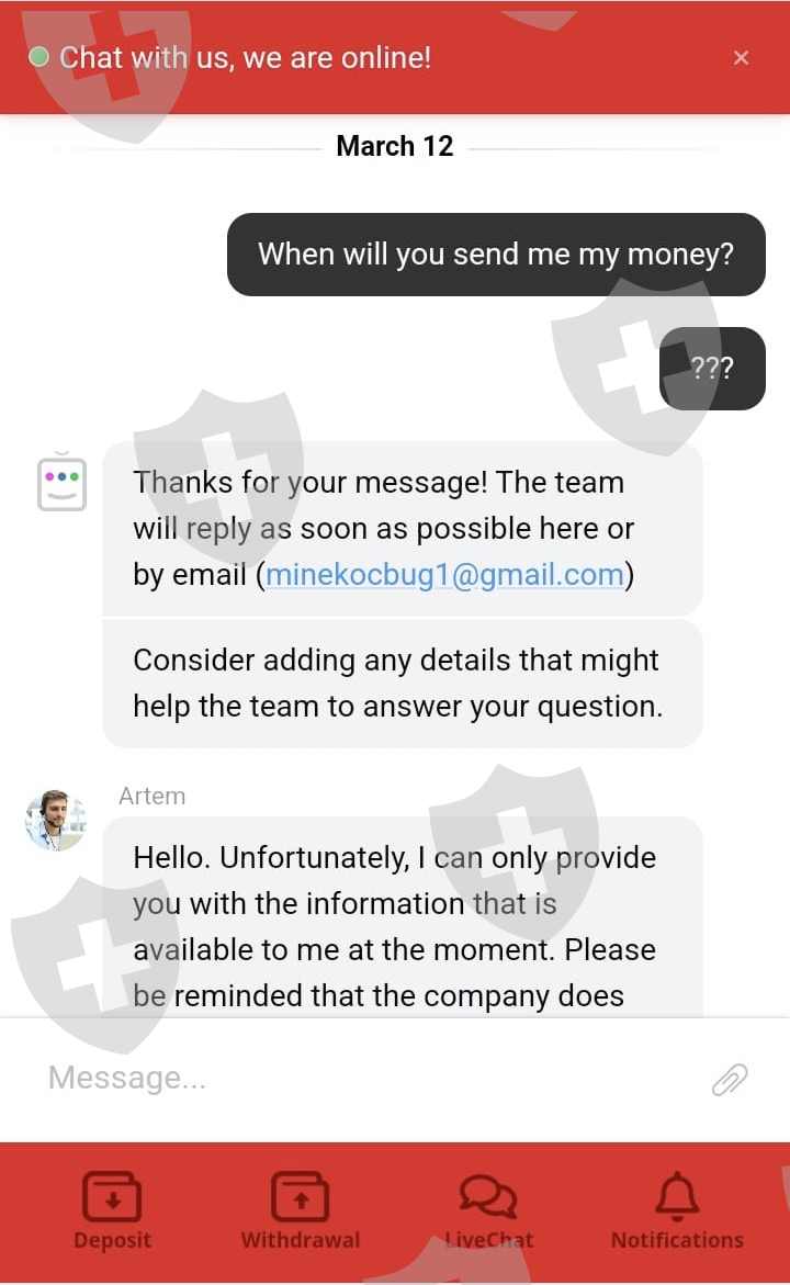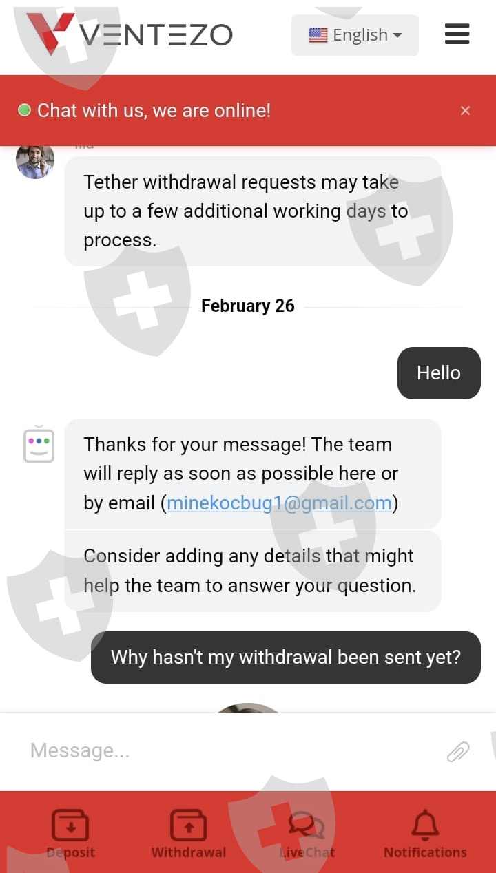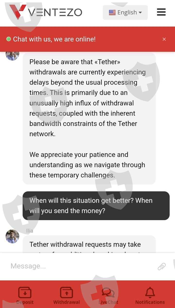Ventezo公司已经超过30天没有给我寄钱了,他们占用了我的钱30天,当我写给在线支持时,他们首先说我们的加密货币提款出现故障,很快会给你寄钱,然后他们不断说财务部门会尽快退还给你,他们一直告诉我要耐心等待。