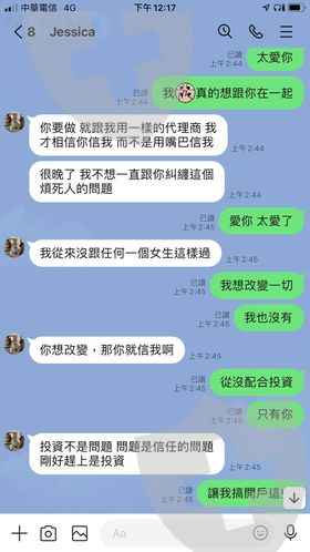 這件事有一陣子了,我之前在網絡交友 遠距戀愛,疑似遇到詐騙事件,就是自稱香港人 跟我談戀愛一個月 然後勸我去投資外匯平台AE global 說他有很強的技術保證獲利,但是因為詐騙事件太多,所以只有入金3萬多,後來操作爆倉他讓我補錢進去他大罵我一頓說我不相信他就封鎖我了。到現在我不確定是不是詐騙