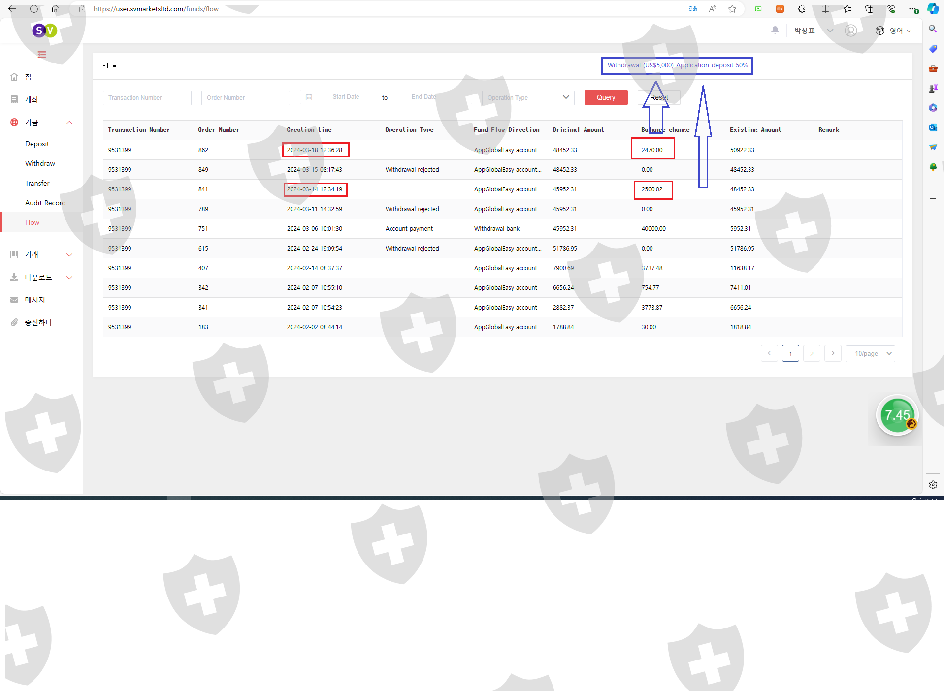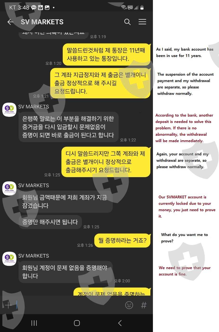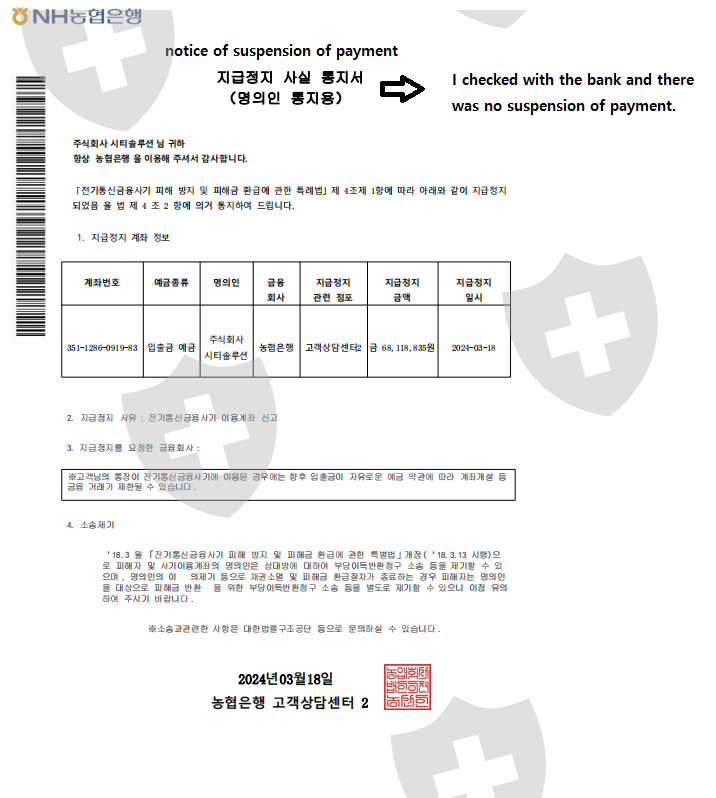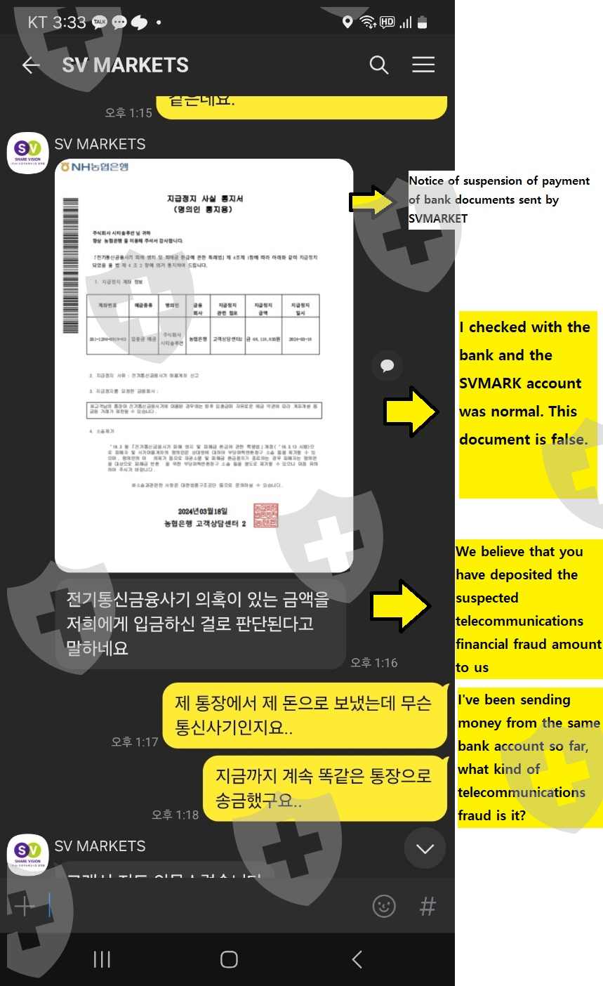 I applied for a $5,000 withdrawal on March 11th, but I made a deposit because I had to deposit 50% of the withdrawal amount as a deposit to make the withdrawal.However, the withdrawal was rejected due to an error in the withdrawal account number, and on March 18, I applied for a $5,000 withdrawal, but I demanded a 50% deposit of the withdrawal amount again.I deposited the 50% deposit again, but now my company's bank account has been suspended from payment, so I sent a suspension of payment issued by the bank, saying that I can't withdraw.But When I checked my suspended bank account, the payment was not suspended. I think it was a deliberate scam that lied to me and refused to withdraw.I'm already asking for a second help.I want to have a good memory of SVMARKET.Please help me make the withdrawal.