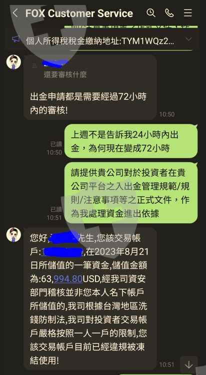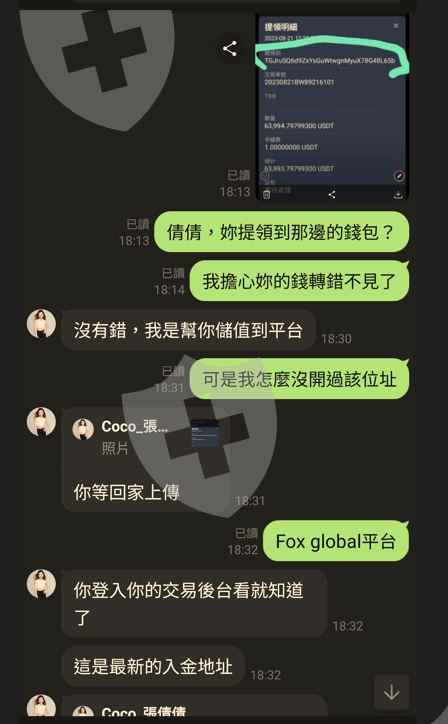 透過Tinder認識女性網友並交換Line ID進一步認識深入聊天以結婚為前提下, 女方提到蜜月旅行所費不貲, 進而介紹本人投資美股指數賺大錢女性網友介紹使用Fox Global交易平台(以USDT)投資外匯 本人資金入出金歷程(幣託-Fox Global), 大筆資金流入Fox Global平台之個人帳戶, 僅早期一筆小額資金(USDT168)成功出金到幣託(Pitopro)本人經過一段時間投資操作Fox Global平台, 並獲利後首度申請出金USDT1,000,0004.3 本人收到Fox Global客服要求先繳納所得稅金USDT112,224, 方能收到所提出之出金金額及再次提領帳戶餘額, 若過期限不繳納則需補繳3%滯納金(每天)成功繳納所得稅金到 Fox Global指定之虛擬錢包地址女性網友自稱幫本人提高投資本金, 主動提領其幣託帳戶資金到我的Fox Global個人平台並提供資金憑證作為證明本人承諾待我能從Fox Global出金投資獲利及本金後, 隨即將借款(USD63,994.8)返還女性網友, 並經女性確認且同意此方式Fox Global客服要求本人必須對該筆非本人名下儲值金USD63,994.8以本人名義進行重新儲值, 方能重新啟動所提之出金申請流程此時啥驚覺被騙