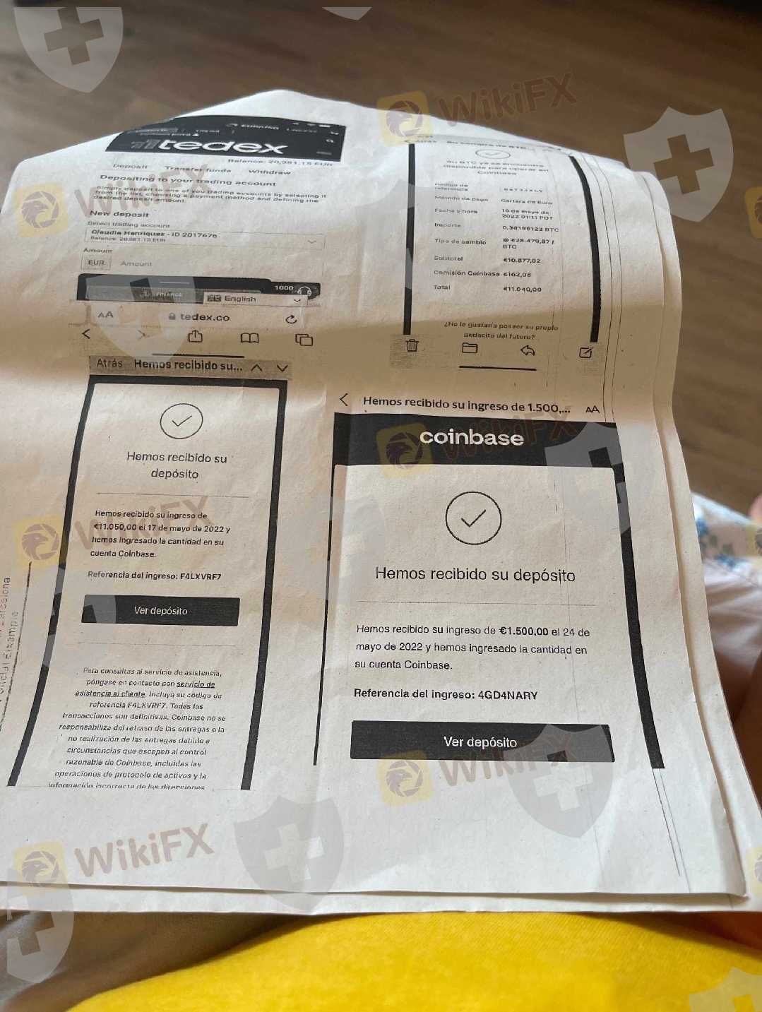 经纪人 Tedex.co 骗了我 12,800 欧元,首先我通过 Carda 进行了转账,然后一位顾问联系我投资更多的钱,所以他让我在我的 Anydesk 笔记本电脑上下载它,然后他进入我的电脑在我位于西班牙巴塞罗那的银行 Caixabank 进行贷款承诺三天内归还,然后提现,他告诉我在英国纳税,我在那里转了1500欧元,我意识到我被骗了