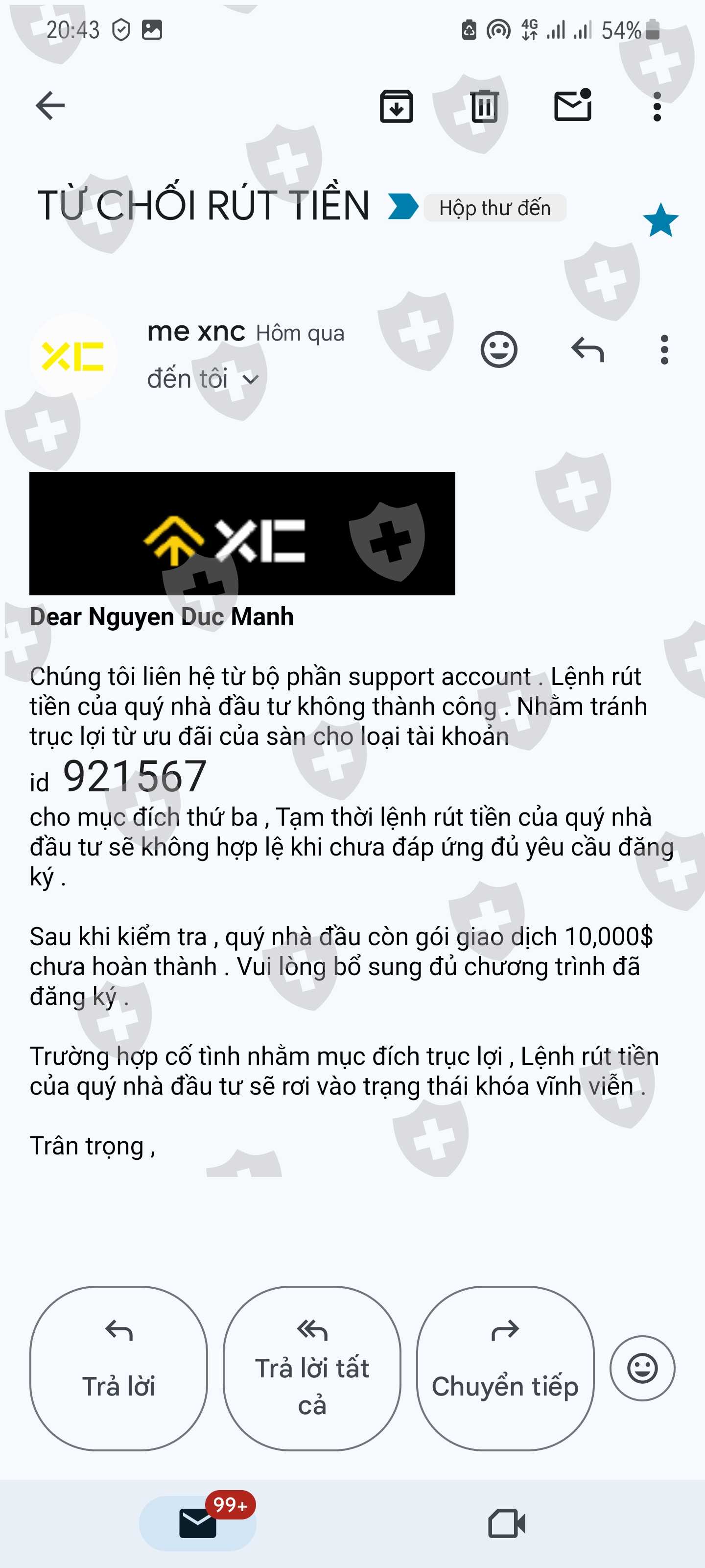 và tiếp tục tôi nhận email phản hồi là hoàn thành gói hồ sơ 10.000 $. ( tôi không đăng ký mà bắt tôi phải nạp 10.000$)
