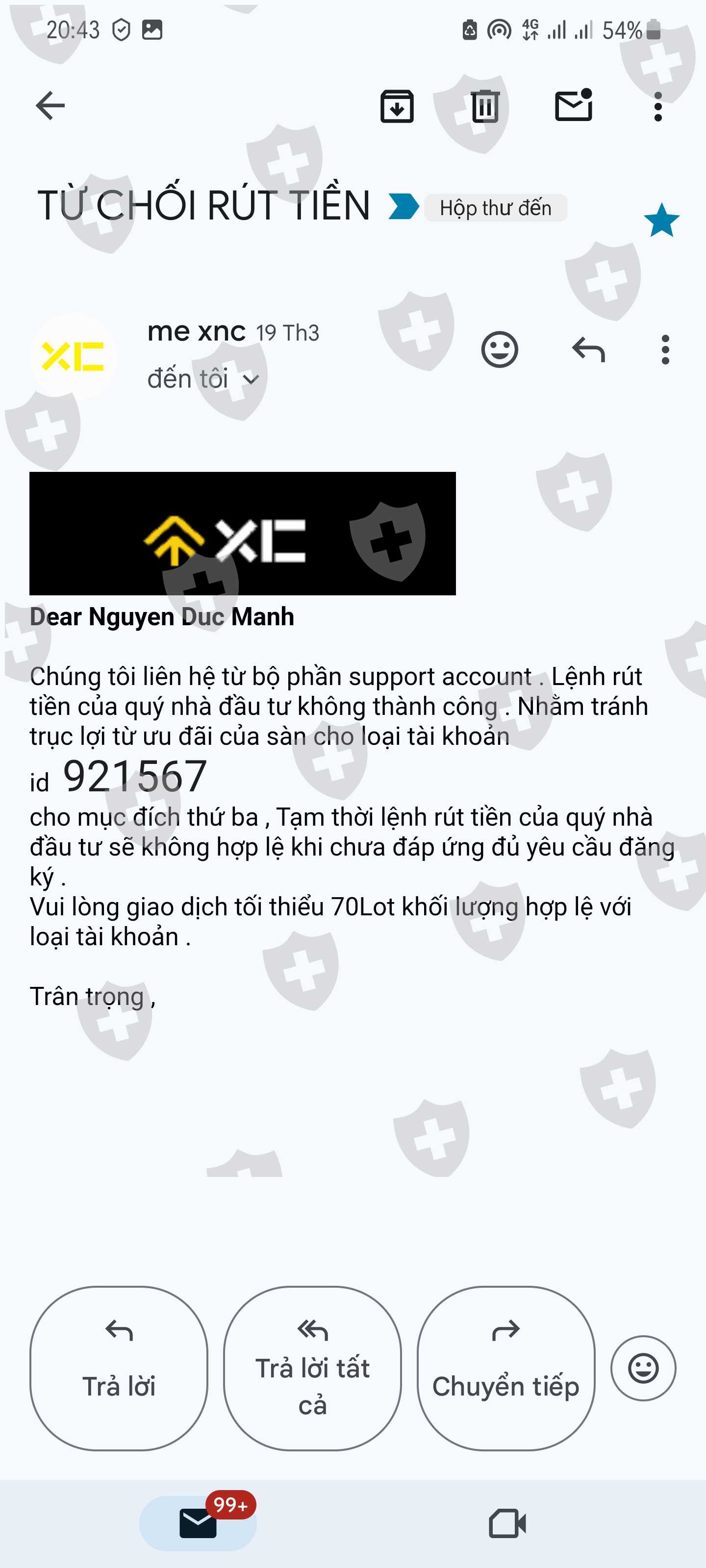 tôi nhận được email phản hồi giao dịch 70 lot (tôi đã giao dịch đủ trên 70 lot)