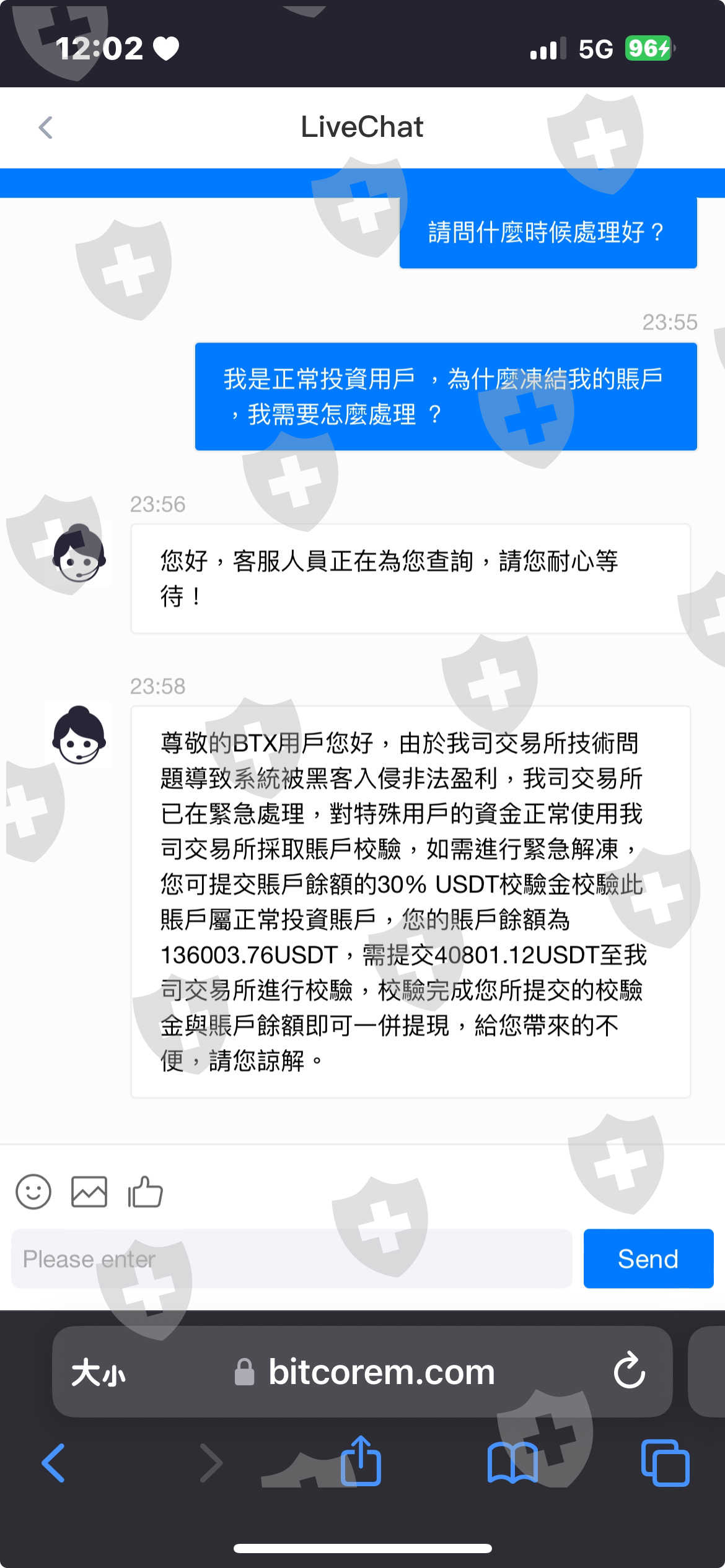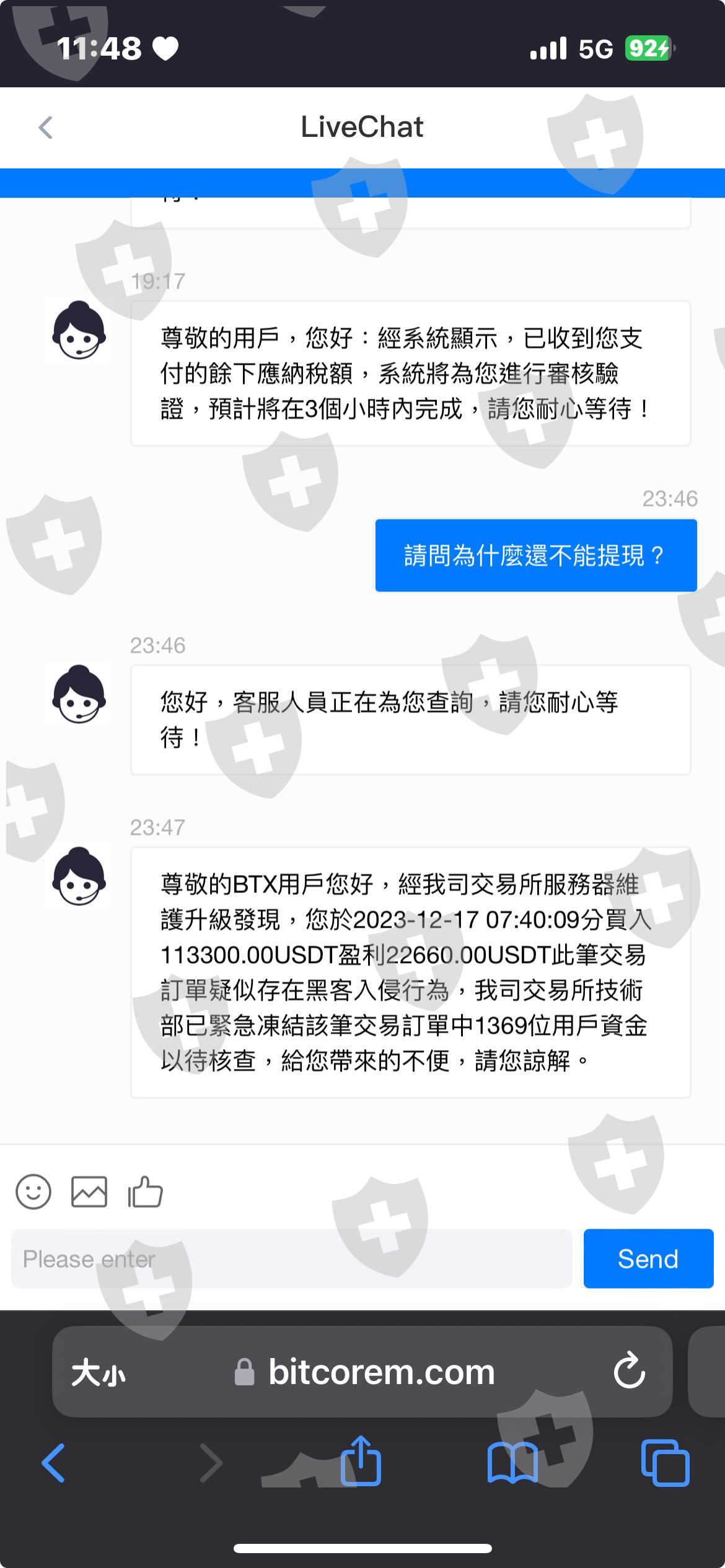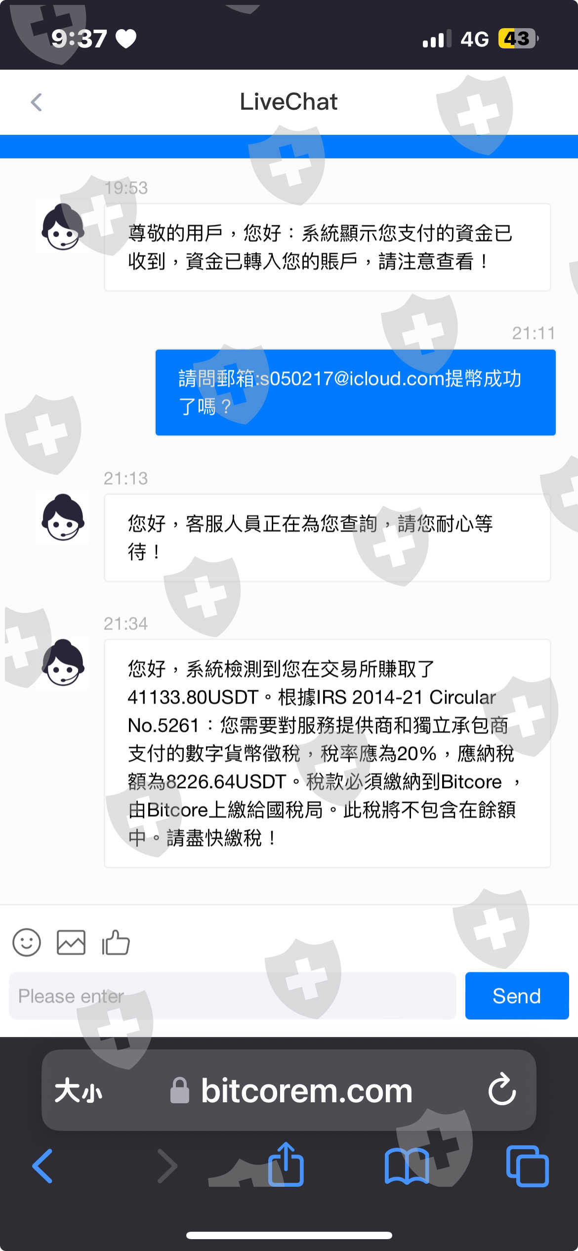 11月初在網上認識大陸男頻繁聊天一段時間後說要帶我賺錢就下載一堆app然后找了幣商買幣入火幣在轉到Bitcore這個網站的錢包第一次放3萬有賺到8千塊,後面要求放全部的錢還打電話要求我去貸款用更多的錢,說數據不是每次都有要好好保握,然后就真的傻傻把自己的錢都投下去了(30萬)後來等拿出來的時候發現要繳稅20%只好去銀行貸款20萬還不夠後面部分是大陸男說把公司車拿去貸款才補上的,結果繳完又說什麼疑似駭客入侵的要繳效驗金沒辦法只好去民銀貸款24萬補上在跟朋友借4萬2補上後面又要等60-90天?!大陸男還要我去找錢領出來到現在還想騙我