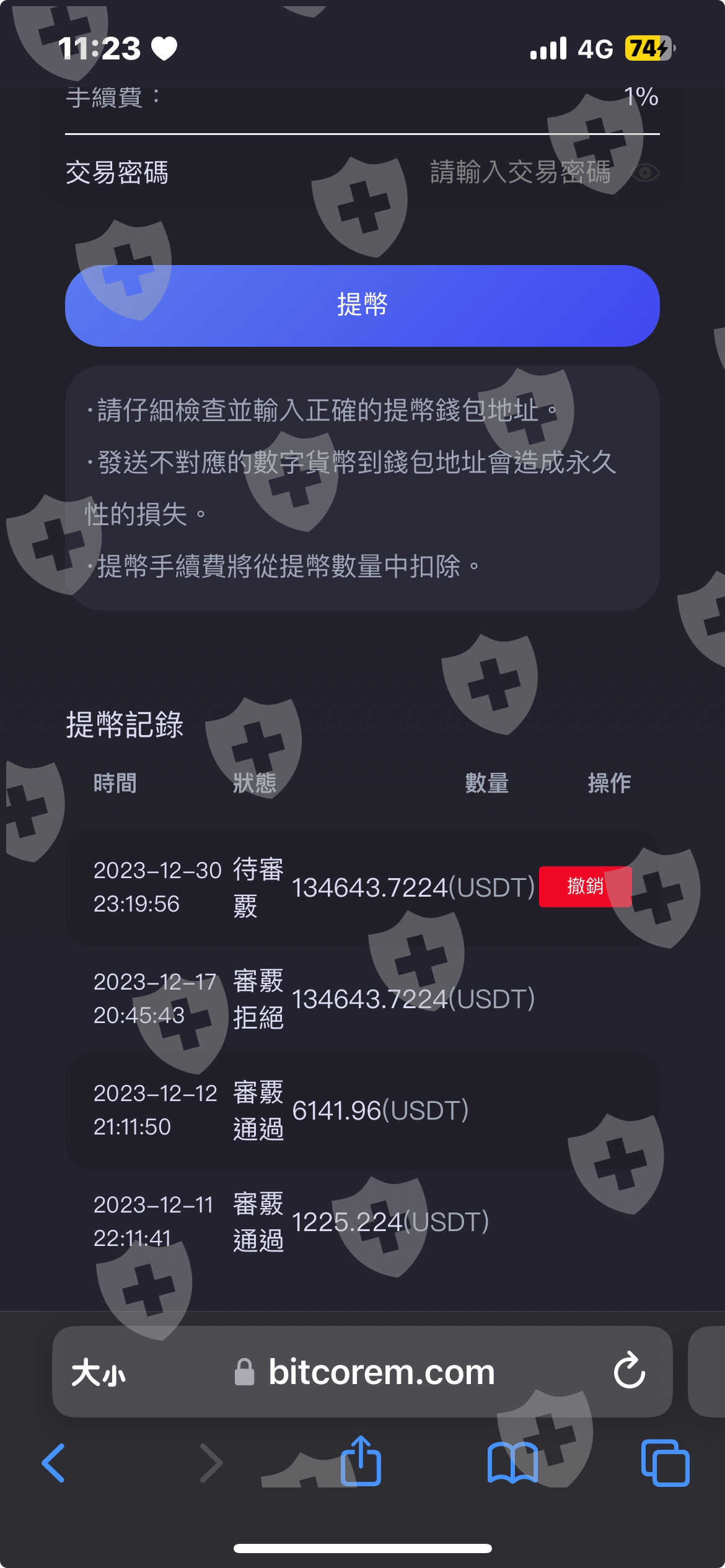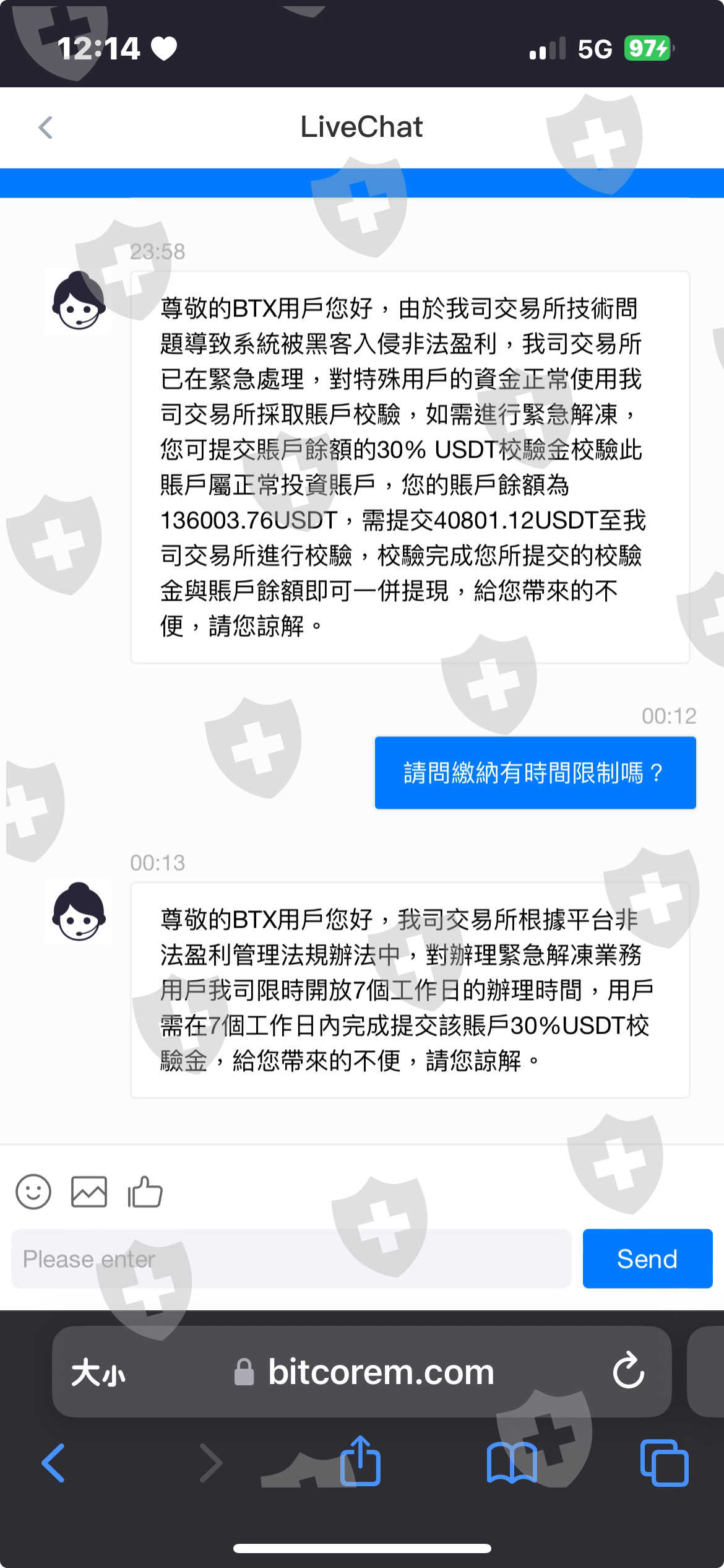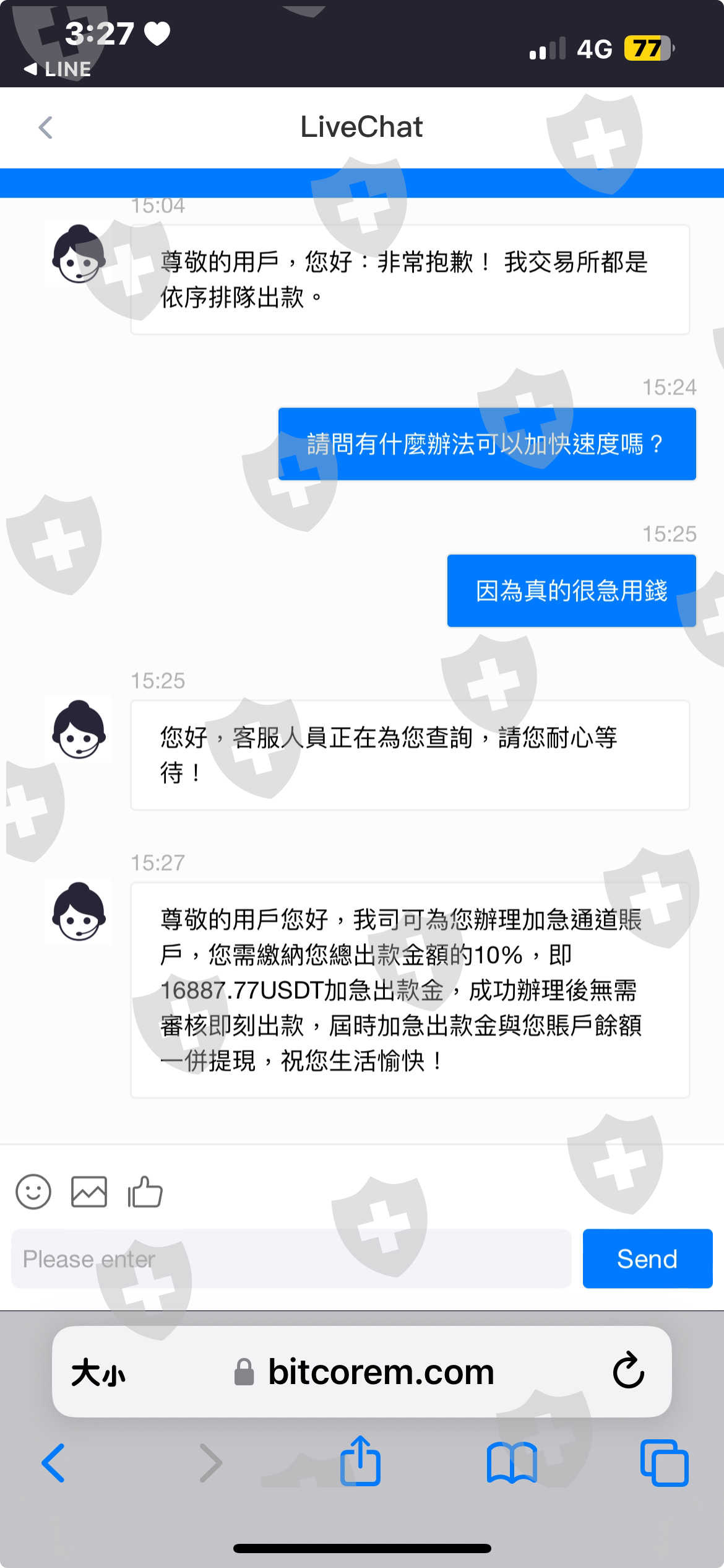 11月初在網上認識大陸男頻繁聊天一段時間後說要帶我賺錢就下載一堆app然后找了幣商買幣入火幣在轉到Bitcore這個網站的錢包第一次放3萬有賺到8千塊,後面要求放全部的錢還打電話要求我去貸款用更多的錢,說數據不是每次都有要好好保握,然后就真的傻傻把自己的錢都投下去了(30萬)後來等拿出來的時候發現要繳稅20%只好去銀行貸款20萬還不夠後面部分是大陸男說把公司車拿去貸款才補上的,結果繳完又說什麼疑似駭客入侵的要繳效驗金沒辦法只好去民銀貸款24萬補上在跟朋友借4萬2補上後面又要等60-90天?!大陸男還要我去找錢領出來到現在還想騙我