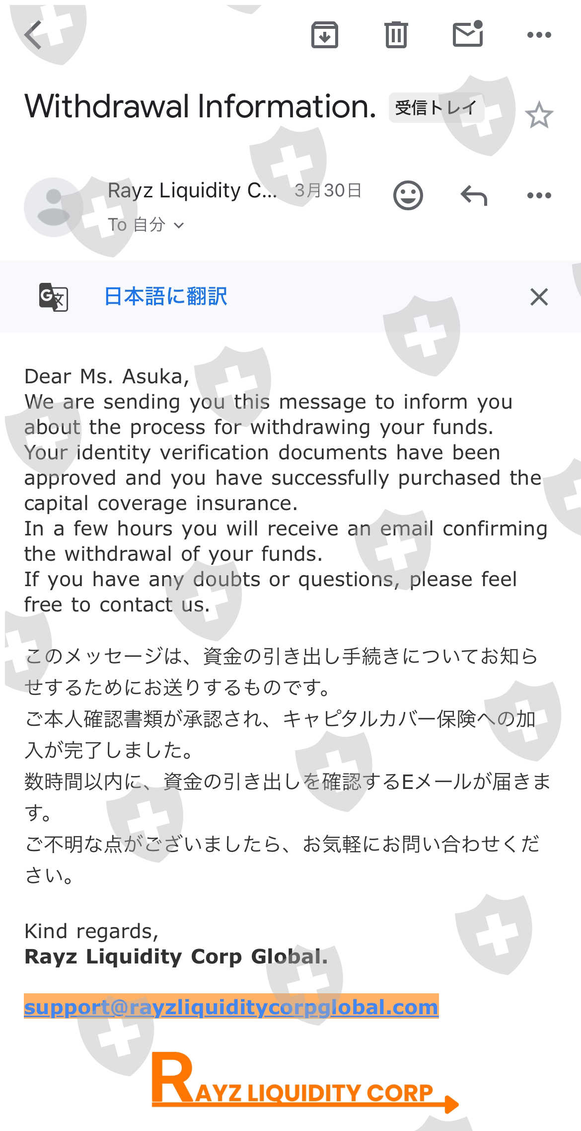 3月14日にRayz本社から連絡があり、日本の支店で何が起こったのかを説明し、出金するための解決策を提案してくれました。