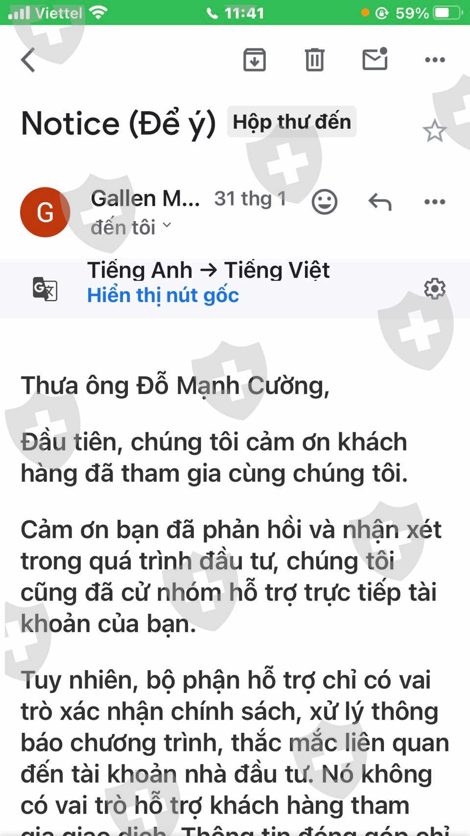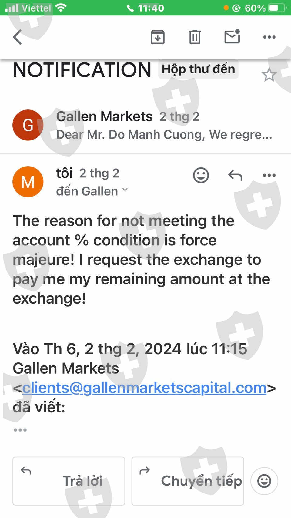 Ngày 16/1/2024 tôi có một tư vấn tự do giới thiệu vào tham gia sàn Gallen Capital , tôi thấy tên sàn của Thuỵ Sỹ nên cũng yên tâm tham gia , đầu tiên tôi vào 100 đô để thử xem nạp rút có được nhanh không , sau đó có rút thử ra 50 đô thì mọi việc diễn ra nhanh và bình thường mặc dù phí nạp rút rất cao so với các sàn khác , nạp vào 24500 thì nhận được 100 đô , nhưng rút 1000 đô thì chỉ nhận lại 23700 , tức là phí nạp rút là 800.000 vnd/1000 usd , sàn có giải thích là bên ngân hàng họ thu thế ( Ngân hàng MSB ) người nhận là Công Ty Thương Mại Toàn Cầu . Tiếp theo tôi có vào 2000 usd để tiếp tục giao dịch , sau khi tôi vào 2000 usd thì có người tên Khánh ( Số dt 076-2258504) có liên lạc với tôi nói là phụ trách quỹ của sàn và mời tôi tham gia gói 15000 usd để nhận các ưu đâi cua sàn , Khánh có gọi cho tôi rất nhiều để bảo tôi vào gói 15000 nói rằng gói này lâu lắm mới có và rất nhiều người muốn nhận được gói này , nếu không tham gia ngay thì sẽ mất cơ hội tốt này , sau đó tôi có nói chuyện lại với Thiện , thì Thiện bảo sẽ tham gia cùng với tôi khoảng 6000 đô . Sau đó tôi có chuyển vào tài khoản của sàn 193 triệu và báo với Thiện vào nốt số tiền thì Thiện lý do là chưa xoay được tiền . Tôi báo lại với sàn thì sàn bắt tôi phải vào đủ số tiền 15 ngàn , tôi nói tôi không còn dủ tiền để vào nữa sàn không chịu và bắt tôi phải giao dịch cho đủ ký quỹ mới duyệt lệnh rút tiền , sau đó sàn chặn lệnh rút tiền cua tôi , tiếp theo thì thằng Khánh chuyển hồ sơ của tôi qua cho thằng David Trần để tiếp tục xử lý , thằng David Trần bảo tôi đi lệnh rất lớn với mục đích cho tôi mau cháy tài khoản , sau đó tôi không giao dịch nữa , tôi vào đăng ký rút tiền thì bị khoá cổng vào trang của sàn để rút tiền . Sau đó tôi có gọi lại cho thằng Khánh thì nó cứ bắt tôi phải giao dịch cho đủ ký quỹ nó mới duyệt lệnh rút tiền , tiếp đó có 1 thằng kết bạn và gửi tin nhắn nói là người của sàn tên Cường Phạm sẽ giúp tôi giao dịch tốt hơn , tôi giao dịch theo mã nó gợi ý là mã Wheat(CME), vừa vào 0,5 lot thì tài khoản bị âm 32500 đô và cháy tài khoản luôn . Tôi gửi kèm theo hình ảnh đây để mọi người xem . Đây là 1 sàn lừa đảo nếu ai còn giao dịch hoặc định đầu tư vào sàn này thì phải dừng lại ngay . Tôi rất tức vì đã bị bon nó lừa để đầu tư tiền vào đây , tôi viết bài này để mong cộng đồng mạng và nhà chức trách hãy bắt ngay bọn sàn Gallen Capital này .