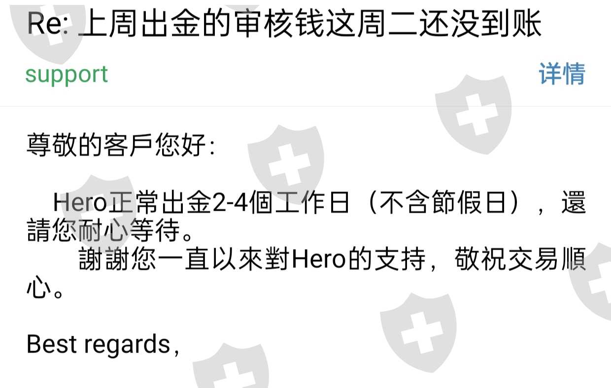 hero官方开始说二到四个工作日出金,结果超过四个工作日,发邮件到hero邮箱又改口说进日出金