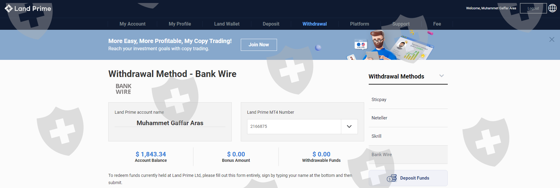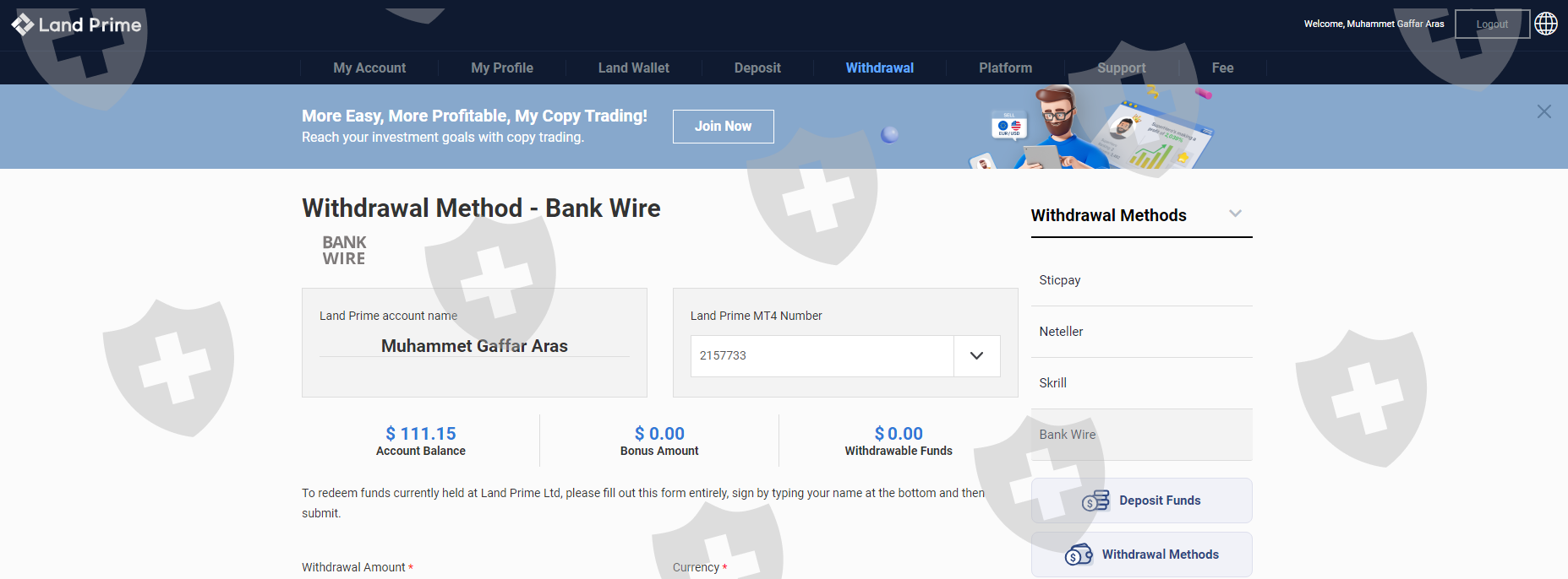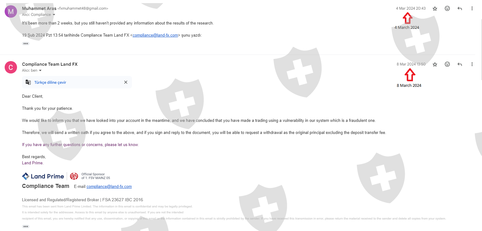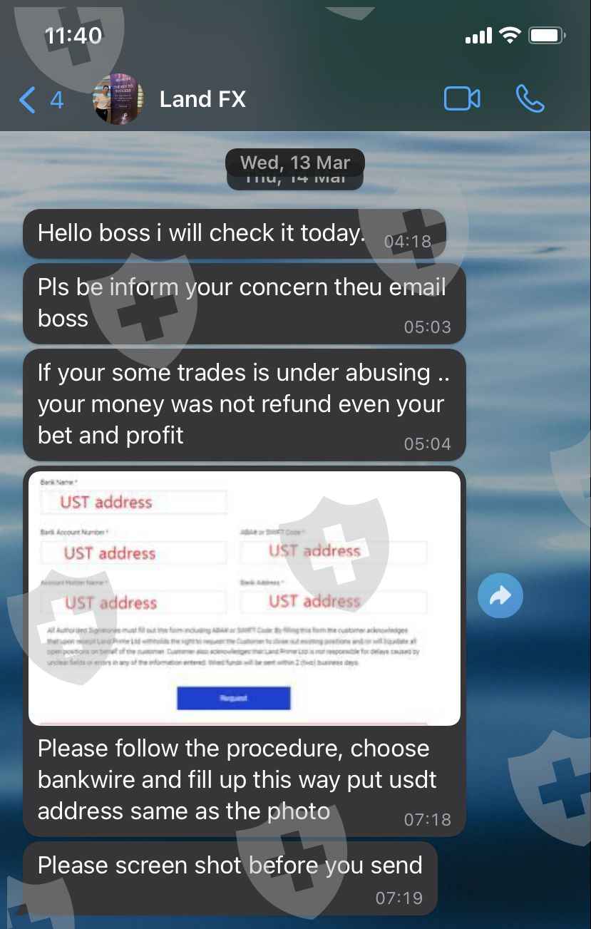 I worked with land fx company for about 1 month. When I wanted to withdraw money after this period, they kept my request waiting for a long time. And then they told me that I could not receive my profit, I could only receive my principal, and if I accepted this situation, I had to sign the document they sent. So I signed this document. And the WhatsApp support line told me that if I write my TRC20 address in the bank transfer section when withdrawing my main money, the money will reach me faster, but my money has still not reached me for more than 3 weeks and I cannot get any response from Land Fx company.