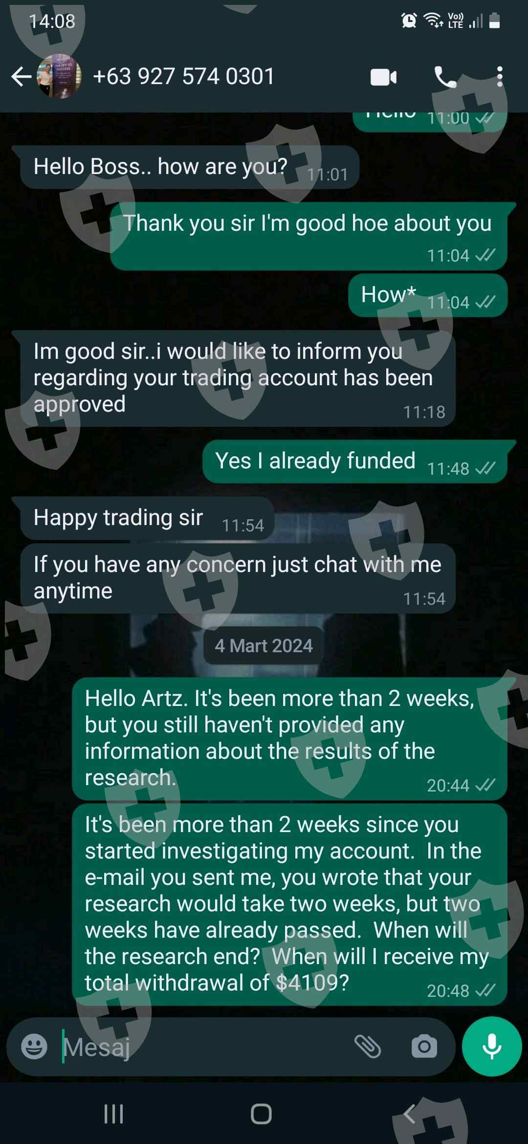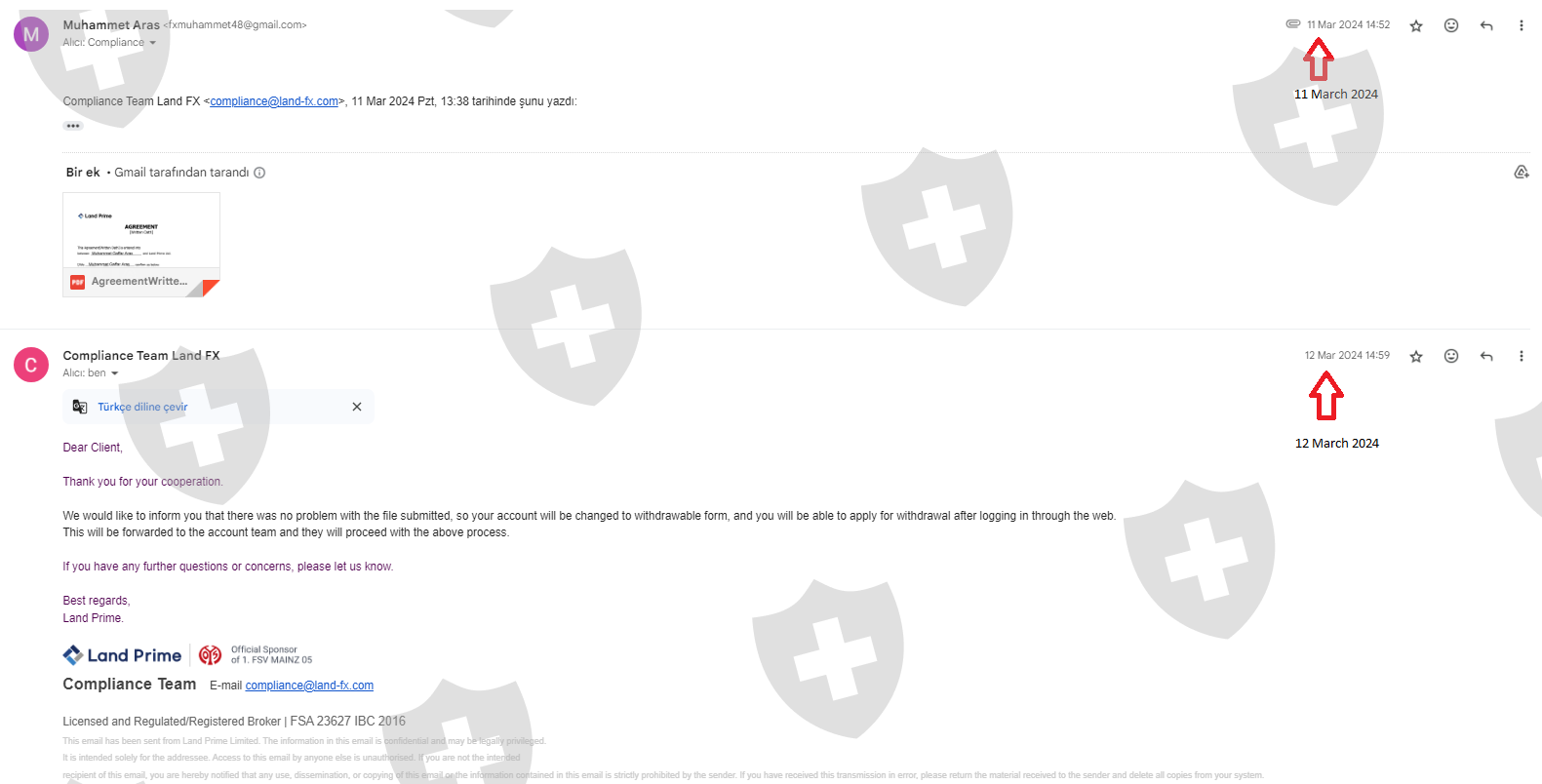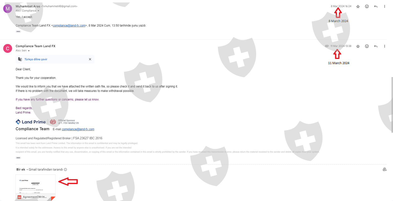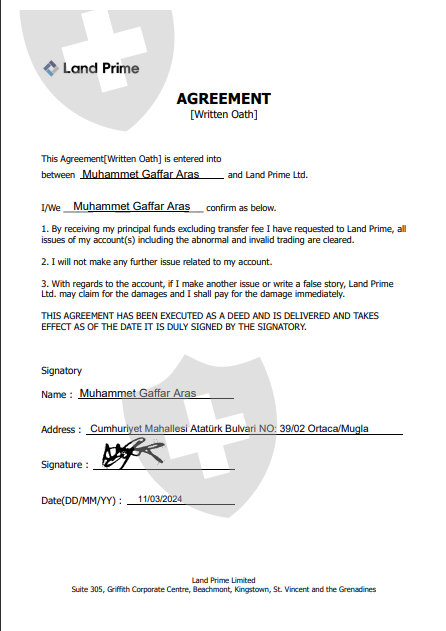 我在 Land Fx 公司交易了大约一个月。一个月后,我想出金,他们却让我等了很久。然后他们还说我不能出盈利,只能出本金。如果我能接受,就必须签署他们发来的文件。于是我签了这份文件。而 WhatsApp客服热线告诉我,如果我在出金时在银行转账一栏写上TRC20 地址,钱就会更快到账,但我的钱已经超过 3 周仍未到账,我也无法从 Land Fx 公司得到任何回复。