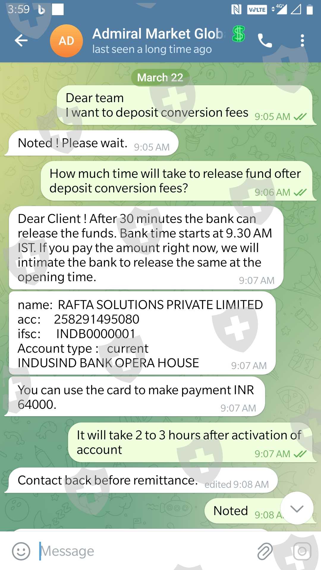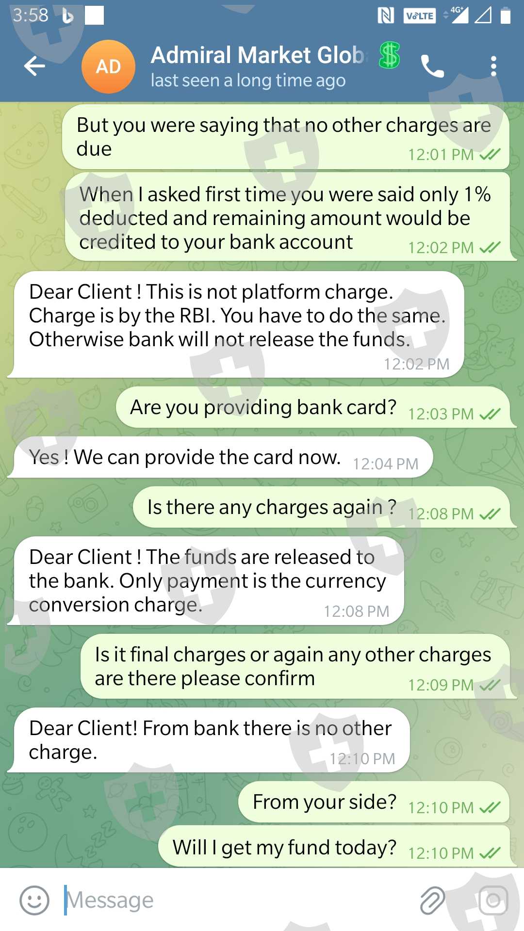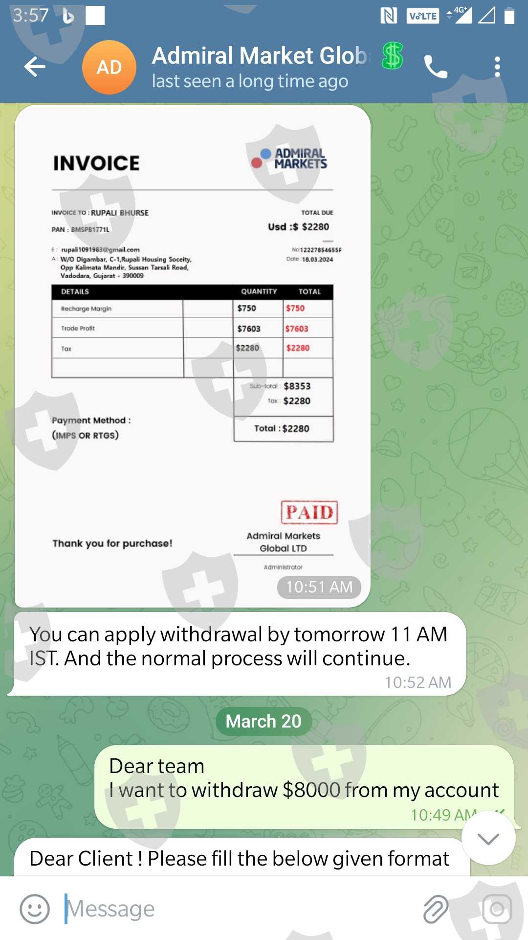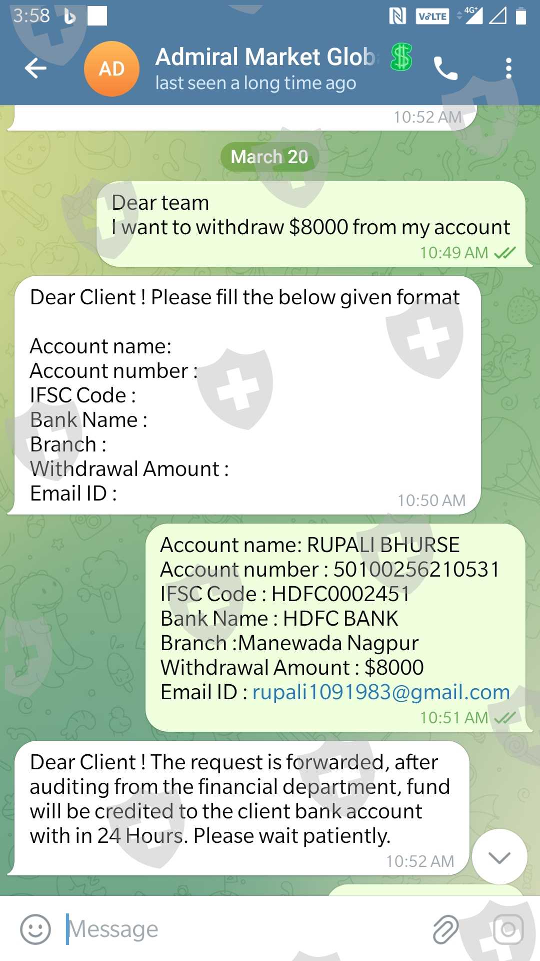 I have done trading with Admiral Markets Global ltd.My wallet balance is $ 10696 as on date.When I was applied for withdrawal of $ 8000,the platform asked me to deposit 30% tax on total profit.I deposited tax . After that they asked to deposit conversion fees10% of withdrawal amount.Afer paying all dues the platform is not refund my withdrawal since 20 days.