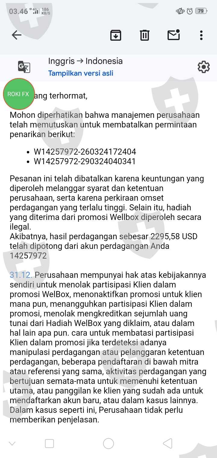31.12. Perusahaan mempunyai hak atas kebijakannya sendiri untuk menolak partisipasi Klien dalam promosi WelBox, menonaktifkan promosi untuk klien mana pun, menangguhkan partisipasi Klien dalam promosi, menolak mengkreditkan sejumlah uang tunai dari Hadiah WelBox yang diklaim, atau dalam hal lain apa pun. cara untuk membatasi partisipasi Klien dalam promosi jika terdeteksi adanya manipulasi perdagangan atau pelanggaran ketentuan perdagangan, beberapa pendaftaran di bawah mitra atau referensi yang sama, aktivitas perdagangan yang bertujuan semata-mata untuk memenuhi ketentuan utama, atau panggilan ke klien yang sudah ada untuk mendaftarkan akun baru, atau dalam kasus lainnya. Dalam kasus seperti ini, Perusahaan tidak perlu memberikan penjelasan.
