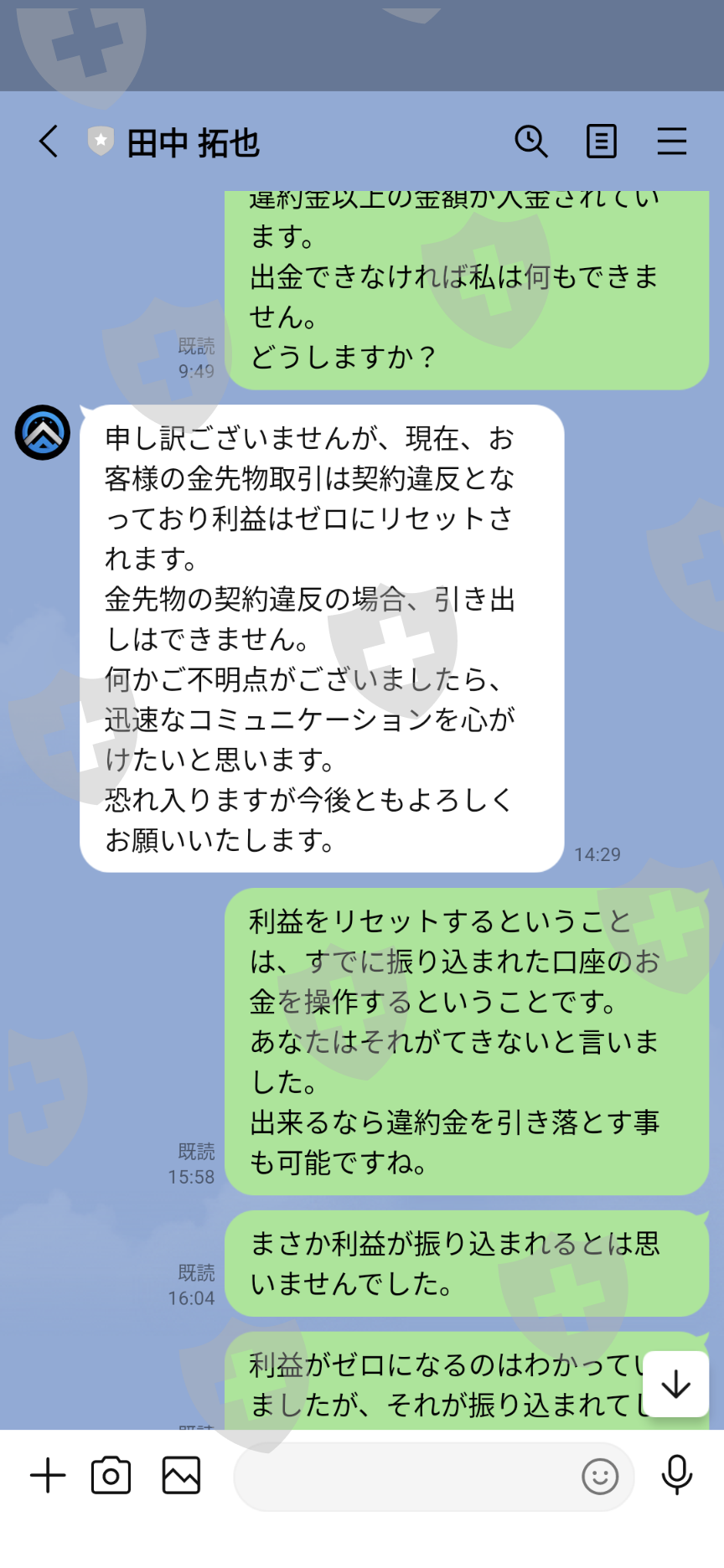 我被邀请加入小组,讨论从高股息股票转向外汇投资。我看到本乡先生和他的朋友在Line群里发帖说自己是长途司机。它立即被取消,但我仔细看了看。经确认,相同的内容以不同的名义在LINE上发布,并且他们扮演着多个角色。最初,他们说罚款将从他们的外汇账户中扣除,但他们改变了说法,称他们必须另外支付近700万日元。我的账户上还有余额,所以尽管我要求他们提款,他们却告诉我这是违约行为,如果我不付款,我的账户就会被冻结。我通过电子邮件联系了澳大利亚支持人员,但当我告诉他们同样的事情时,他们与我失去了联系。我无法再登录我的帐户。我支付了280万日元,账户里有16万美元。