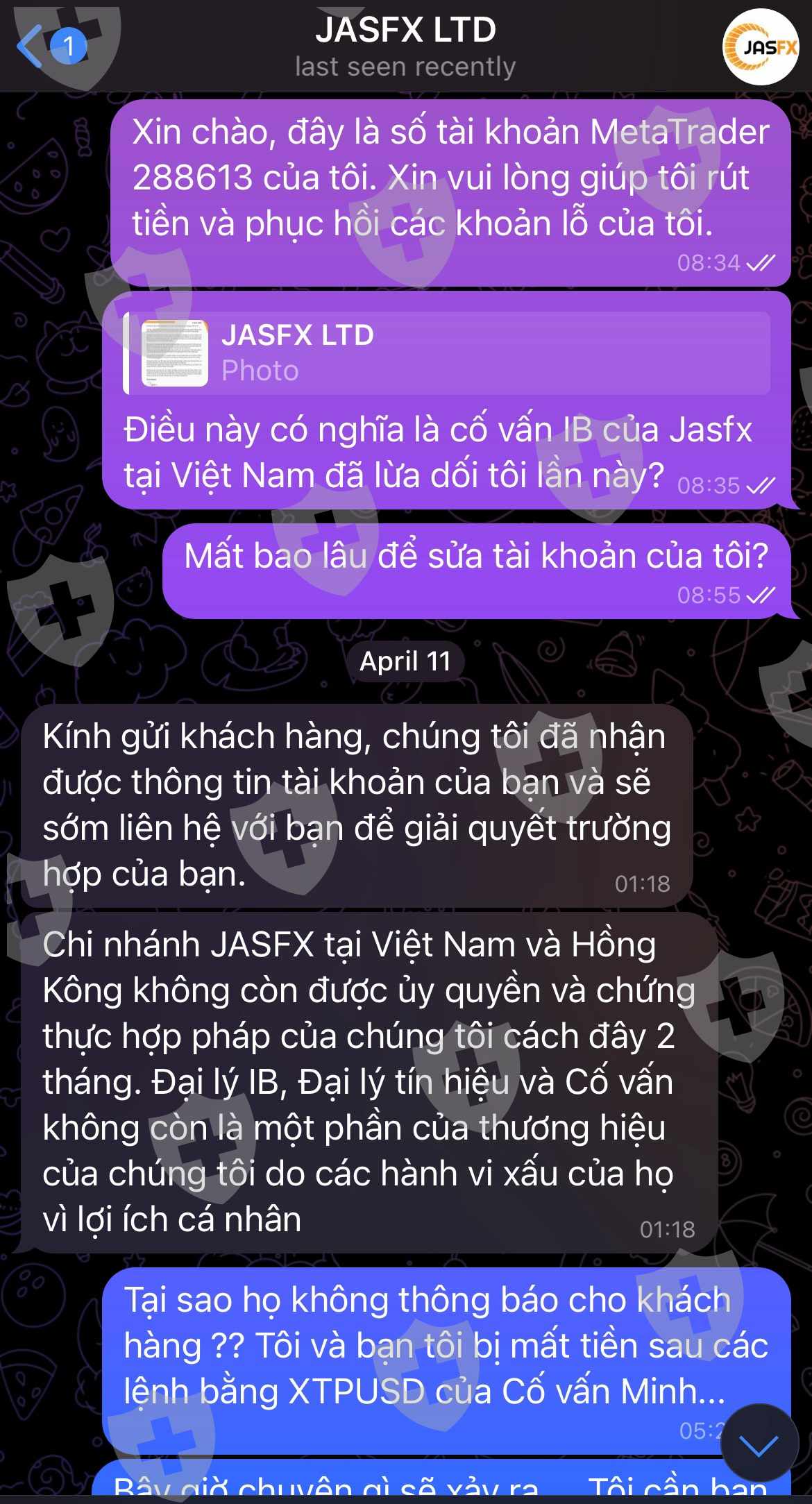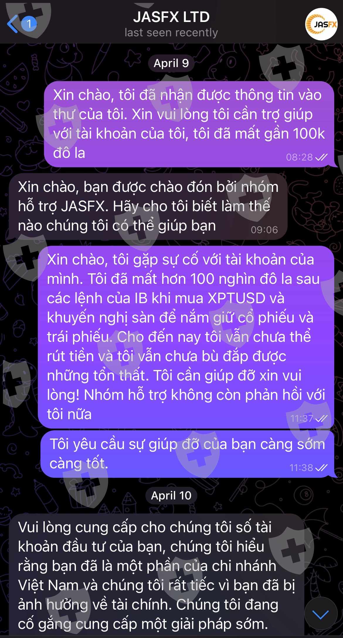Tôi đã gặp anh Minh vào tháng Mười Một và anh ấy đã giới thiệu cho tôi các khoản đầu tư với nhà môi giới JASFX. Khi mọi thứ đang diễn ra tốt đẹp, tôi quyết định đầu tư 200 nghìn đô la. Tôi làm theo lệnh mua bán của anh Minh, có một số lợi nhuận nhưng sau đó lỗ hơn 100k đô la. Khi tôi nhờ anh ấy giúp đỡ, anh ấy bảo tôi đặt cọc thêm một ít nữa và chúng tôi sẽ sớm lấy lại mọi thứ. Tôi tiếp tục làm theo lệnh của cố vấn Minh và liên tục thua lỗ. Vì vậy, tôi yêu cầu rút tiền nhưng anh Minh không trả lời. 5 ngày trước, tôi đã nhận được một tin nhắn từ trụ sở chính của JASFX nói với tôi rằng chi nhánh của họ tại Việt Nam không có ủy quyền và hãy rất cẩn thận. Cố vấn Minh đã nói dối tôi suốt thời gian qua chỉ để tôi mất tiền !!