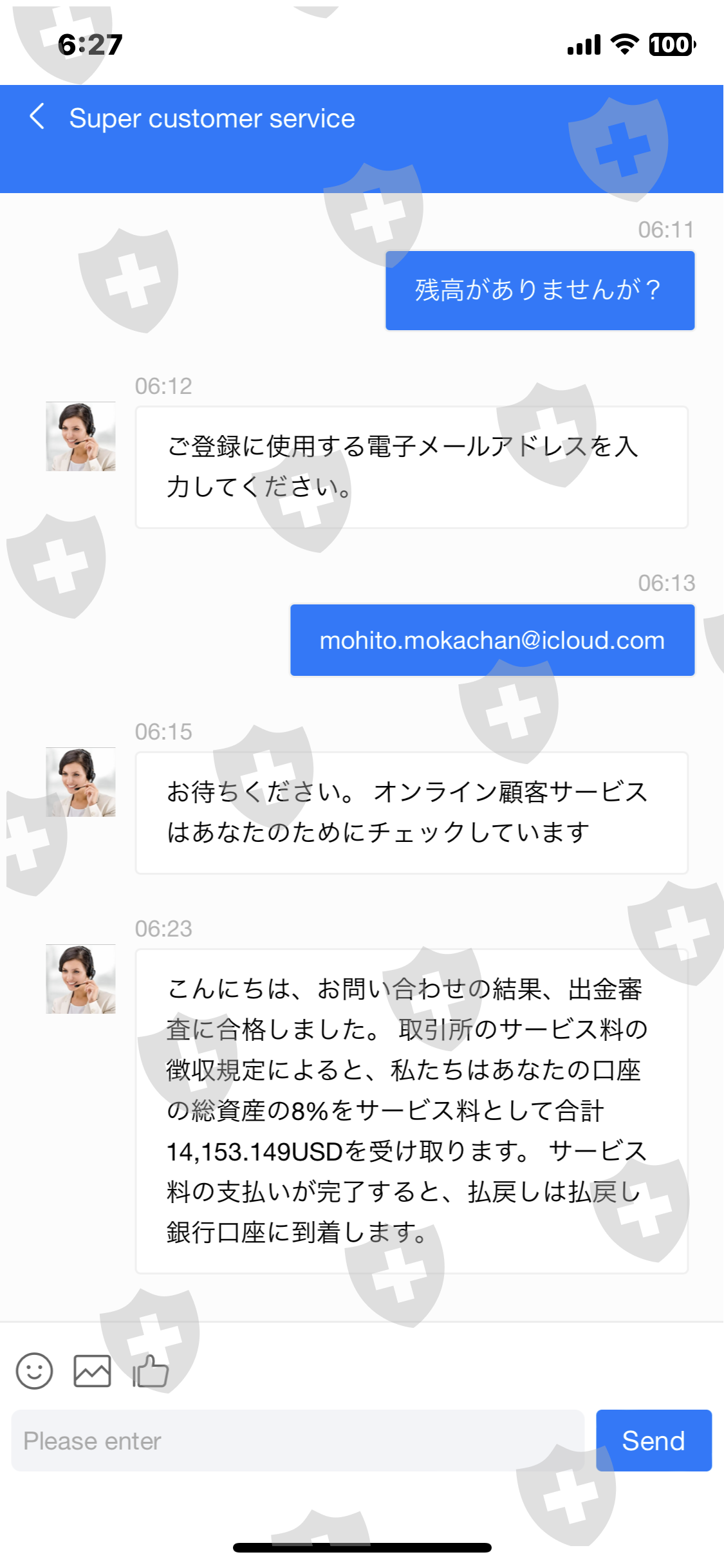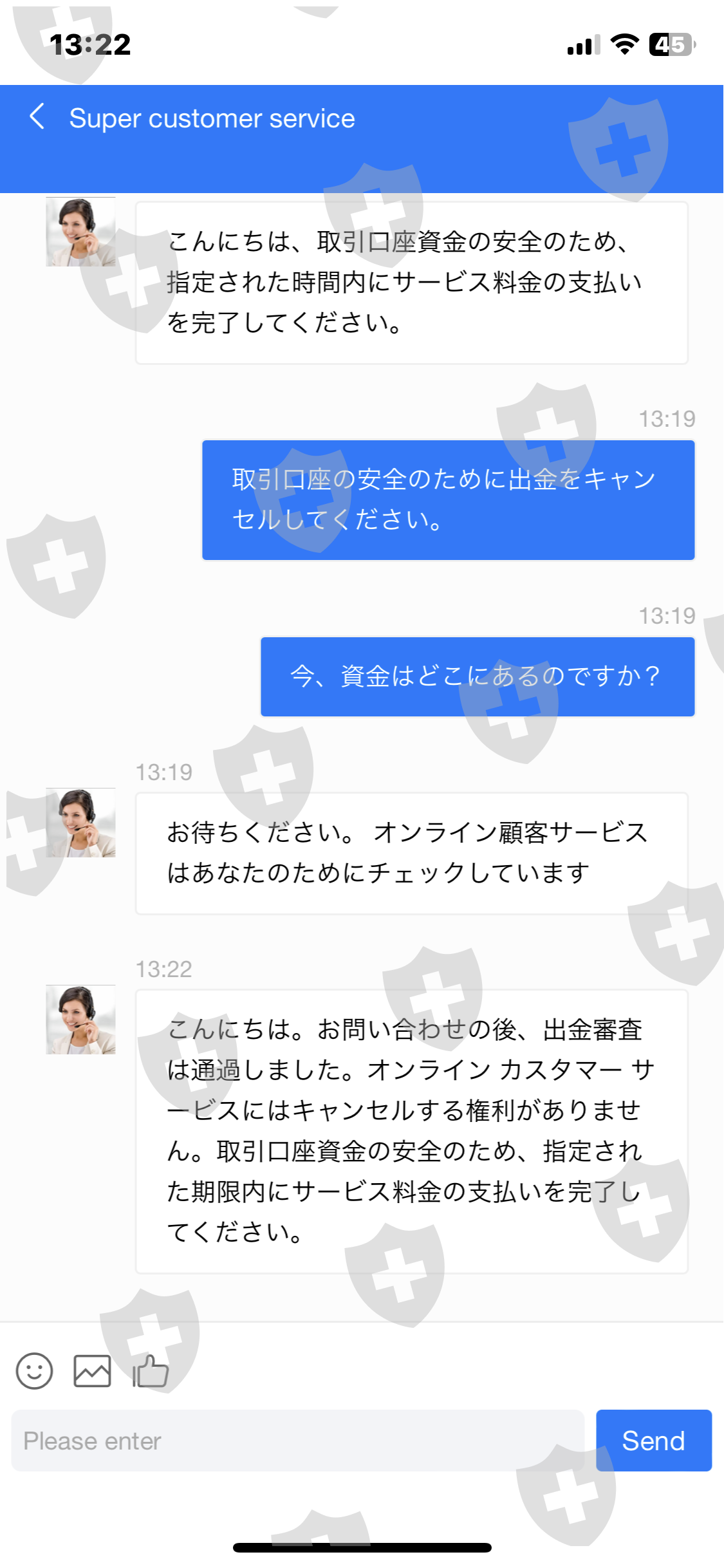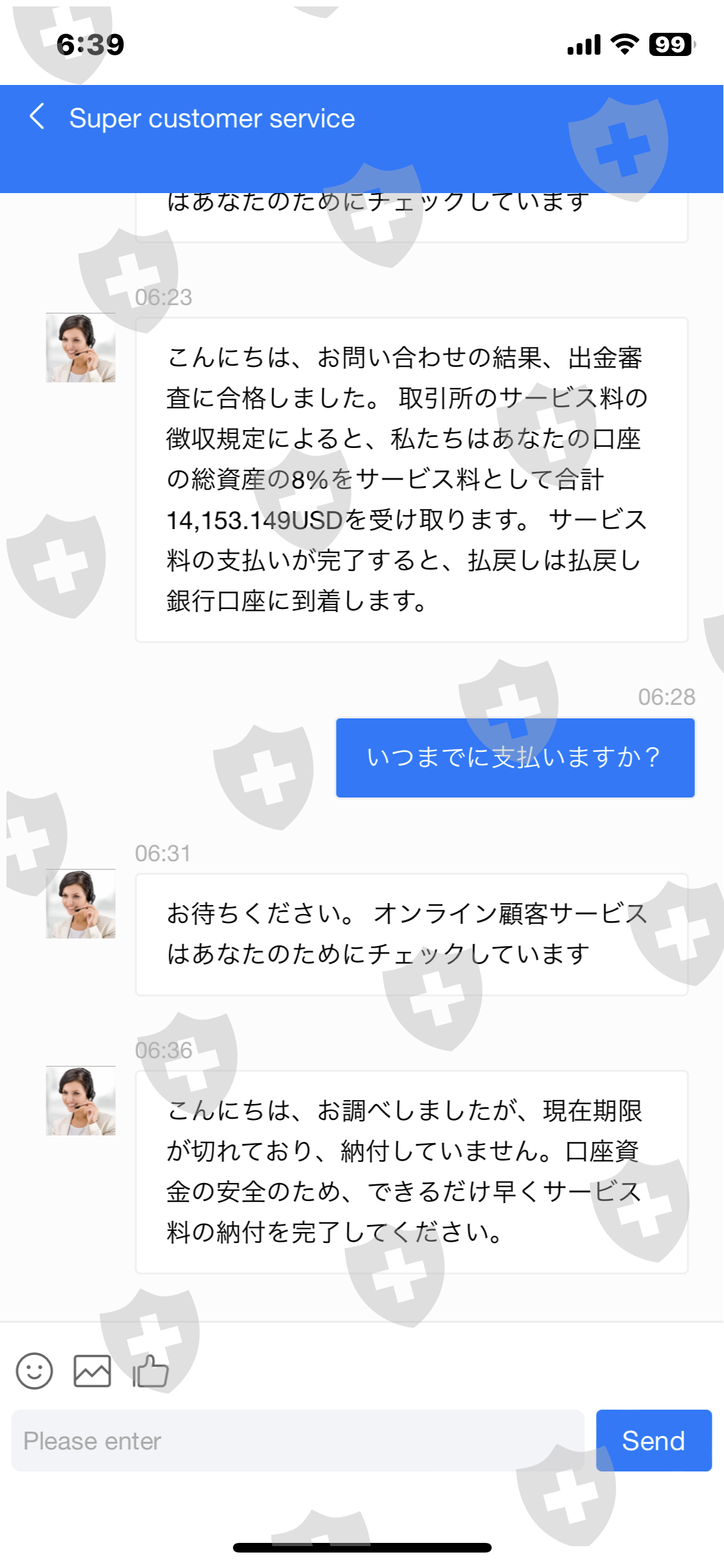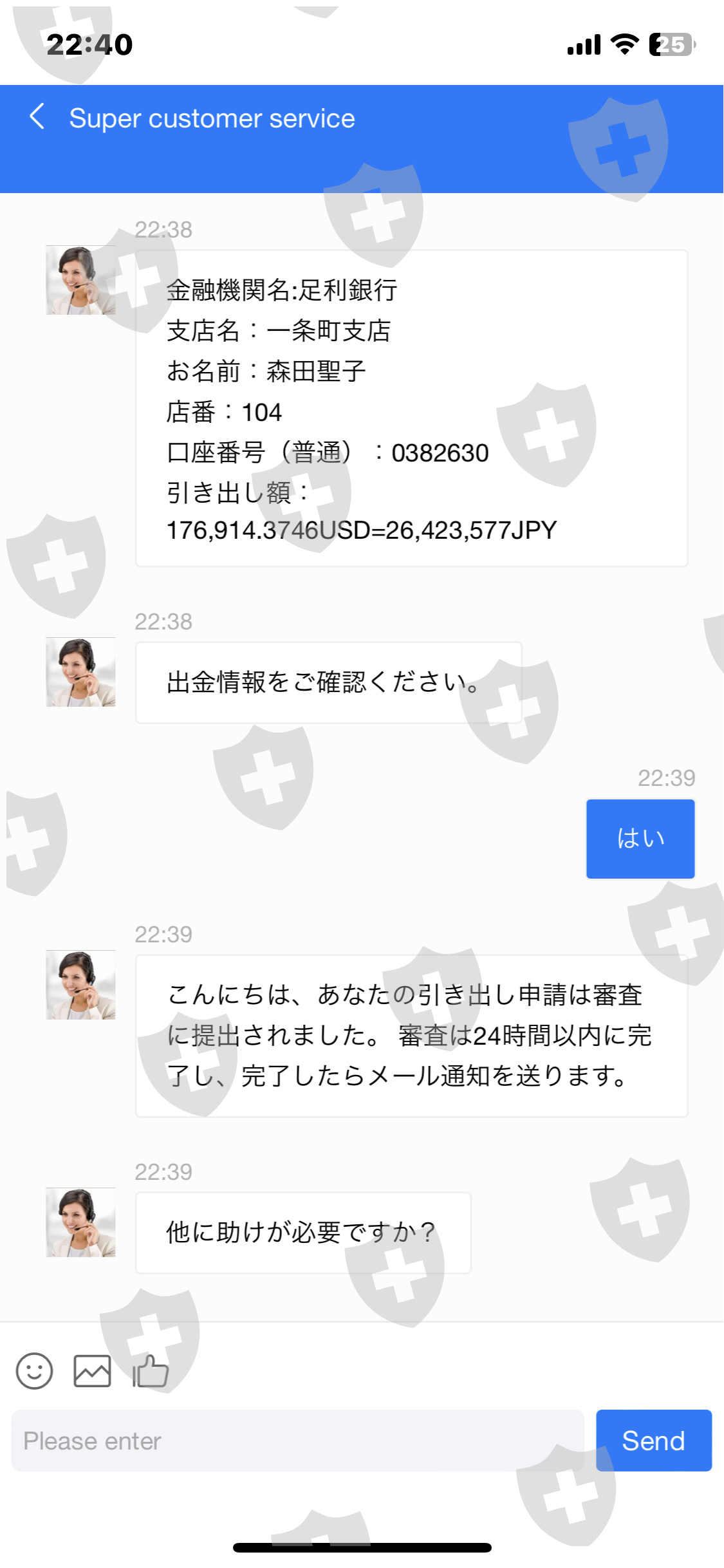 我安装了该应用程序,出示了我的 ID,并开设了一个帐户。根据客服提示多次存入您的个人账户。我在数十笔交易中获利。当我要求全额提款时,我被要求在3天内支付20%的服务费。由于无法付款,我要求他们停止提款,但已经批准了。如果3天内不付款,就会被冻结。该交易是按照自称韩国人的汉克在 LINE 上的指示进行的。损失总额为 950 万日元。