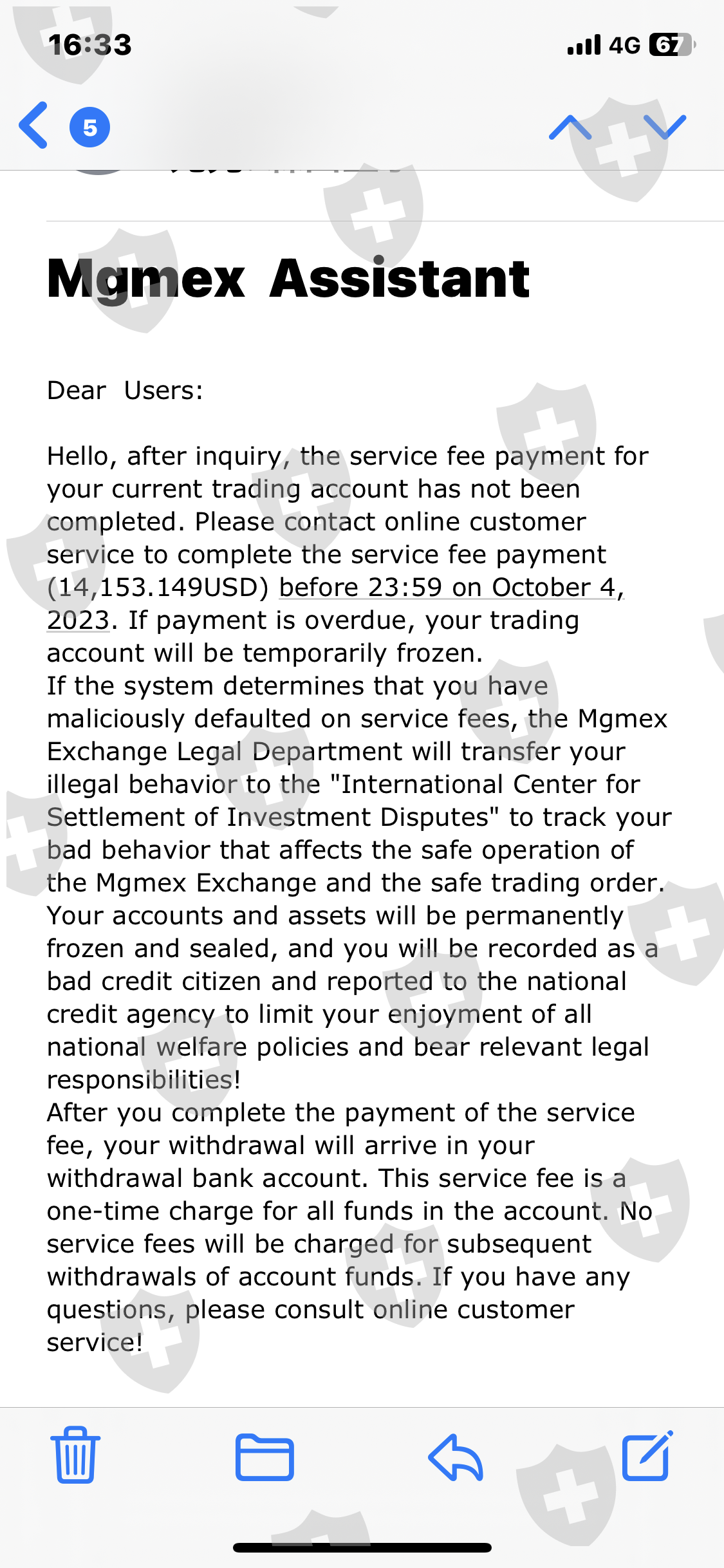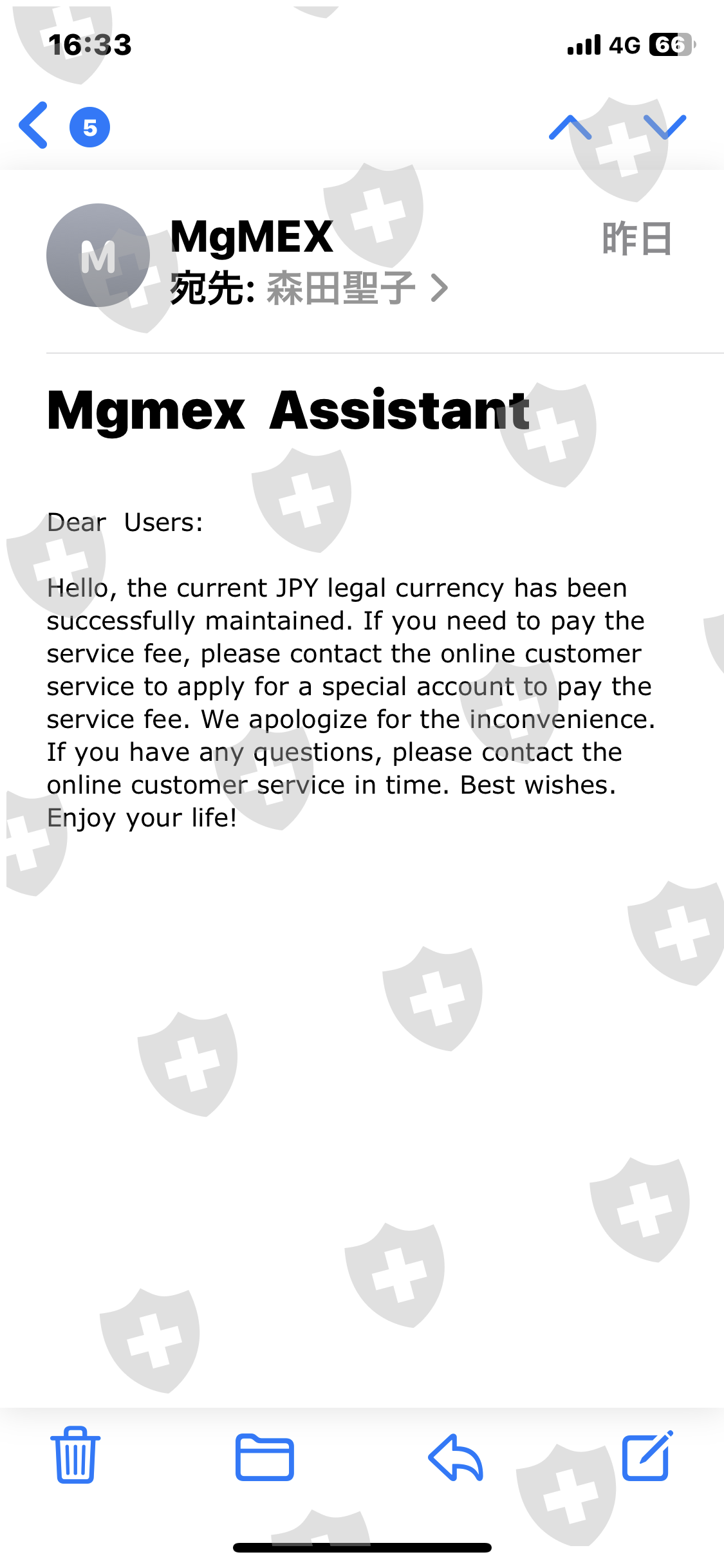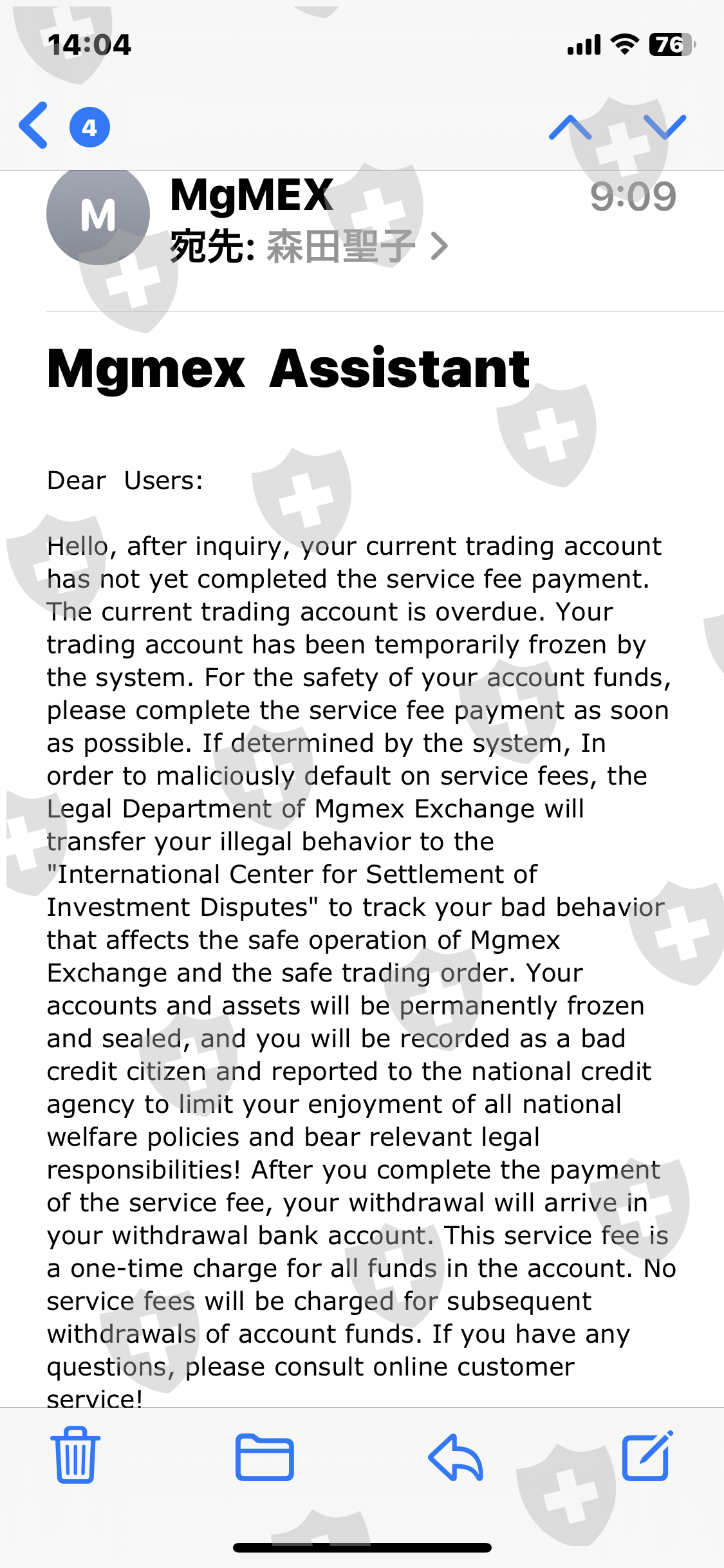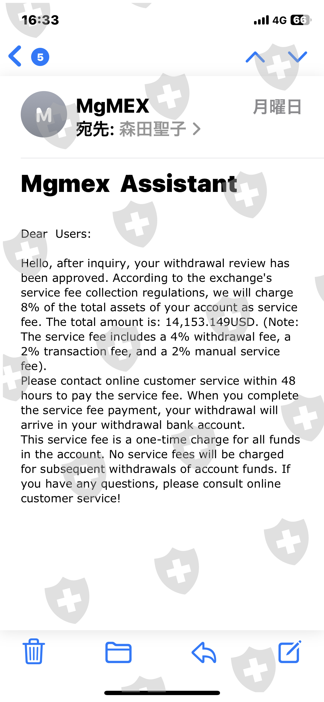 我安装了该应用程序,出示了我的 ID,并开设了一个帐户。根据客服提示多次存入您的个人账户。我在数十笔交易中获利。当我要求全额提款时,我被要求在3天内支付20%的服务费。由于无法付款,我要求他们停止提款,但已经批准了。如果3天内不付款,就会被冻结。该交易是按照自称韩国人的汉克在 LINE 上的指示进行的。损失总额为 950 万日元。