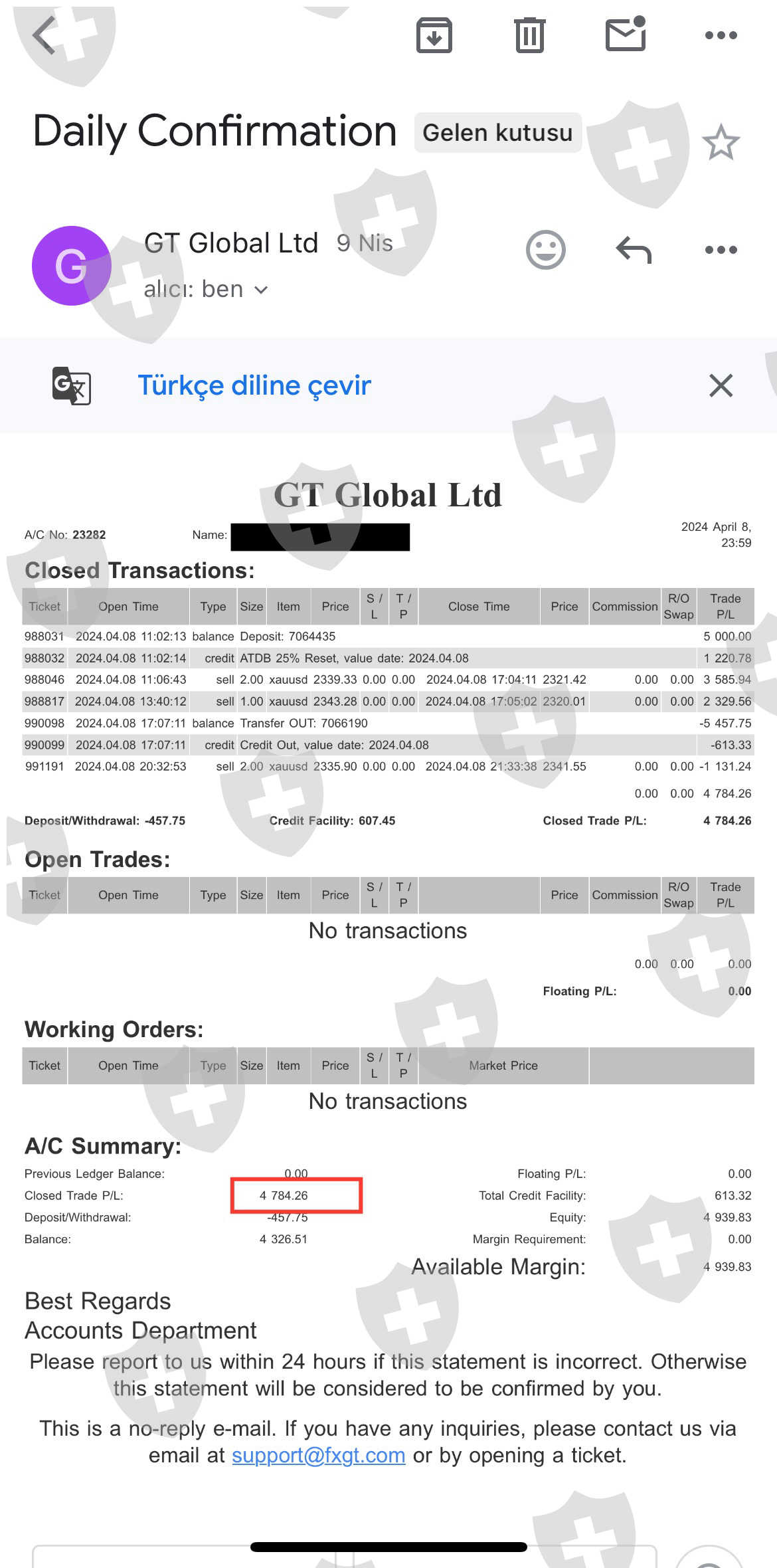 我已经用 Fxgt 很长一段时间了,大部分时间我都是亏的。 我出金很多次,但入金更多。 上周他们认为我恶意交易黄金,并没收了我的 4784 美元。 在我最后一次投资之前,即 2024 年 4 月 8 日,我在以同样的方式交易黄金时把钱亏完了。 然后我又投资了,盈利了。 当我想取钱时,他们就标记为恶意交易。 当我亏的时候,他们就不说话,但是当我盈利的时候,就有问题。 这家公司是故意的,当你赚很多钱时,他们会阻止你,并且不出金。 一定要远离!!!