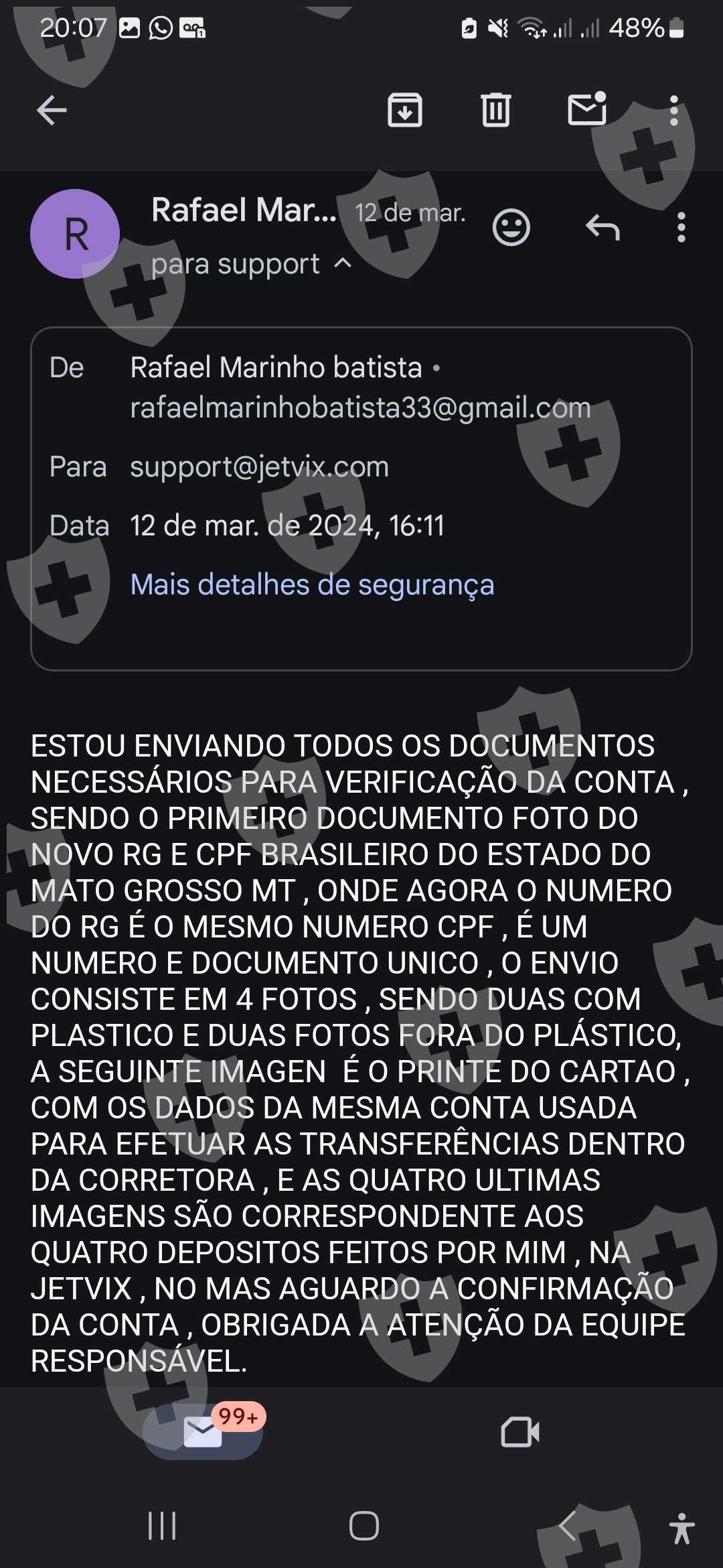 A meses venho tentando retirar meus lucros , mas a corretora não permite a retirada diante do Bom desempenho do trader , fasem impedimento da retirada dos fundos pertencentes ao trader , com a desculpa da conta estar em analize , tenho todos os printes comprovando tudo , tantos que não cabem em 50 e-mails enviados mas vou postar algum , eles excederam o prazo de análise conforme.o.contrato oferecido pela própria JETVIX sendo ele de 7 dias para analize podendo chegar até 14 , mas eles ja aviam aprovaram minha conta e a cerificaram mas depois , disseram que ia passar pela analize de ate 14 dias pelo tecnico anti fraude , me digam alguem consegue alterar o valor do bitcoin ou intervir no mesmo? Pois é nao tem como fraudar bons resultados, e isto já a meses e só retirei o investimento inicial , depois colocaram minha conta sem botão de saque , após eu tentar faser uma retirada a descrita no printe , estão agindo como bandidos, presciso de ajuda.