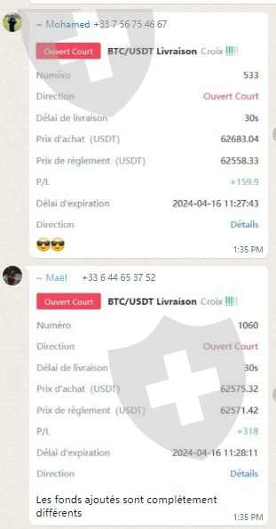 坦率地说,外汇市场把人们当傻瓜!他们会向你发送大量有关所谓超短期 BTC 期权交易的 WhatsApp 消息,并附有屏幕截图,显示一分钟甚至更短的时间就赢得了 4 或 5 位数的金额。为此,他们使用英国的所谓号码,但所有客户都位于法国。重大嫌疑指标:法国手机一开始就拥有几乎所有相同的号码,就像从同一家商店的同一运营商批量购买的一次性手机一样。他们的一些快乐的客户甚至有盎格鲁撒克逊名字只是为了让它变得严肃,但拥有同系列的手机!为了注册他们的恶作剧,他们提供了一个网站的链接,我没有冒险尝试该网站,但他们承诺我们将帮助新交易者满足预期奇迹的必要条件!由于所使用的程序,我认为这是诈骗者甚至网络钓鱼的一个很好的例子。我们真的需要逃离这些人。