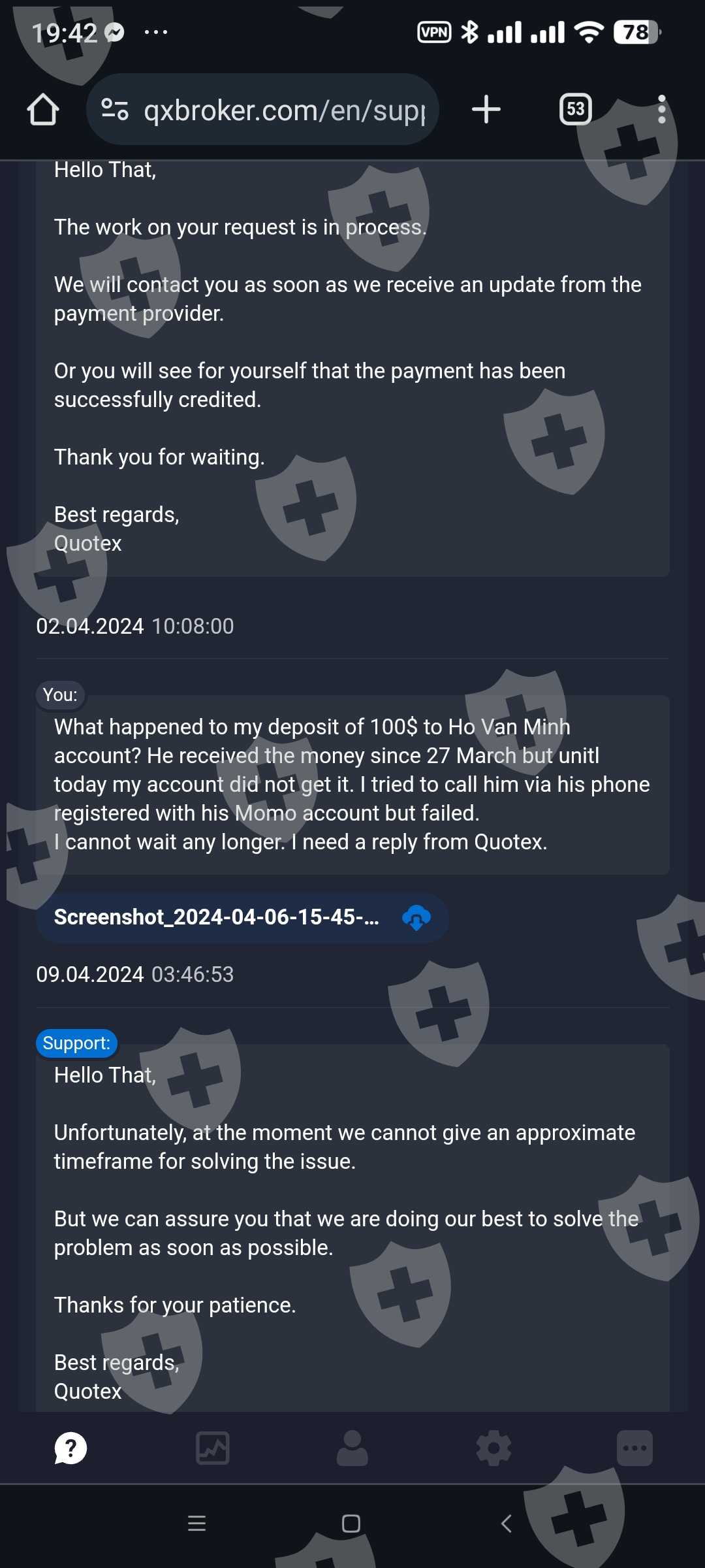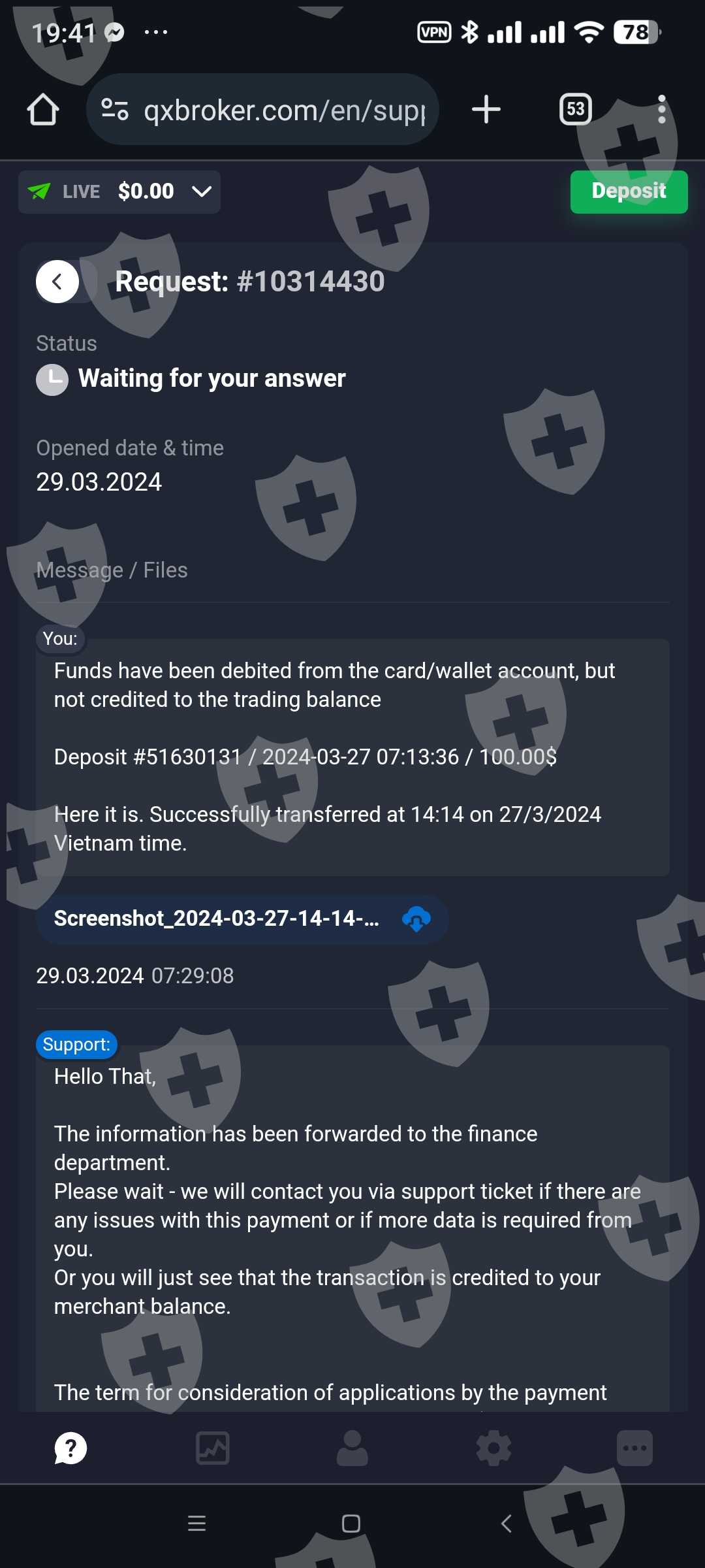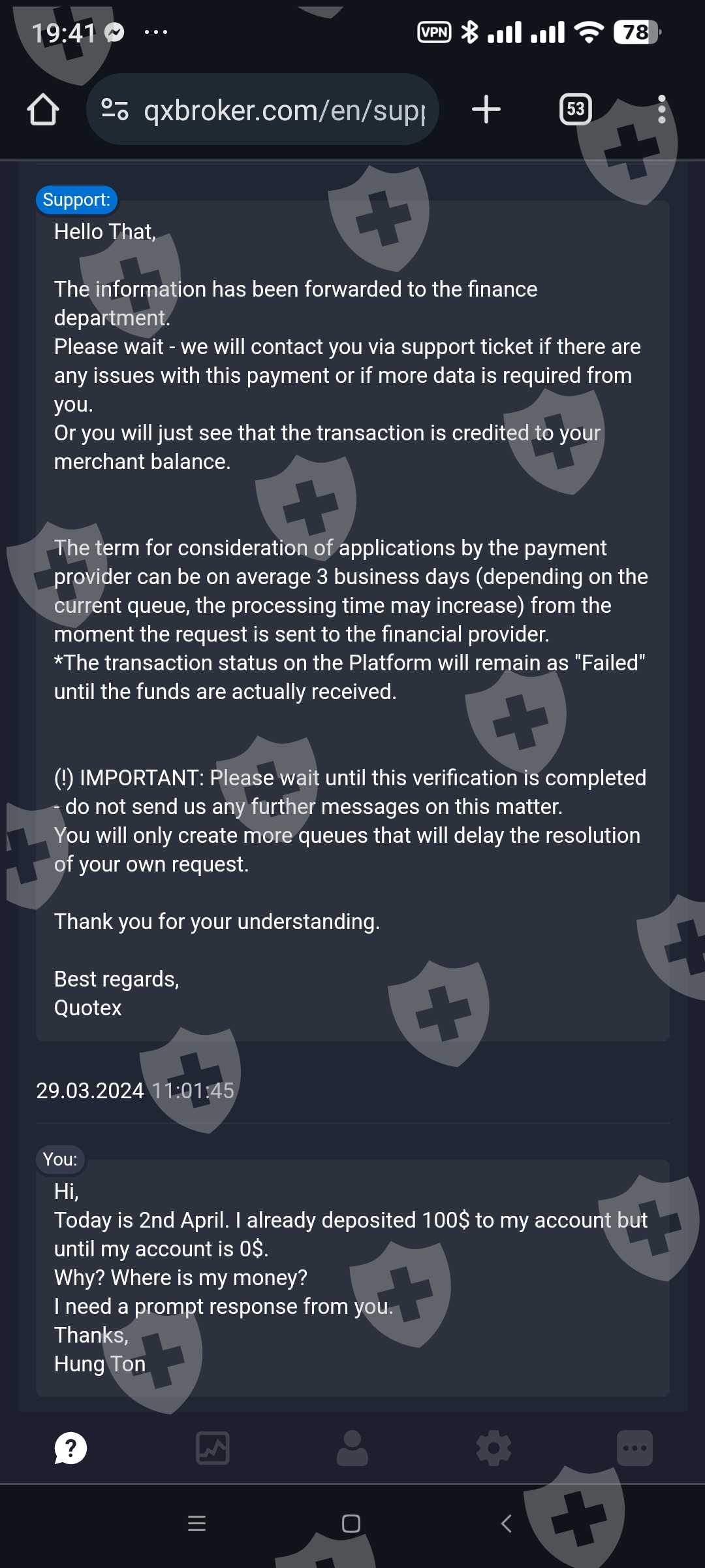 资金已从我的钱包账户中扣除,但未进入Quotex 交易账户 存款 #51630131 / 2024-03-27 07:13:36 / 100.00$ 已于 27/3/2024 14:14 成功转账。3 月27,我在 Quotex 网站上存入 100 美元到我的账户。 收件人是 Quotex的胡文明。 但到现在我的账户金额还是0。 我的钱在 Quotex哪里? Quotex必须对此承担全部责任。 Quotex说一旦金融提供商有最新消息他们会联系我,告诉我不要干涉!? 但直到今天4月20日他们还没有联系我。 这是 Quotex 第三次欺骗我。 去年,我向我的 Quotex 账户存入了两次 50 美元,但同样的情况,我的账户是 0 美元。