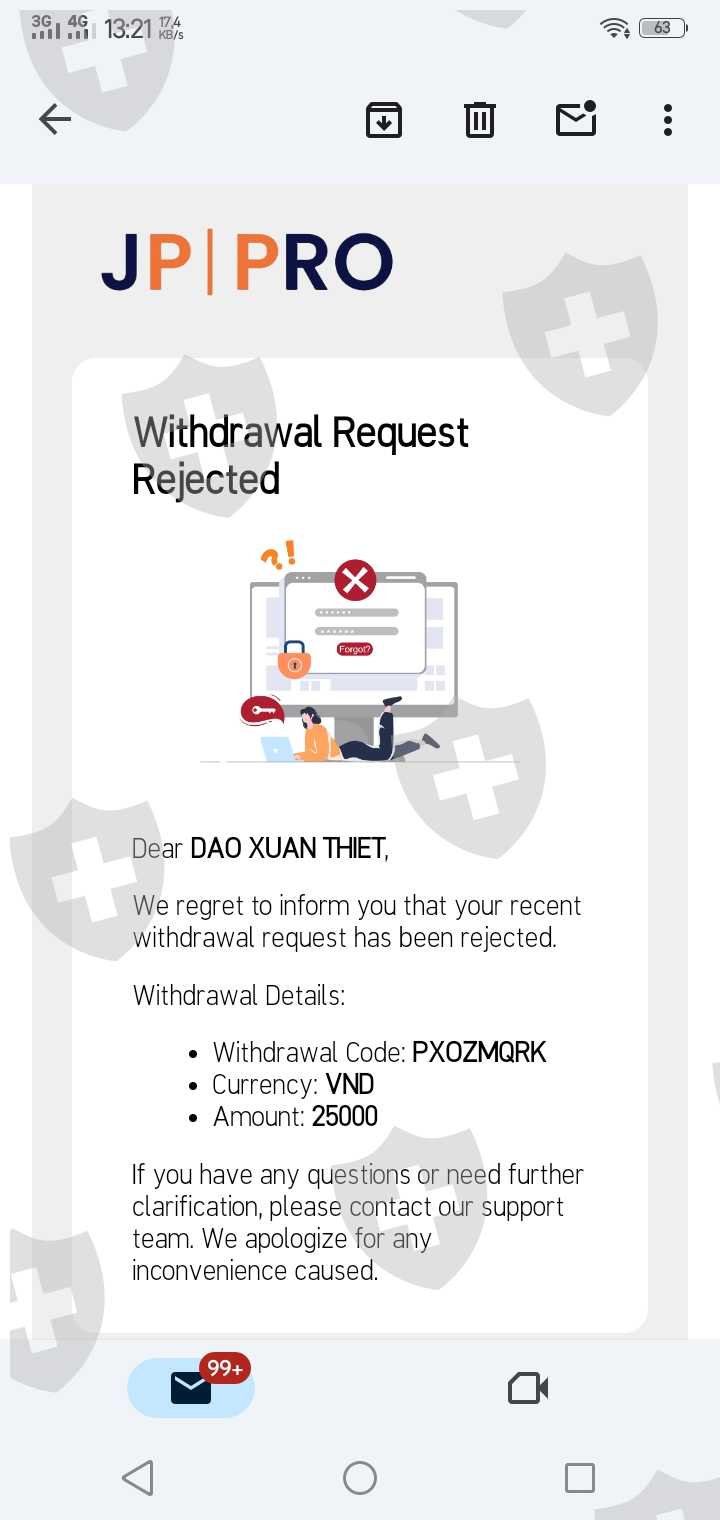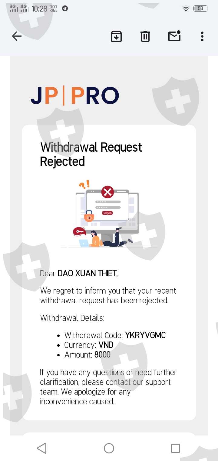 致jprro地板,jppro.com诈骗了我,在mt5账户中挪用了我的钱:401585,该地板没有道德,我正在向国际和越南的警察和金融机构举报这种欺诈行为。操纵mt5价格,欺骗客户;为了杜绝在越南无法经营、挪用客户资金的不道德行为,楼层在我提款时故意取消了提款单,比如有一笔8000usd、25000usd的提款单。.楼层取消了并且没有允许提款。允许场内工作人员进行干扰,对交易客户造成损害。 jppro交易所的总机号码为1900299226。这一事件已经尽一切努力使jppro不再在越南运营。