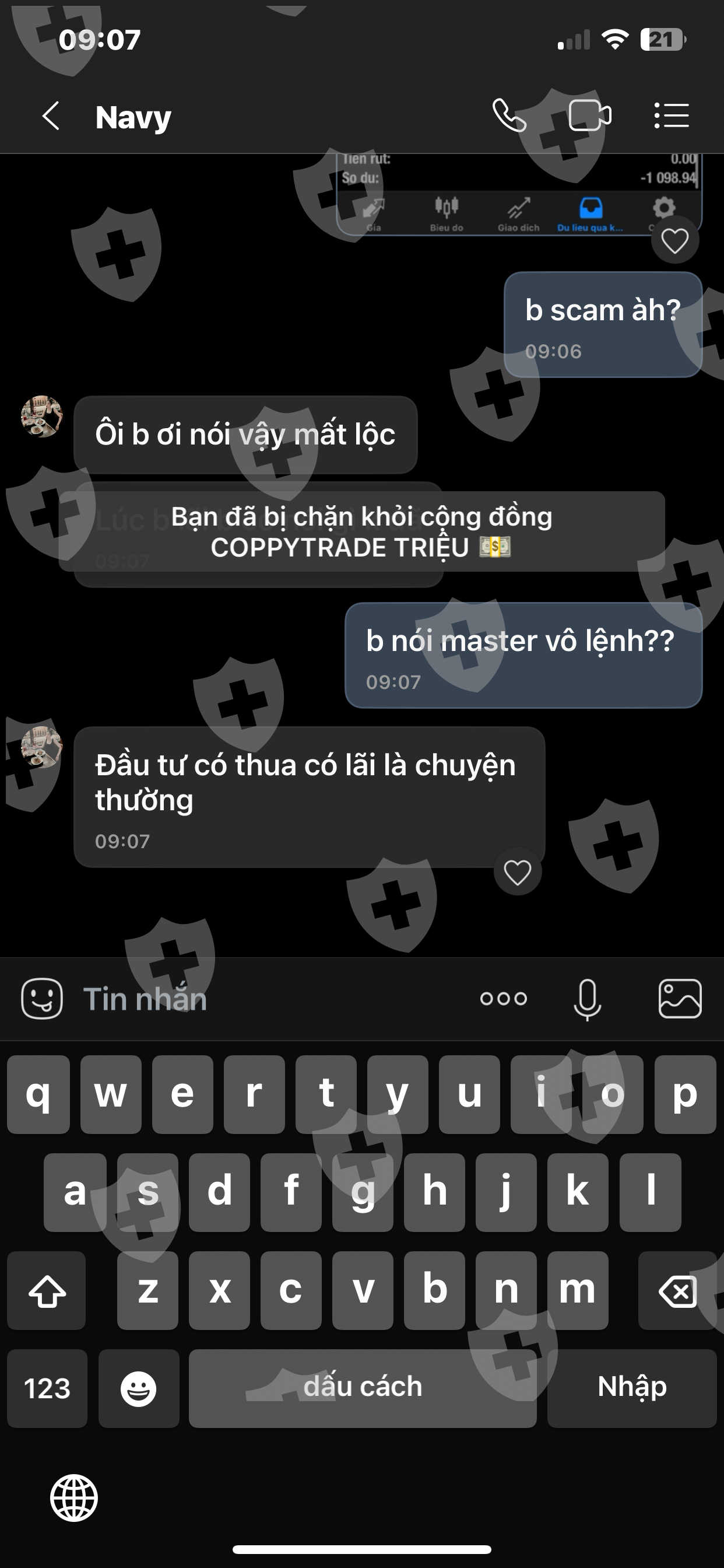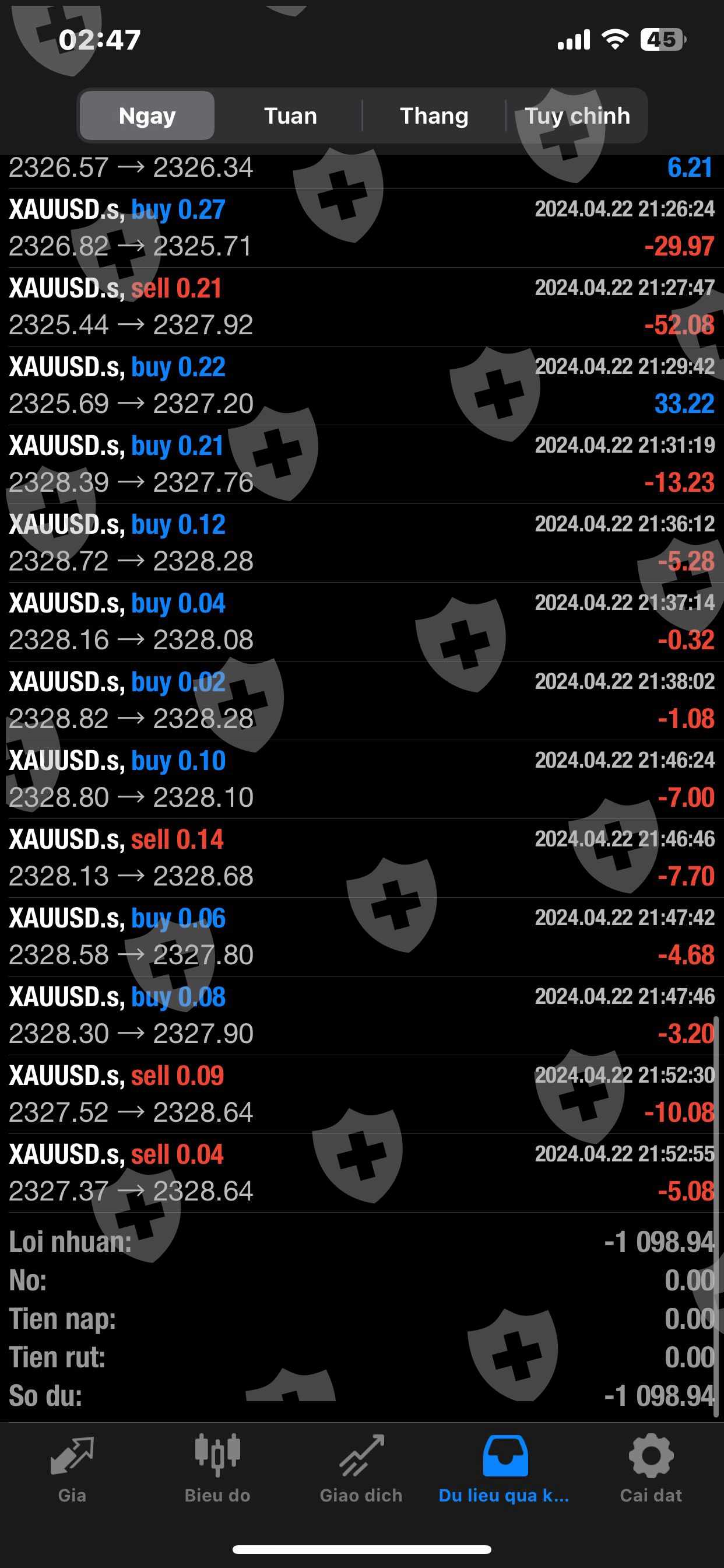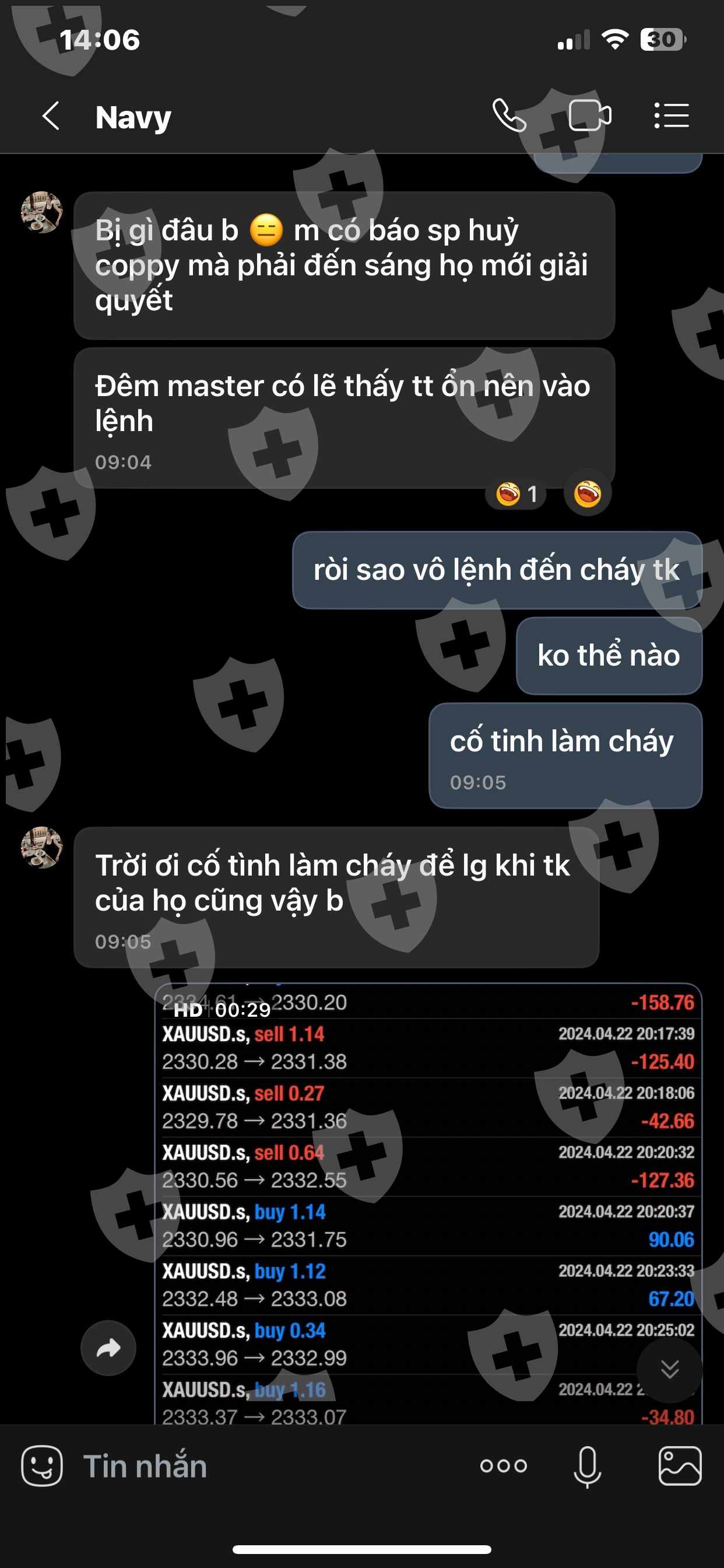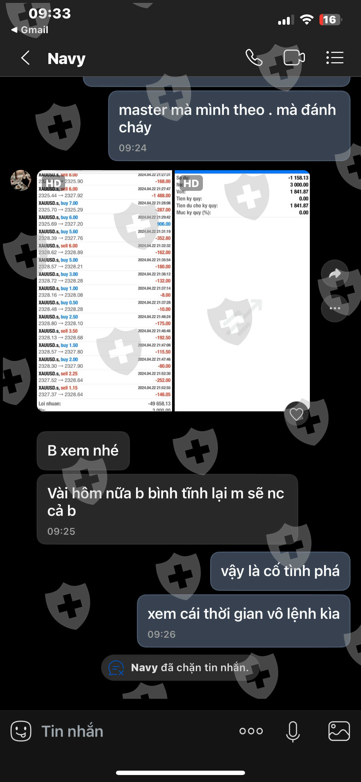Tiếp theo là khuya hôm đó Master cố tình đánh nhồi lệnh TK mình. Mình nhấn mạnh cố tình vì SP có thể xem thời gian vô lệnh (1phút đặt 5lot). Mình có liên lạc với master khuya hôm đó và không nhận được phản hồi, đến qua sáng hôm sau ngày 23/4. Master đã phản hồi với 1 câu là vì mình rút vốn và master ko đồng ý và sau đó đã chặn mình.