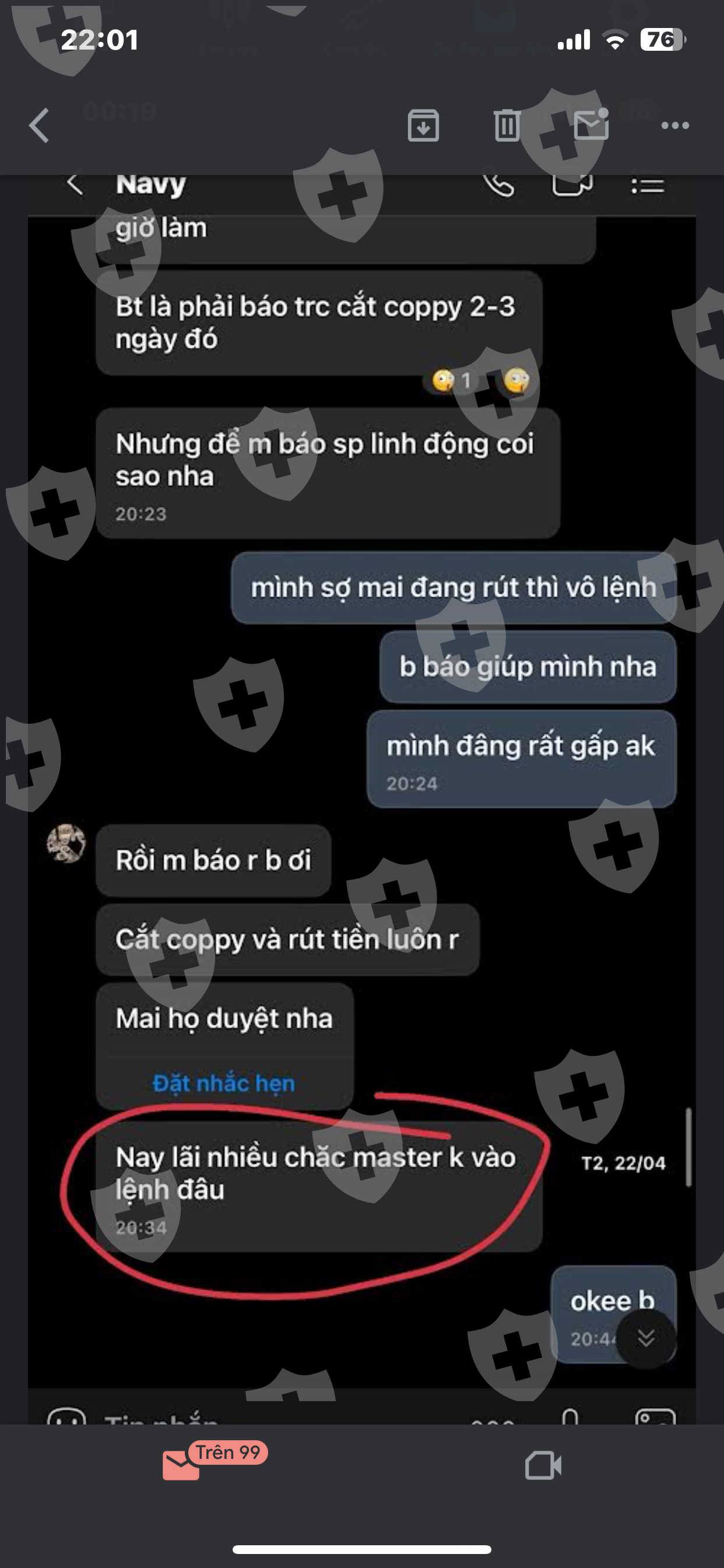 Sau khi copy của Master 635814 được vài ngày bên sàn Lion. Thì ngày 22/4 mình có thông báo với master mình muốn rút và tắt copy vì có việc đột xuất cần sử dụng vốn. Master đã phản hồi và đồng ý (Mình xin up ảnh dưới đây)